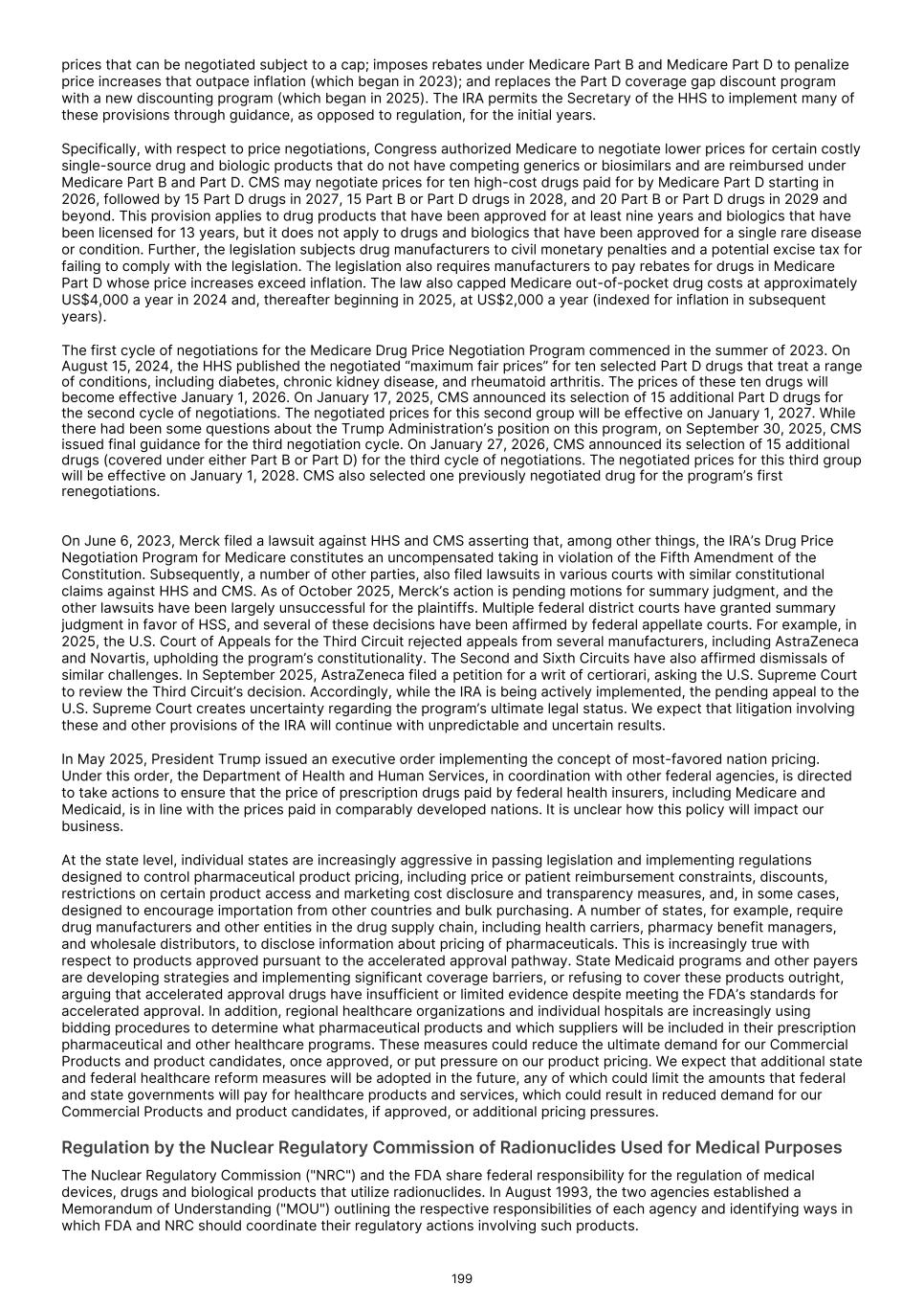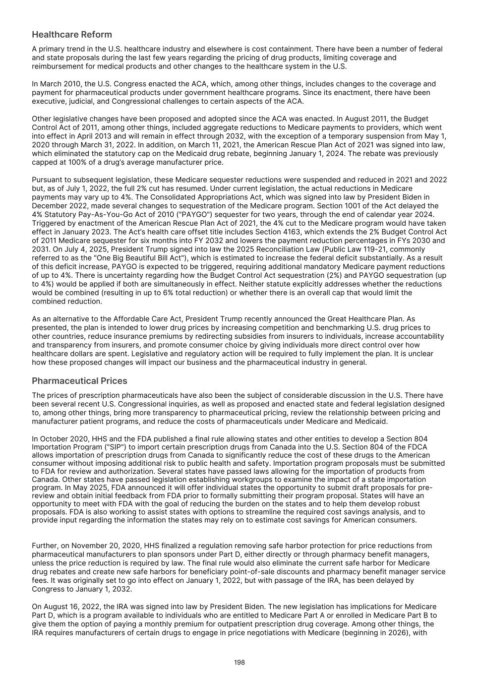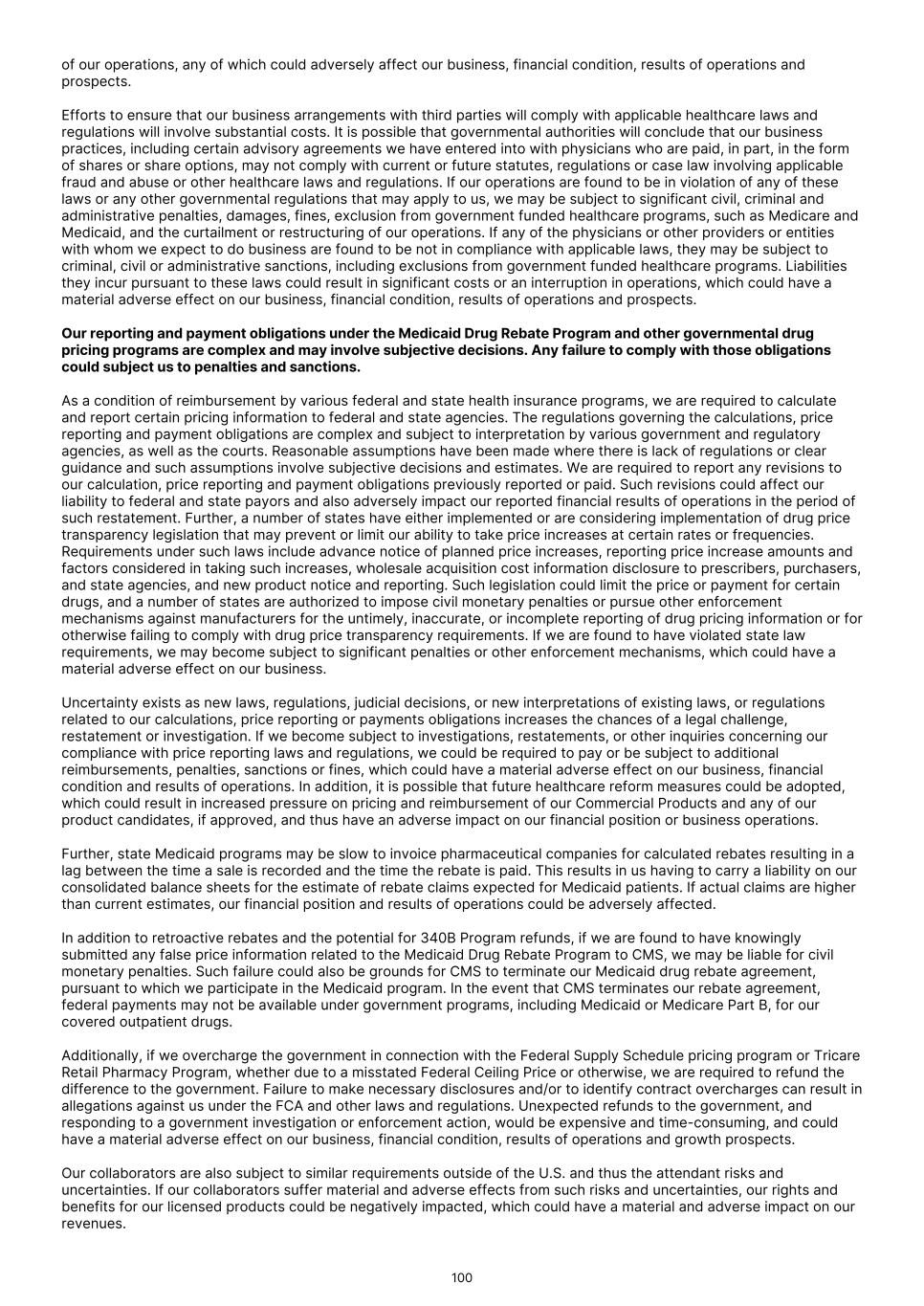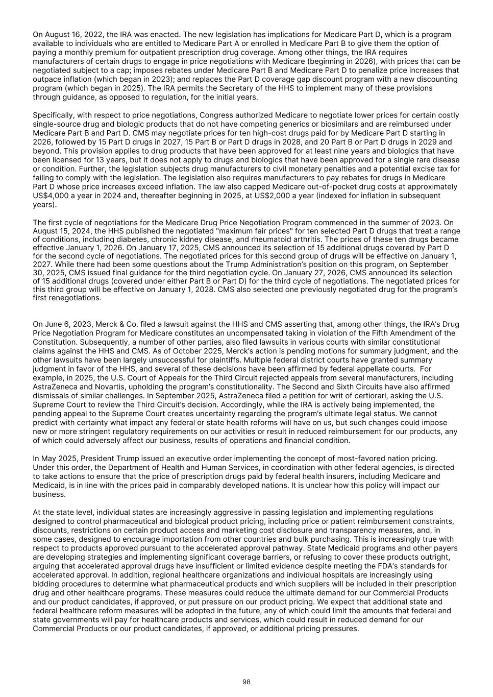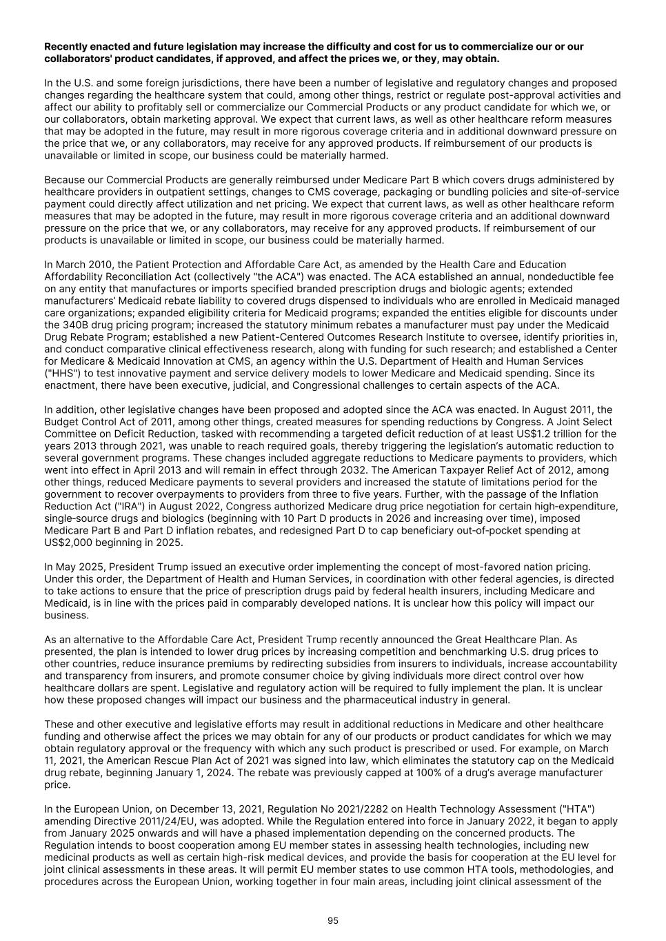 Recently enacted and future legislation may increase the difficulty and cost for us to commercialize our or our collaborators' product candidates, if approved, and affect the prices we, or they, may obtain. In the U.S. and some foreign jurisdictions, there have been a number of legislative and regulatory changes and proposed changes regarding the healthcare system that could, among other things, restrict or regulate post-approval activities and affect our ability to profitably sell or commercialize our Commercial Products or any product candidate for which we, or our collaborators, obtain marketing approval. We expect that current laws, as well as other healthcare reform measures that may be adopted in the future, may result in more rigorous coverage criteria and in additional downward pressure on the price that we, or any collaborators, may receive for any approved products. If reimbursement of our products is unavailable or limited in scope, our business could be materially harmed. Because our Commercial Products are generally reimbursed under Medicare Part B which covers drugs administered by healthcare providers in outpatient settings, changes to CMS coverage, packaging or bundling policies and site‑of‑service payment could directly affect utilization and net pricing. We expect that current laws, as well as other healthcare reform measures that may be adopted in the future, may result in more rigorous coverage criteria and an additional downward pressure on the price that we, or any collaborators, may receive for any approved products. If reimbursement of our products is unavailable or limited in scope, our business could be materially harmed. In March 2010, the Patient Protection and Affordable Care Act, as amended by the Health Care and Education Affordability Reconciliation Act (collectively "the ACA") was enacted. The ACA established an annual, nondeductible fee on any entity that manufactures or imports specified branded prescription drugs and biologic agents; extended manufacturers’ Medicaid rebate liability to covered drugs dispensed to individuals who are enrolled in Medicaid managed care organizations; expanded eligibility criteria for Medicaid programs; expanded the entities eligible for discounts under the 340B drug pricing program; increased the statutory minimum rebates a manufacturer must pay under the Medicaid Drug Rebate Program; established a new Patient-Centered Outcomes Research Institute to oversee, identify priorities in, and conduct comparative clinical effectiveness research, along with funding for such research; and established a Center for Medicare & Medicaid Innovation at CMS, an agency within the U.S. Department of Health and Human Services ("HHS") to test innovative payment and service delivery models to lower Medicare and Medicaid spending. Since its enactment, there have been executive, judicial, and Congressional challenges to certain aspects of the ACA. In addition, other legislative changes have been proposed and adopted since the ACA was enacted. In August 2011, the Budget Control Act of 2011, among other things, created measures for spending reductions by Congress. A Joint Select Committee on Deficit Reduction, tasked with recommending a targeted deficit reduction of at least US$1.2 trillion for the years 2013 through 2021, was unable to reach required goals, thereby triggering the legislation’s automatic reduction to several government programs. These changes included aggregate reductions to Medicare payments to providers, which went into effect in April 2013 and will remain in effect through 2032. The American Taxpayer Relief Act of 2012, among other things, reduced Medicare payments to several providers and increased the statute of limitations period for the government to recover overpayments to providers from three to five years. Further, with the passage of the Inflation Reduction Act ("IRA") in August 2022, Congress authorized Medicare drug price negotiation for certain high‑expenditure, single‑source drugs and biologics (beginning with 10 Part D products in 2026 and increasing over time), imposed Medicare Part B and Part D inflation rebates, and redesigned Part D to cap beneficiary out‑of‑pocket spending at US$2,000 beginning in 2025. In May 2025, President Trump issued an executive order implementing the concept of most-favored nation pricing. Under this order, the Department of Health and Human Services, in coordination with other federal agencies, is directed to take actions to ensure that the price of prescription drugs paid by federal health insurers, including Medicare and Medicaid, is in line with the prices paid in comparably developed nations. It is unclear how this policy will impact our business. As an alternative to the Affordable Care Act, President Trump recently announced the Great Healthcare Plan. As presented, the plan is intended to lower drug prices by increasing competition and benchmarking U.S. drug prices to other countries, reduce insurance premiums by redirecting subsidies from insurers to individuals, increase accountability and transparency from insurers, and promote consumer choice by giving individuals more direct control over how healthcare dollars are spent. Legislative and regulatory action will be required to fully implement the plan. It is unclear how these proposed changes will impact our business and the pharmaceutical industry in general. These and other executive and legislative efforts may result in additional reductions in Medicare and other healthcare funding and otherwise affect the prices we may obtain for any of our products or product candidates for which we may obtain regulatory approval or the frequency with which any such product is prescribed or used. For example, on March 11, 2021, the American Rescue Plan Act of 2021 was signed into law, which eliminates the statutory cap on the Medicaid drug rebate, beginning January 1, 2024. The rebate was previously capped at 100% of a drug