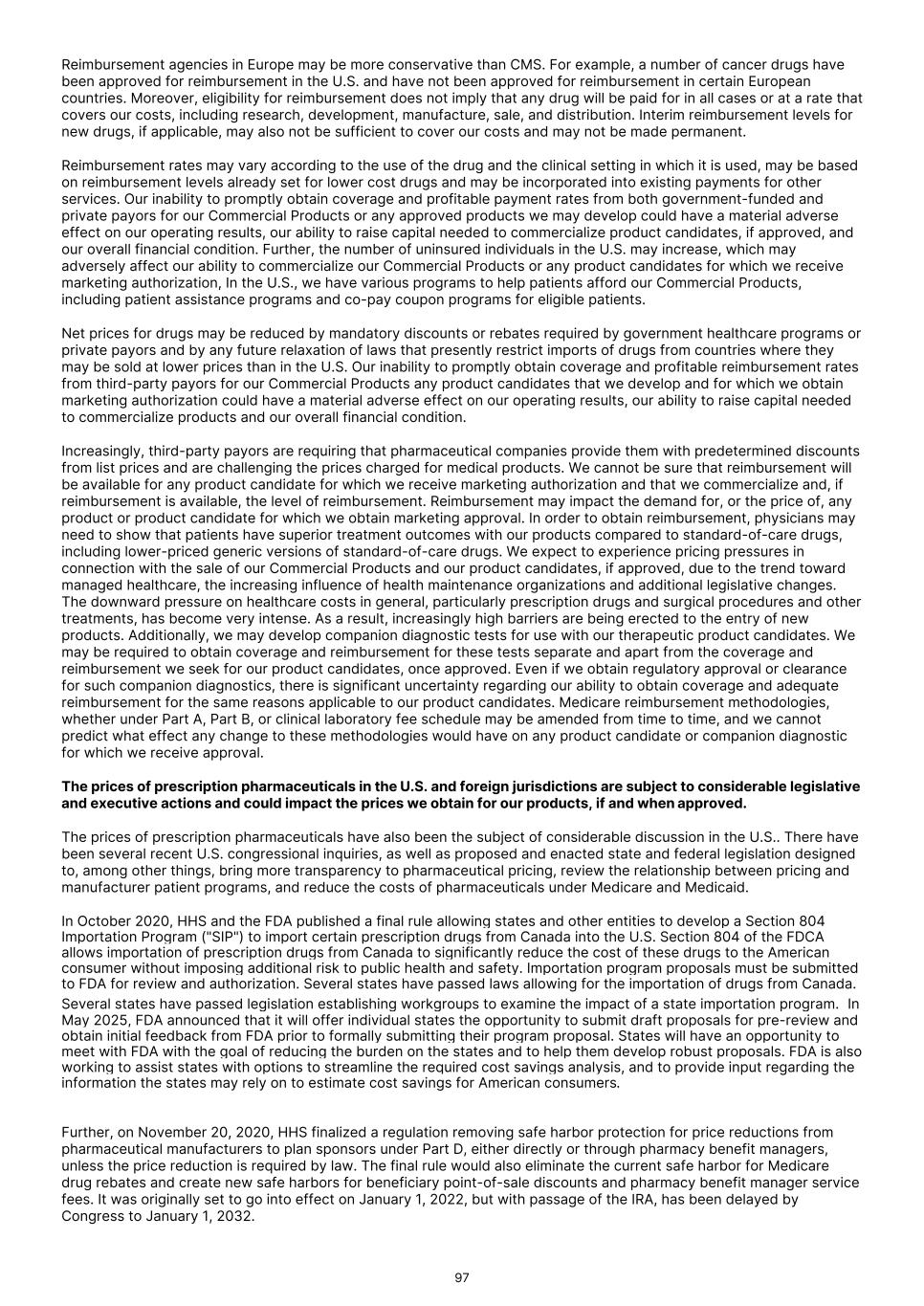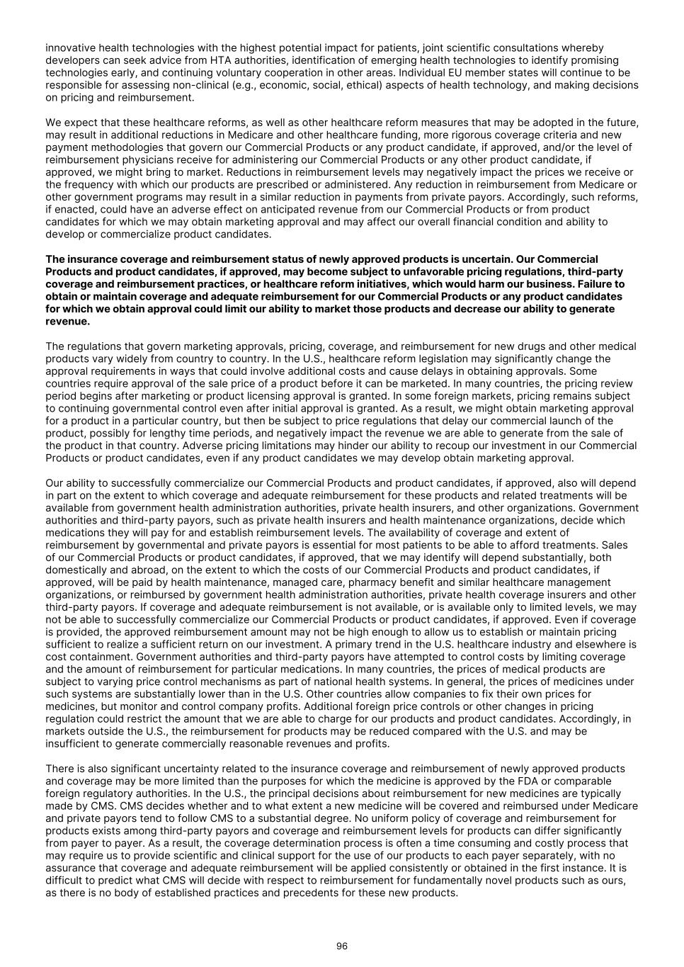 innovative health technologies with the highest potential impact for patients, joint scientific consultations whereby developers can seek advice from HTA authorities, identification of emerging health technologies to identify promising technologies early, and continuing voluntary cooperation in other areas. Individual EU member states will continue to be responsible for assessing non-clinical (e.g., economic, social, ethical) aspects of health technology, and making decisions on pricing and reimbursement. We expect that these healthcare reforms, as well as other healthcare reform measures that may be adopted in the future, may result in additional reductions in Medicare and other healthcare funding, more rigorous coverage criteria and new payment methodologies that govern our Commercial Products or any product candidate, if approved, and/or the level of reimbursement physicians receive for administering our Commercial Products or any other product candidate, if approved, we might bring to market. Reductions in reimbursement levels may negatively impact the prices we receive or the frequency with which our products are prescribed or administered. Any reduction in reimbursement from Medicare or other government programs may result in a similar reduction in payments from private payors. Accordingly, such reforms, if enacted, could have an adverse effect on anticipated revenue from our Commercial Products or from product candidates for which we may obtain marketing approval and may affect our overall financial condition and ability to develop or commercialize product candidates. The insurance coverage and reimbursement status of newly approved products is uncertain. Our Commercial Products and product candidates, if approved, may become subject to unfavorable pricing regulations, third-party coverage and reimbursement practices, or healthcare reform initiatives, which would harm our business. Failure to obtain or maintain coverage and adequate reimbursement for our Commercial Products or any product candidates for which we obtain approval could limit our ability to market those products and decrease our ability to generate revenue. The regulations that govern marketing approvals, pricing, coverage, and reimbursement for new drugs and other medical products vary widely from country to country. In the U.S., healthcare reform legislation may significantly change the approval requirements in ways that could involve additional costs and cause delays in obtaining approvals. Some countries require approval of the sale price of a product before it can be marketed. In many countries, the pricing review period begins after marketing or product licensing approval is granted. In some foreign markets, pricing remains subject to continuing governmental control even after initial approval is granted. As a result, we might obtain marketing approval for a product in a particular country, but then be subject to price regulations that delay our commercial launch of the product, possibly for lengthy time periods, and negatively impact the revenue we are able to generate from the sale of the product in that country. Adverse pricing limitations may hinder our ability to recoup our investment in our Commercial Products or product candidates, even if any product candidates we may develop obtain marketing approval. Our ability to successfully commercialize our Commercial Products and product candidates, if approved, also will depend in part on the extent to which coverage and adequate reimbursement for these products and related treatments will be available from government health administration authorities, private health insurers, and other organizations. Government authorities and third-party payors, such as private health insurers and health maintenance organizations, decide which medications they will pay for and establish reimbursement levels. The availability of coverage and extent of reimbursement by governmental and private payors is essential for most patients to be able to afford treatments. Sales of our Commercial Products or product candidates, if approved, that we may identify will depend substantially, both domestically and abroad, on the extent to which the costs of our Commercial Products and product candidates, if approved, will be paid by health maintenance, managed care, pharmacy benefit and similar healthcare management organizations, or reimbursed by government health administration authorities, private health coverage insurers and other third-party payors. If coverage and adequate reimbursement is not available, or is available only to limited levels, we may not be able to successfully commercialize our Commercial Products or product candidates, if approved. Even if coverage is provided, the approved reimbursement amount may not be high enough to allow us to establish or maintain pricing sufficient to realize a sufficient return on our investment. A primary trend in the U.S. healthcare industry and elsewhere is cost containment. Government authorities and third-party payors have attempted to control costs by limiting coverage and the amount of reimbursement for particular medications. In many countries, the prices of medical products are subject to varying price control mechanisms as part of national health systems. In general, the prices of medicines under such systems are substantially lower than in the U.S. Other countries allow companies to fix their own prices for medicines, but monitor and control company profits. Additional foreign price controls or other changes in pricing regulation could restrict the amount that we are able to charge for our products and product candidates. Accordingly, in markets outside the U.S., the reimbursement for products may be reduced compared with the U.S. and may be insufficient to generate commercially reasonable revenues and profits. There is also significant uncertainty related to the insurance coverage and reimbursement of newly approved products and co