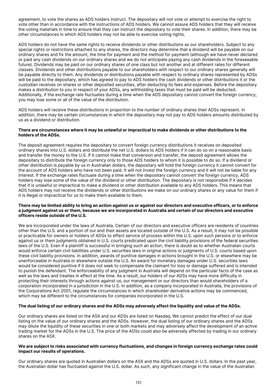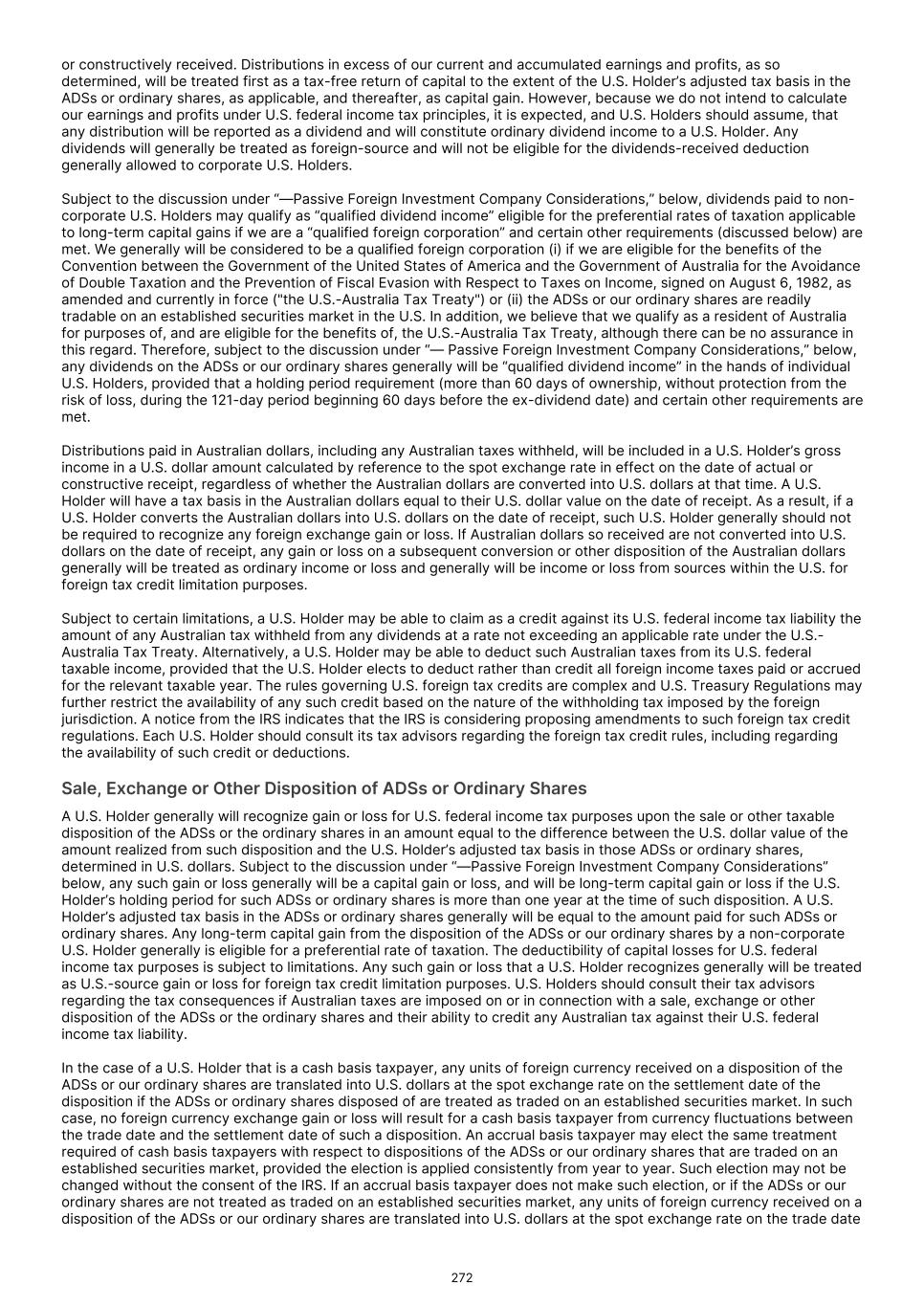or constructively received. Distributions in excess of our current and accumulated earnings and profits, as so determined, will be treated first as a tax-free return of capital to the extent of the U.S. Holder’s adjusted tax basis in the ADSs or ordinary shares, as applicable, and thereafter, as capital gain. However, because we do not intend to calculate our earnings and profits under U.S. federal income tax principles, it is expected, and U.S. Holders should assume, that any distribution will be reported as a dividend and will constitute ordinary dividend income to a U.S. Holder. Any dividends will generally be treated as foreign-source and will not be eligible for the dividends-received deduction generally allowed to corporate U.S. Holders. Subject to the discussion under “—Passive Foreign Investment Company Considerations,” below, dividends paid to non- corporate U.S. Holders may qualify as “qualified dividend income” eligible for the preferential rates of taxation applicable to long-term capital gains if we are a “qualified foreign corporation” and certain other requirements (discussed below) are met. We generally will be considered to be a qualified foreign corporation (i) if we are eligible for the benefits of the Convention between the Government of the United States of America and the Government of Australia for the Avoidance of Double Taxation and the Prevention of Fiscal Evasion with Respect to Taxes on Income, signed on August 6, 1982, as amended and currently in force ("the U.S.-Australia Tax Treaty") or (ii) the ADSs or our ordinary shares are readily tradable on an established securities market in the U.S. In addition, we believe that we qualify as a resident of Australia for purposes of, and are eligible for the benefits of, the U.S.-Australia Tax Treaty, although there can be no assurance in this regard. Therefore, subject to the discussion under “— Passive Foreign Investment Company Considerations,” below, any dividends on the ADSs or our ordinary shares generally will be “qualified dividend income” in the hands of individual U.S. Holders, provided that a holding period requirement (more than 60 days of ownership, without protection from the risk of loss, during the 121-day period beginning 60 days before the ex-dividend date) and certain other requirements are met. Distributions paid in Australian dollars, including any Australian taxes withheld, will be included in a U.S. Holder’s gross income in a U.S. dollar amount calculated by reference to the spot exchange rate in effect on the date of actual or constructive receipt, regardless of whether the Australian dollars are converted into U.S. dollars at that time. A U.S. Holder will have a tax basis in the Australian dollars equal to their U.S. dollar value on the date of receipt. As a result, if a U.S. Holder converts the Australian dollars into U.S. dollars on the date of receipt, such U.S. Holder generally should not be required to recognize any foreign exchange gain or loss. If Australian dollars so received are not converted into U.S. dollars on the date of receipt, any gain or loss on a subsequent conversion or other disposition of the Australian dollars generally will be treated as ordinary income or loss and generally will be income or loss from sources within the U.S. for foreign tax credit limitation purposes. Subject to certain limitations, a U.S. Holder may be able to claim as a credit against its U.S. federal income tax liability the amount of any Australian tax withheld from any dividends at a rate not exceeding an applicable rate under the U.S.- Australia Tax Treaty. Alternatively, a U.S. Holder may be able to deduct such Australian taxes from its U.S. federal taxable income, provided that the U.S. Holder elects to deduct rather than credit all foreign income taxes paid or accrued for the relevant taxable year. The rules governing U.S. foreign tax credits are complex and U.S. Treasury Regulations may further restrict the availability of any such credit based on the nature of the withholding tax imposed by the foreign jurisdiction. A notice from the IRS indicates that the IRS is considering proposing amendments to such foreign tax credit regulations. Each U.S. Holder should consult its tax advisors regarding the foreign tax credit rules, including regarding the availability of such credit or deductions. Sale, Exchange or Other Disposition of ADSs or Ordinary Shares A U.S. Holder generally will recognize gain or loss for U.S. federal income tax purposes upon the sale or other taxable disposition of the ADSs or the ordinary shares in an amount equal to the difference between the U.S. dollar value of the amount realized from such disposition and the U.S. Holder’s adjusted tax basis in those ADSs or ordinary shares, determined in U.S. dollars. Subject to the discussion under “—Passive Foreign Investment Company Considerations” below, any such gain or loss generally will be a capital gain or loss, and will be long-term capital gain or loss if the U.S. Holder’s holding period for such ADSs or ordinary shares is more than one year at the time of such disposition. A U.S. Holder’s adjusted tax basis in the ADSs or ordinary shares generally will be equal to the amount paid for such ADSs or ordinary shares. Any long-term capital gain from the disposition of the ADSs or our ordinary shares by a non-corporate U.S. Holder generally is eligible for a preferential rate of taxation. The deductibility of capital losses for U.S. federal income tax purposes is subject to limitations. Any such gain or loss that a U.S. Holder recognizes generally will be treated as U.S.-source gain or loss for foreign tax credit limitation purposes. U.S. Holders should consult their tax advisors regarding the tax consequences if Australian taxes are imposed on or in connection with a sale, exchange or other disposition of the ADSs or the ordinary shares and their ability to credit any Australian tax agains