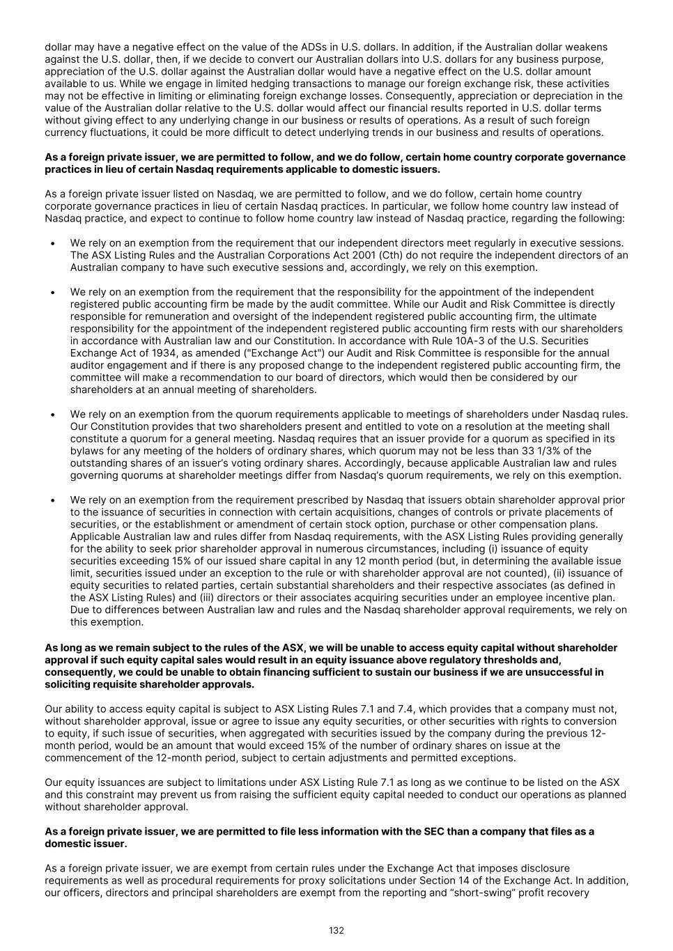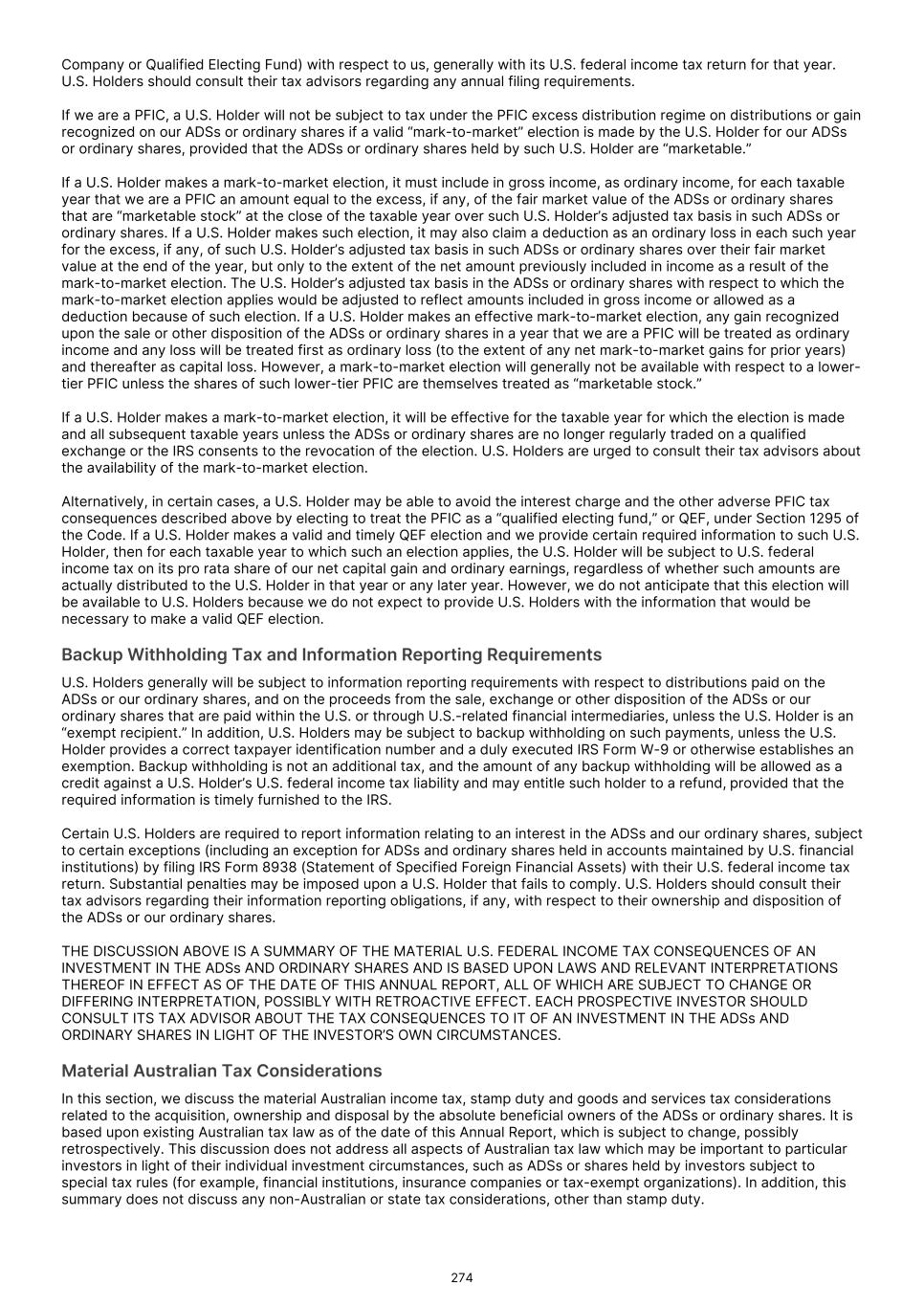 Company or Qualified Electing Fund) with respect to us, generally with its U.S. federal income tax return for that year. U.S. Holders should consult their tax advisors regarding any annual filing requirements. If we are a PFIC, a U.S. Holder will not be subject to tax under the PFIC excess distribution regime on distributions or gain recognized on our ADSs or ordinary shares if a valid “mark-to-market” election is made by the U.S. Holder for our ADSs or ordinary shares, provided that the ADSs or ordinary shares held by such U.S. Holder are “marketable.” If a U.S. Holder makes a mark-to-market election, it must include in gross income, as ordinary income, for each taxable year that we are a PFIC an amount equal to the excess, if any, of the fair market value of the ADSs or ordinary shares that are “marketable stock” at the close of the taxable year over such U.S. Holder’s adjusted tax basis in such ADSs or ordinary shares. If a U.S. Holder makes such election, it may also claim a deduction as an ordinary loss in each such year for the excess, if any, of such U.S. Holder’s adjusted tax basis in such ADSs or ordinary shares over their fair market value at the end of the year, but only to the extent of the net amount previously included in income as a result of the mark-to-market election. The U.S. Holder’s adjusted tax basis in the ADSs or ordinary shares with respect to which the mark-to-market election applies would be adjusted to reflect amounts included in gross income or allowed as a deduction because of such election. If a U.S. Holder makes an effective mark-to-market election, any gain recognized upon the sale or other disposition of the ADSs or ordinary shares in a year that we are a PFIC will be treated as ordinary income and any loss will be treated first as ordinary loss (to the extent of any net mark-to-market gains for prior years) and thereafter as capital loss. However, a mark-to-market election will generally not be available with respect to a lower- tier PFIC unless the shares of such lower-tier PFIC are themselves treated as “marketable stock.” If a U.S. Holder makes a mark-to-market election, it will be effective for the taxable year for which the election is made and all subsequent taxable years unless the ADSs or ordinary shares are no longer regularly traded on a qualified exchange or the IRS consents to the revocation of the election. U.S. Holders are urged to consult their tax advisors about the availability of the mark-to-market election. Alternatively, in certain cases, a U.S. Holder may be able to avoid the interest charge and the other adverse PFIC tax consequences described above by electing to treat the PFIC as a “qualified electing fund,” or QEF, under Section 1295 of the Code. If a U.S. Holder makes a valid and timely QEF election and we provide certain required information to such U.S. Holder, then for each taxable year to which such an election applies, the U.S. Holder will be subject to U.S. federal income tax on its pro rata share of our net capital gain and ordinary earnings, regardless of whether such amounts are actually distributed to the U.S. Holder in that year or any later year. However, we do not anticipate that this election will be available to U.S. Holders because we do not expect to provide U.S. Holders with the information that would be necessary to make a valid QEF election. Backup Withholding Tax and Information Reporting Requirements U.S. Holders generally will be subject to information reporting requirements with respect to distributions paid on the ADSs or our ordinary shares, and on the proceeds from the sale, exchange or other disposition of the ADSs or our ordinary shares that are paid within the U.S. or through U.S.-related financial intermediaries, unless the U.S. Holder is an “exempt recipient.” In addition, U.S. Holders may be subject to backup withholding on such payments, unless the U.S. Holder provides a correct taxpayer identification number and a duly executed IRS Form W-9 or otherwise establishes an exemption. Backup withholding is not an additional tax, and the amount of any backup withholding will be allowed as a credit against a U.S. Holder’s U.S. federal income tax liability and may entitle such holder to a refund, provided that the required information is timely furnished to the IRS. Certain U.S. Holders are required to report information relating to an interest in the ADSs and our ordinary shares, subject to certain exceptions (including an exception for ADSs and ordinary shares held in accounts maintained by U.S. financial institutions) by filing IRS Form 8938 (Statement of Specified Foreign Financial Assets) with their U.S. federal income tax return. Substantial penalties may be imposed upon a U.S. Holder that fails to comply. U.S. Holders should consult their tax advisors regarding their information reporting obligations, if any, with respect to their ownership and disposition of the ADSs or our ordinary shares. THE DISCUSSION ABOVE IS A SUMMARY OF THE MATERIAL U.S. FEDERAL INCOME TAX CONSEQUENCES OF AN INVESTMENT IN THE ADSs AND ORDINARY SHARES AND IS BASED UPON LAWS AND RELEVANT INTERPRETATIONS THEREOF IN EFFECT AS OF THE DATE OF THIS ANNUAL REPORT, ALL OF WHICH ARE SUBJECT TO CHANGE OR DIFFERING INTERPRETATION, POSSIBLY WITH RETROACTIVE EFFECT. EACH PROSPECTIVE INVESTOR SHOULD CONSULT ITS TAX ADVISOR ABOUT THE TAX CONSEQUENCES TO IT OF AN INVESTMENT IN THE ADSs AND ORDINARY SHARES IN LIGHT OF THE INVESTOR’S OWN CIRCUMSTANCES. Material Australian Tax Considerations In this section, we discuss the material Australian income tax, stamp duty and goods and services tax considerations related to the acquisition, ownership and disposal by the absolute beneficial owners of the ADSs or ordinary shares. It is based upon existing Australian tax law as of the date of this Annual Report, which is subject to change, possibly retrospectively. This discussion does not address all aspects of Aust