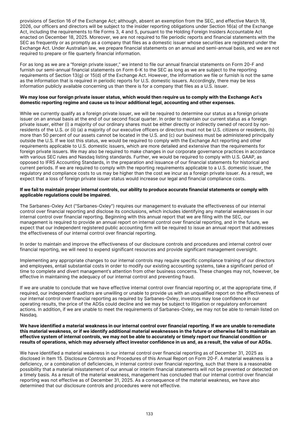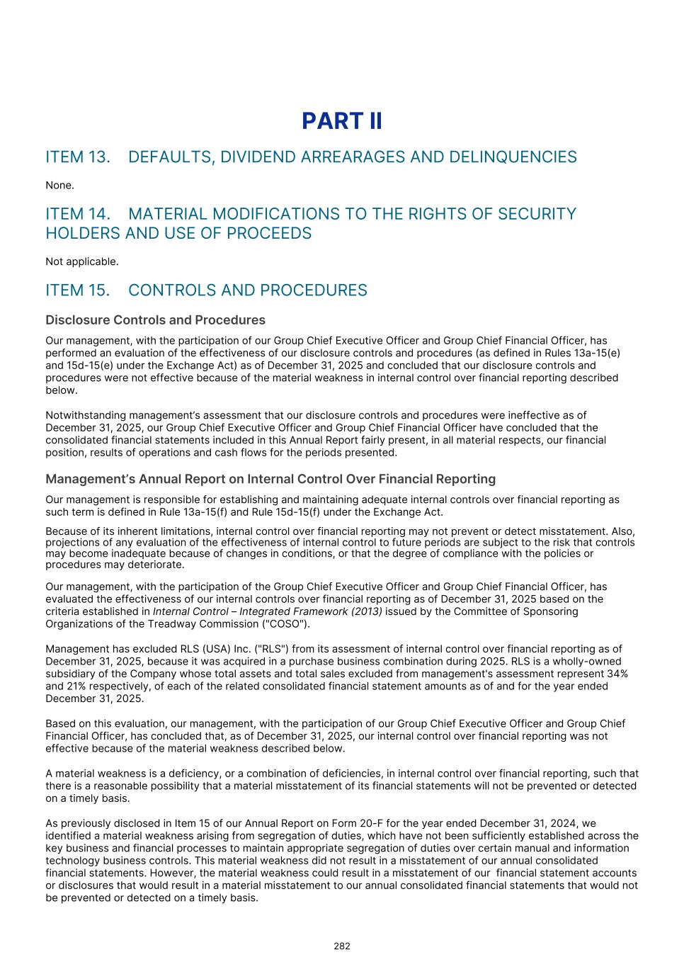 PART II ITEM 13. DEFAULTS, DIVIDEND ARREARAGES AND DELINQUENCIES None. ITEM 14. MATERIAL MODIFICATIONS TO THE RIGHTS OF SECURITY HOLDERS AND USE OF PROCEEDS Not applicable. ITEM 15. CONTROLS AND PROCEDURES Disclosure Controls and Procedures Our management, with the participation of our Group Chief Executive Officer and Group Chief Financial Officer, has performed an evaluation of the effectiveness of our disclosure controls and procedures (as defined in Rules 13a-15(e) and 15d-15(e) under the Exchange Act) as of December 31, 2025 and concluded that our disclosure controls and procedures were not effective because of the material weakness in internal control over financial reporting described below. Notwithstanding management’s assessment that our disclosure controls and procedures were ineffective as of December 31, 2025, our Group Chief Executive Officer and Group Chief Financial Officer have concluded that the consolidated financial statements included in this Annual Report fairly present, in all material respects, our financial position, results of operations and cash flows for the periods presented. Management’s Annual Report on Internal Control Over Financial Reporting Our management is responsible for establishing and maintaining adequate internal controls over financial reporting as such term is defined in Rule 13a-15(f) and Rule 15d-15(f) under the Exchange Act. Because of its inherent limitations, internal control over financial reporting may not prevent or detect misstatement. Also, projections of any evaluation of the effectiveness of internal control to future periods are subject to the risk that controls may become inadequate because of changes in conditions, or that the degree of compliance with the policies or procedures may deteriorate. Our management, with the participation of the Group Chief Executive Officer and Group Chief Financial Officer, has evaluated the effectiveness of our internal controls over financial reporting as of December 31, 2025 based on the criteria established in Internal Control – Integrated Framework (2013) issued by the Committee of Sponsoring Organizations of the Treadway Commission ("COSO"). Management has excluded RLS (USA) Inc. ("RLS") from its assessment of internal control over financial reporting as of December 31, 2025, because it was acquired in a purchase business combination during 2025. RLS is a wholly-owned subsidiary of the Company whose total assets and total sales excluded from management's assessment represent 34% and 21% respectively, of each of the related consolidated financial statement amounts as of and for the year ended December 31, 2025. Based on this evaluation, our management, with the participation of our Group Chief Executive Officer and Group Chief Financial Officer, has concluded that, as of December 31, 2025, our internal control over financial reporting was not effective because of the material weakness described below. A material weakness is a deficiency, or a combination of deficiencies, in internal control over financial reporting, such that there is a reasonable possibility that a material misstatement of its financial statements will not be prevented or detected on a timely basis. As previously disclosed in Item 15 of our Annual Report on Form 20-F for the year ended December 31, 2024, we identified a material weakness arising from segregation of duties, which have not been sufficiently established across the key business and financial processes to maintain appropriate segregation of duties over certain manual and information technology business controls. This material weakness did not result in a misstatement of our annual consolidated financial statements. However, the material weakness could result in a misstatement of our financial statement accounts or disclosures that would result in a material misstatement to our annual consolidated financial statements that would not be prevented or detected on a timely basis. 282