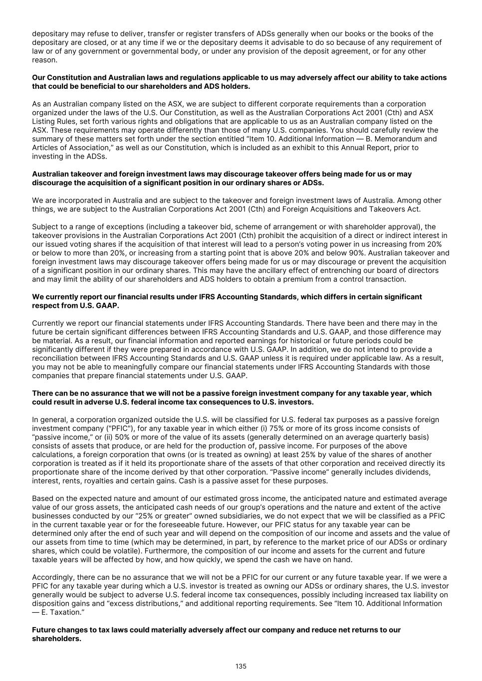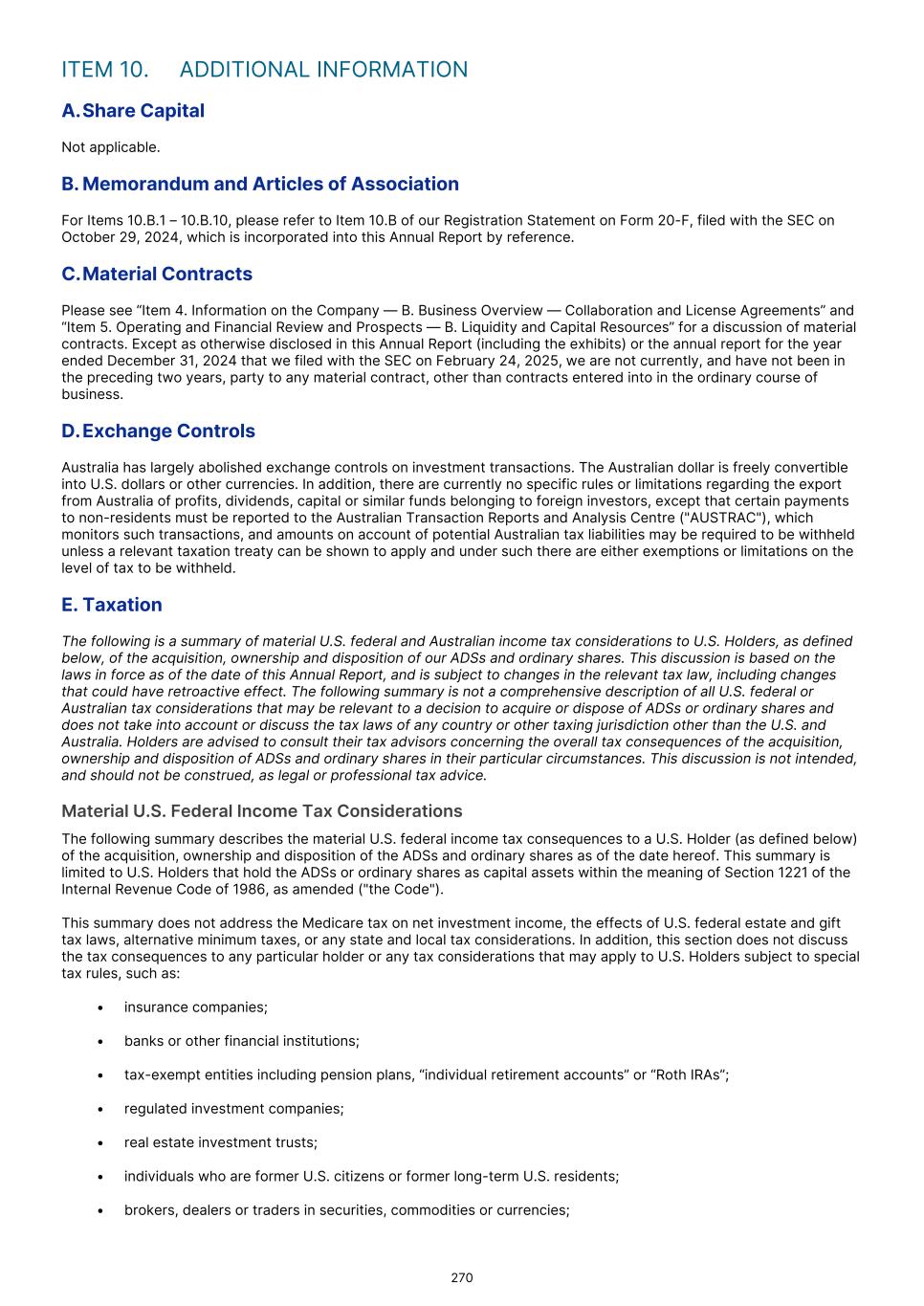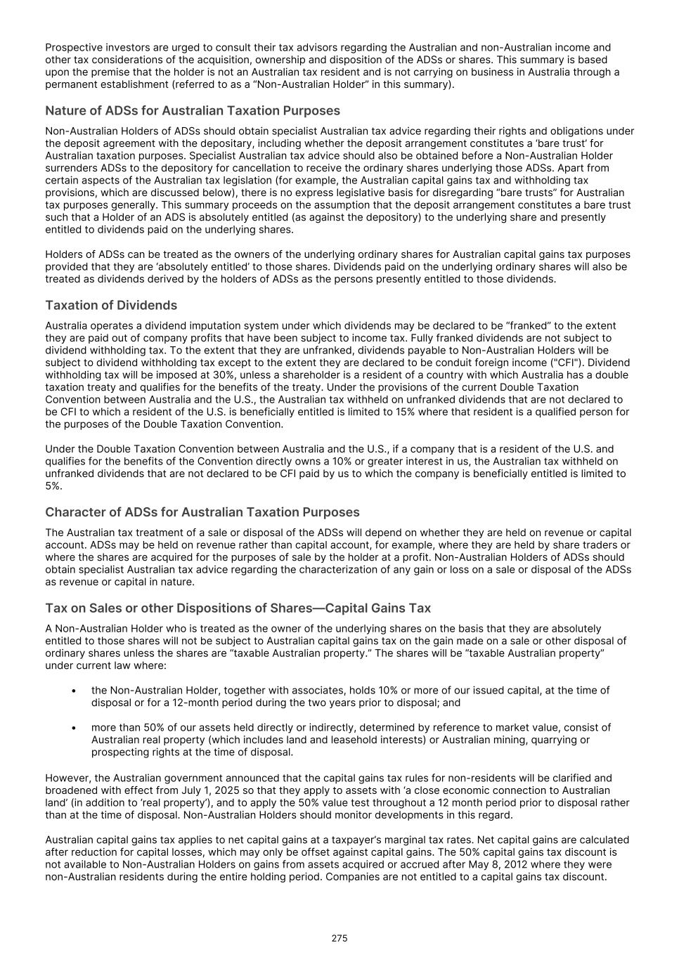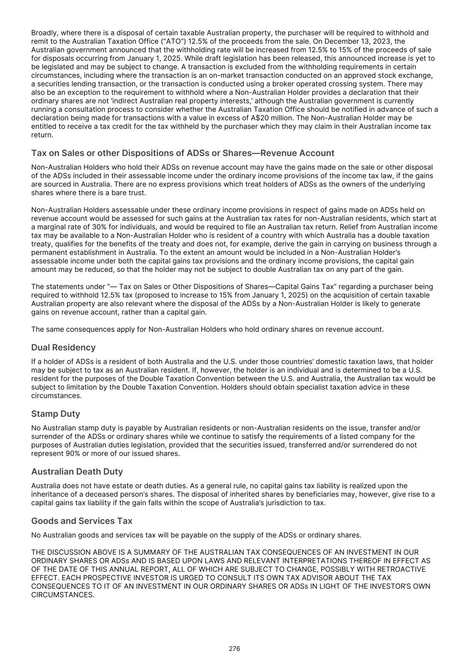Broadly, where there is a disposal of certain taxable Australian property, the purchaser will be required to withhold and remit to the Australian Taxation Office ("ATO") 12.5% of the proceeds from the sale. On December 13, 2023, the Australian government announced that the withholding rate will be increased from 12.5% to 15% of the proceeds of sale for disposals occurring from January 1, 2025. While draft legislation has been released, this announced increase is yet to be legislated and may be subject to change. A transaction is excluded from the withholding requirements in certain circumstances, including where the transaction is an on-market transaction conducted on an approved stock exchange, a securities lending transaction, or the transaction is conducted using a broker operated crossing system. There may also be an exception to the requirement to withhold where a Non-Australian Holder provides a declaration that their ordinary shares are not ‘indirect Australian real property interests,’ although the Australian government is currently running a consultation process to consider whether the Australian Taxation Office should be notified in advance of such a declaration being made for transactions with a value in excess of A$20 million. The Non-Australian Holder may be entitled to receive a tax credit for the tax withheld by the purchaser which they may claim in their Australian income tax return. Tax on Sales or other Dispositions of ADSs or Shares—Revenue Account Non-Australian Holders who hold their ADSs on revenue account may have the gains made on the sale or other disposal of the ADSs included in their assessable income under the ordinary income provisions of the income tax law, if the gains are sourced in Australia. There are no express provisions which treat holders of ADSs as the owners of the underlying shares where there is a bare trust. Non-Australian Holders assessable under these ordinary income provisions in respect of gains made on ADSs held on revenue account would be assessed for such gains at the Australian tax rates for non-Australian residents, which start at a marginal rate of 30% for individuals, and would be required to file an Australian tax return. Relief from Australian income tax may be available to a Non-Australian Holder who is resident of a country with which Australia has a double taxation treaty, qualifies for the benefits of the treaty and does not, for example, derive the gain in carrying on business through a permanent establishment in Australia. To the extent an amount would be included in a Non-Australian Holder’s assessable income under both the capital gains tax provisions and the ordinary income provisions, the capital gain amount may be reduced, so that the holder may not be subject to double Australian tax on any part of the gain. The statements under “— Tax on Sales or Other Dispositions of Shares—Capital Gains Tax” regarding a purchaser being required to withhold 12.5% tax (proposed to increase to 15% from January 1, 2025) on the acquisition of certain taxable Australian property are also relevant where the disposal of the ADSs by a Non-Australian Holder is likely to generate gains on revenue account, rather than a capital gain. The same consequences apply for Non-Australian Holders who hold ordinary shares on revenue account. Dual Residency If a holder of ADSs is a resident of both Australia and the U.S. under those countries’ domestic taxation laws, that holder may be subject to tax as an Australian resident. If, however, the holder is an individual and is determined to be a U.S. resident for the purposes of the Double Taxation Convention between the U.S. and Australia, the Australian tax would be subject to limitation by the Double Taxation Convention. Holders should obtain specialist taxation advice in these circumstances. Stamp Duty No Australian stamp duty is payable by Australian residents or non-Australian residents on the issue, transfer and/or surrender of the ADSs or ordinary shares while we continue to satisfy the requirements of a listed company for the purposes of Australian duties legislation, provided that the securities issued, transferred and/or surrendered do not represent 90% or more of our issued shares. Australian Death Duty Australia does not have estate or death duties. As a general rule, no capital gains tax liability is realized upon the inheritance of a deceased person’s shares. The disposal of inherited shares by beneficiaries may, however, give rise to a capital gains tax liability if the gain falls within the scope of Australia’s jurisdiction to tax. Goods and Services Tax No Australian goods and services tax will be payable on the supply of the ADSs or ordinary shares. THE DISCUSSION ABOVE IS A SUMMARY OF THE AUSTRALIAN TAX CONSEQUENCES OF AN INVESTMENT IN OUR ORDINARY SHARES OR ADSs AND IS BASED UPON LAWS AND RELEVANT INTERPRETATIONS THEREOF IN EFFECT AS OF THE DATE OF THIS ANNUAL REPORT, ALL OF WHICH ARE SUBJECT TO CHANGE, POSSIBLY WITH RETROACTIVE EFFECT. EACH PROSPECTIVE INVESTOR IS URGED TO CONSULT ITS OWN TAX ADVISOR ABOUT THE TAX CONSEQUENCES TO IT OF AN INVESTMENT IN OUR ORDINARY SHARES OR ADSs IN LIGHT OF THE INVESTOR’S OWN CIRCUMSTANCES. 276