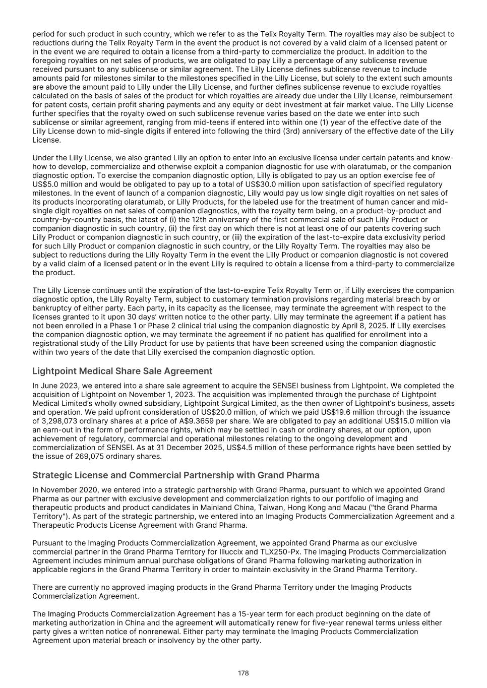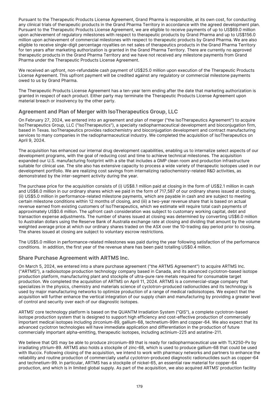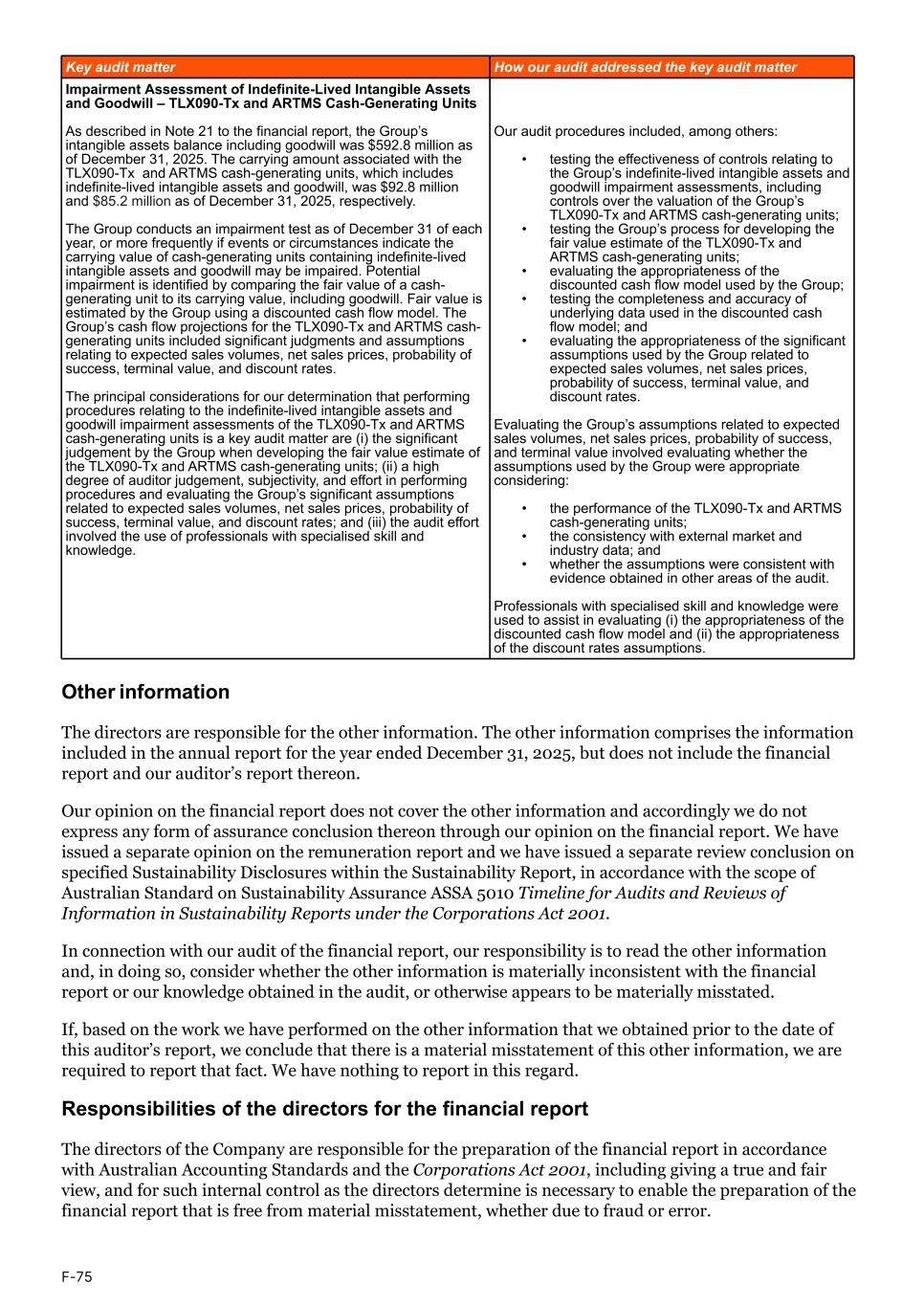 Impairment Assessment of Indefinite-Lived Intangible Assets and Goodwill – TLX090-Tx and ARTMS Cash-Generating Units As described in Note 21 to the financial report, the Group’s intangible assets balance including goodwill was $592.8 million as of December 31, 2025. The carrying amount associated with the TLX090-Tx and ARTMS cash-generating units, which includes indefinite-lived intangible assets and goodwill, was $92.8 million and $85.2 million as of December 31, 2025, respectively. The Group conducts an impairment test as of December 31 of each year, or more frequently if events or circumstances indicate the carrying value of cash-generating units containing indefinite-lived intangible assets and goodwill may be impaired. Potential impairment is identified by comparing the fair value of a cash- generating unit to its carrying value, including goodwill. Fair value is estimated by the Group using a discounted cash flow model. The Group’s cash flow projections for the TLX090-Tx and ARTMS cash- generating units included significant judgments and assumptions relating to expected sales volumes, net sales prices, probability of success, terminal value, and discount rates. The principal considerations for our determination that performing procedures relating to the indefinite-lived intangible assets and goodwill impairment assessments of the TLX090-Tx and ARTMS cash-generating units is a key audit matter are (i) the significant judgement by the Group when developing the fair value estimate of the TLX090-Tx and ARTMS cash-generating units; (ii) a high degree of auditor judgement, subjectivity, and effort in performing procedures and evaluating the Group’s significant assumptions related to expected sales volumes, net sales prices, probability of success, terminal value, and discount rates; and (iii) the audit effort involved the use of professionals with specialised skill and knowledge. Our audit procedures included, among others: • testing the effectiveness of controls relating to the Group’s indefinite-lived intangible assets and goodwill impairment assessments, including controls over the valuation of the Group’s TLX090-Tx and ARTMS cash-generating units; • testing the Group’s process for developing the fair value estimate of the TLX090-Tx and ARTMS cash-generating units; • evaluating the appropriateness of the discounted cash flow model used by the Group; • testing the completeness and accuracy of underlying data used in the discounted cash flow model; and • evaluating the appropriateness of the significant assumptions used by the Group related to expected sales volumes, net sales prices, probability of success, terminal value, and discount rates. Evaluating the Group’s assumptions related to expected sales volumes, net sales prices, probability of success, and terminal value involved evaluating whether the assumptions used by the Group were appropriate considering: • the performance of the TLX090-Tx and ARTMS cash-generating units; • the consistency with external market and industry data; and • whether the assumptions were consistent with evidence obtained in other areas of the audit. Professionals with specialised skill and knowledge were used to assist in evaluating (i) the appropriateness of the discounted cash flow model and (ii) the appropriateness of the discount rates assumptions. Key audit matter How our audit addressed the key audit matter Other information The directors are responsible for the other information. The other information comprises the information included in the annual report for the year ended December 31, 2025, but does not include the financial report and our auditor’s report thereon. Our opinion on the financial report does not cover the other information and accordingly we do not express any form of assurance conclusion thereon through our opinion on the financial report. We have issued a separate opinion on the remuneration report and we have issued a separate review conclusion on specified Sustainability Disclosures within the Sustainability Report, in accordance with the scope of Australian Standard on Sustainability Assurance ASSA 5010 Timeline for Audits and Reviews of Information in Sustainability Reports under the Corporations Act 2001. In connection with our audit of the financial report, our responsibility is to read the other information and, in doing so, consider whether the other information is materially inconsistent with the financial report or our knowledge obtained in the audit, or otherwise appears to be materially misstated. If, based on the work we have performed on the other information that we obtained prior to the date of this auditor’s report, we conclude that there is a material misstatement of this other information, we are required to report that fact. We have nothing to report in this regard. Responsibilities of the directors for the financial report The directors of the Company are responsible for the preparation of the financial report in accordance with Australian Accounting Standards and the Corporations Act 2001, including giving a true and fair view, and for such internal control as the directors determine is necessary to enable the preparation of the financial report that is free from material misstatement, whether due to fraud or error. F-75