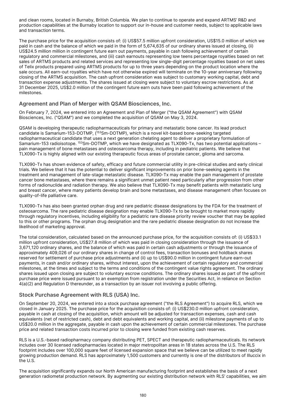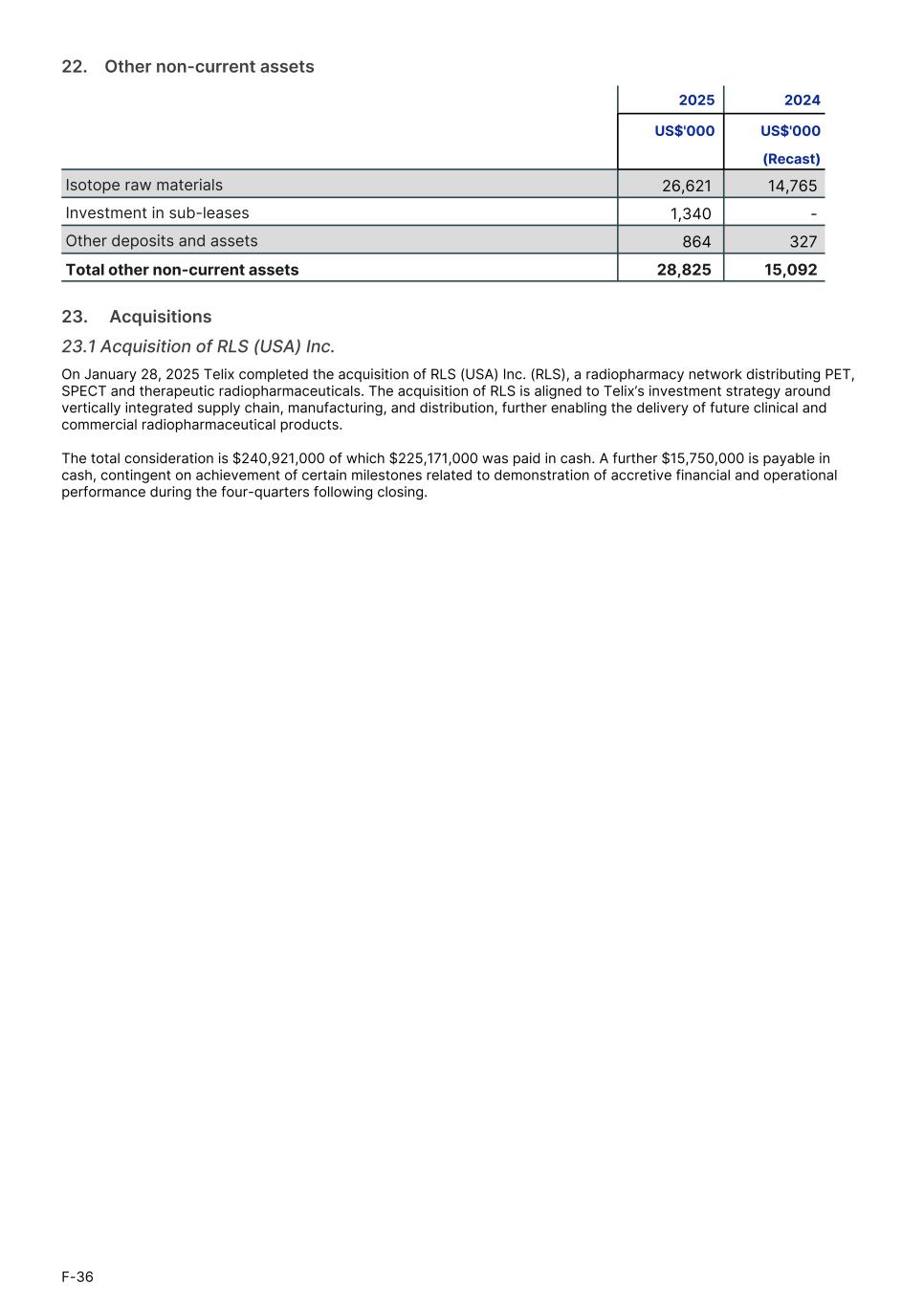 22. Other non-current assets 2025 2024 US$'000 US$'000 (Recast) Isotope raw materials 26,621 14,765 Investment in sub-leases 1,340 - Other deposits and assets 864 327 Total other non-current assets 28,825 15,092 23.     Acquisitions 23.1 Acquisition of RLS (USA) Inc. On January 28, 2025 Telix completed the acquisition of RLS (USA) Inc. (RLS), a radiopharmacy network distributing PET, SPECT and therapeutic radiopharmaceuticals. The acquisition of RLS is aligned to Telix’s investment strategy around vertically integrated supply chain, manufacturing, and distribution, further enabling the delivery of future clinical and commercial radiopharmaceutical products. The total consideration is $240,921,000 of which $225,171,000 was paid in cash. A further $15,750,000 is payable in cash, contingent on achievement of certain milestones related to demonstration of accretive financial and operational performance during the four-quarters following closing. F-36