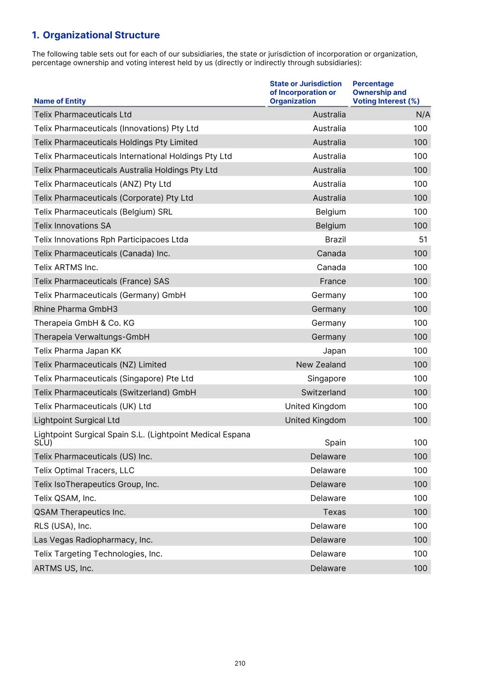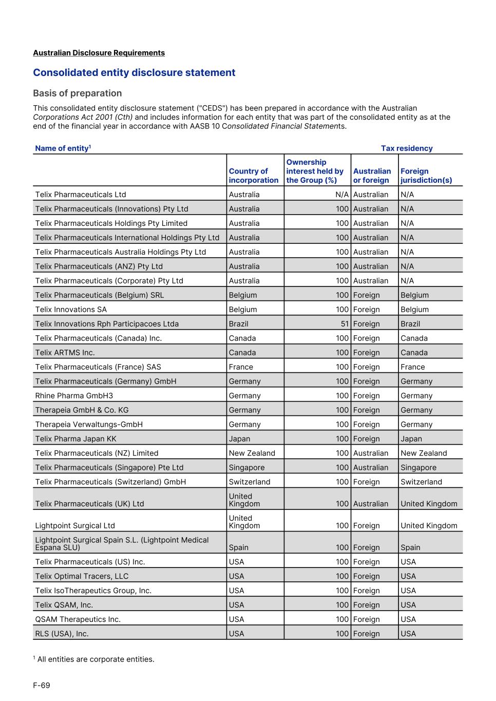 Australian Disclosure Requirements Consolidated entity disclosure statement Basis of preparation This consolidated entity disclosure statement ("CEDS") has been prepared in accordance with the Australian Corporations Act 2001 (Cth) and includes information for each entity that was part of the consolidated entity as at the end of the financial year in accordance with AASB 10 Consolidated Financial Statements. Telix Pharmaceuticals Ltd Australia N/A Australian N/A Telix Pharmaceuticals (Innovations) Pty Ltd Australia 100 Australian N/A Telix Pharmaceuticals Holdings Pty Limited Australia 100 Australian N/A Telix Pharmaceuticals International Holdings Pty Ltd Australia 100 Australian N/A Telix Pharmaceuticals Australia Holdings Pty Ltd Australia 100 Australian N/A Telix Pharmaceuticals (ANZ) Pty Ltd Australia 100 Australian N/A Telix Pharmaceuticals (Corporate) Pty Ltd Australia 100 Australian N/A Telix Pharmaceuticals (Belgium) SRL Belgium 100 Foreign Belgium Telix Innovations SA Belgium 100 Foreign Belgium Telix Innovations Rph Participacoes Ltda Brazil 51 Foreign Brazil Telix Pharmaceuticals (Canada) Inc. Canada 100 Foreign Canada Telix ARTMS Inc. Canada 100 Foreign Canada Telix Pharmaceuticals (France) SAS France 100 Foreign France Telix Pharmaceuticals (Germany) GmbH Germany 100 Foreign Germany Rhine Pharma GmbH3 Germany 100 Foreign Germany Therapeia GmbH & Co. KG Germany 100 Foreign Germany Therapeia Verwaltungs-GmbH Germany 100 Foreign Germany Telix Pharma Japan KK Japan 100 Foreign Japan Telix Pharmaceuticals (NZ) Limited New Zealand 100 Australian New Zealand Telix Pharmaceuticals (Singapore) Pte Ltd Singapore 100 Australian Singapore Telix Pharmaceuticals (Switzerland) GmbH Switzerland 100 Foreign Switzerland Telix Pharmaceuticals (UK) Ltd United Kingdom 100 Australian United Kingdom Lightpoint Surgical Ltd United Kingdom 100 Foreign United Kingdom Lightpoint Surgical Spain S.L. (Lightpoint Medical Espana SLU) Spain 100 Foreign Spain Telix Pharmaceuticals (US) Inc. USA 100 Foreign USA Telix Optimal Tracers, LLC USA 100 Foreign USA Telix IsoTherapeutics Group, Inc. USA 100 Foreign USA Telix QSAM, Inc. USA 100 Foreign USA QSAM Therapeutics Inc. USA 100 Foreign USA RLS (USA), Inc. USA 100 Foreign USA Name of entity1 Tax residency Country of incorporation Ownership interest held by the Group (%) Australian or foreign Foreign jurisdiction(s) F-69 1 All entities are corporate entities.