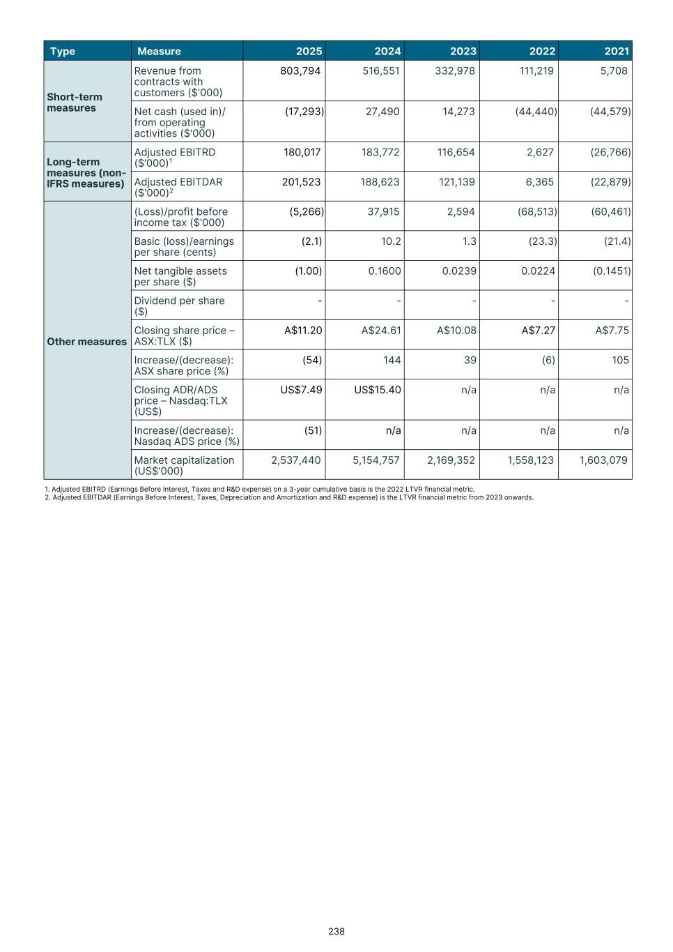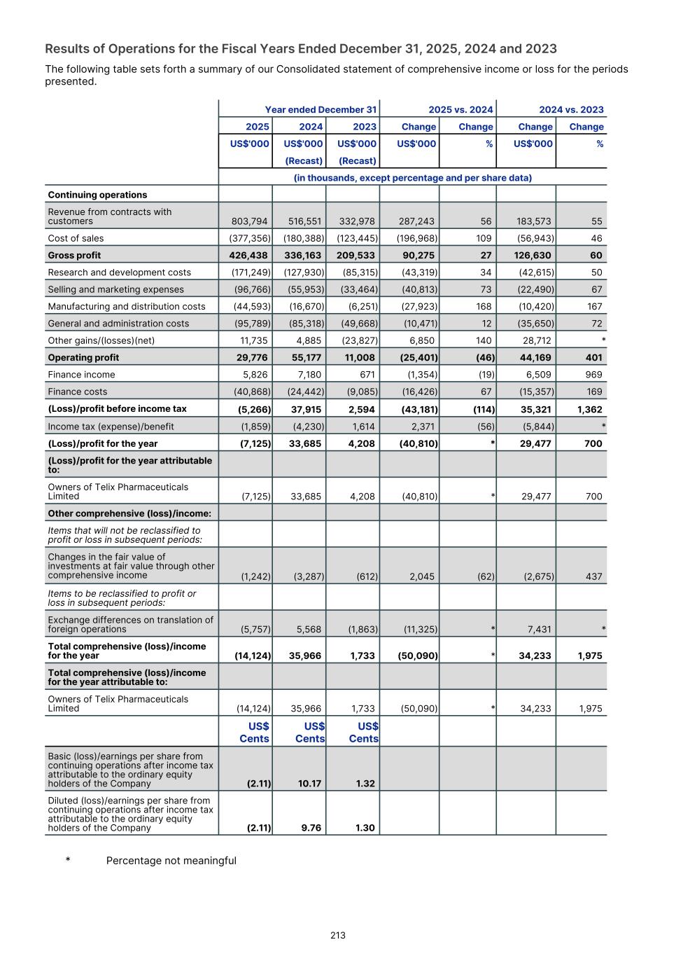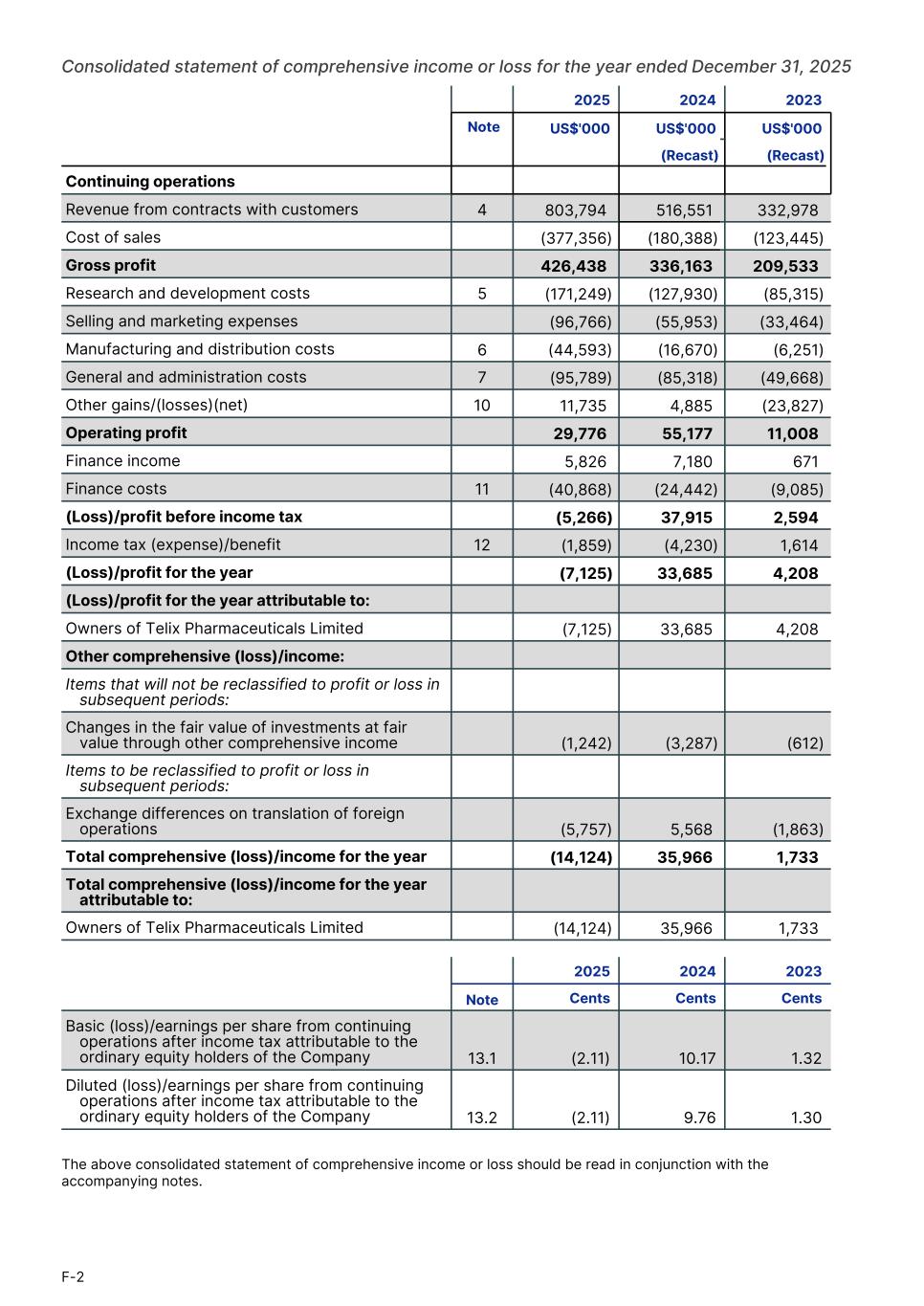Consolidated statement of comprehensive income or loss for the year ended December 31, 2025 2025 2024 2023 Note US$'000 US$'000 US$'000 (Recast) (Recast) Continuing operations Revenue from contracts with customers 4 803,794 516,551 332,978 Cost of sales (377,356) (180,388) (123,445) Gross profit 426,438 336,163 209,533 Research and development costs 5 (171,249) (127,930) (85,315) Selling and marketing expenses (96,766) (55,953) (33,464) Manufacturing and distribution costs 6 (44,593) (16,670) (6,251) General and administration costs 7 (95,789) (85,318) (49,668) Other gains/(losses)(net) 10 11,735 4,885 (23,827) Operating profit 29,776 55,177 11,008 Finance income 5,826 7,180 671 Finance costs 11 (40,868) (24,442) (9,085) (Loss)/profit before income tax (5,266) 37,915 2,594 Income tax (expense)/benefit 12 (1,859) (4,230) 1,614 (Loss)/profit for the year (7,125) 33,685 4,208 (Loss)/profit for the year attributable to: Owners of Telix Pharmaceuticals Limited (7,125) 33,685 4,208 Other comprehensive (loss)/income: Items that will not be reclassified to profit or loss in subsequent periods: Changes in the fair value of investments at fair value through other comprehensive income (1,242) (3,287) (612) Items to be reclassified to profit or loss in subsequent periods: Exchange differences on translation of foreign operations (5,757) 5,568 (1,863) Total comprehensive (loss)/income for the year (14,124) 35,966 1,733 Total comprehensive (loss)/income for the year attributable to: Owners of Telix Pharmaceuticals Limited (14,124) 35,966 1,733 2025 2024 2023 Note Cents Cents Cents1. Basic (loss)/earnings per share from continuing operations after income tax attributable to the ordinary equity holders of the Company 13.1 (2.11) 10.17 1.32 Diluted (loss)/earnings per share from continuing operations after income tax attributable to the ordinary equity holders of the Company 13.2 (2.11) 9.76 1.30 The above consolidated statement of comprehensive income or loss should be read in conjunction with the accompanying notes. F-2