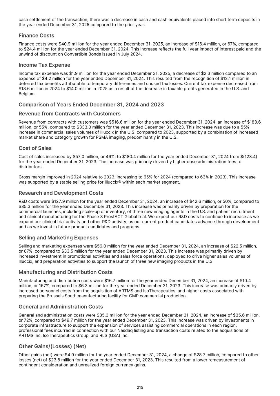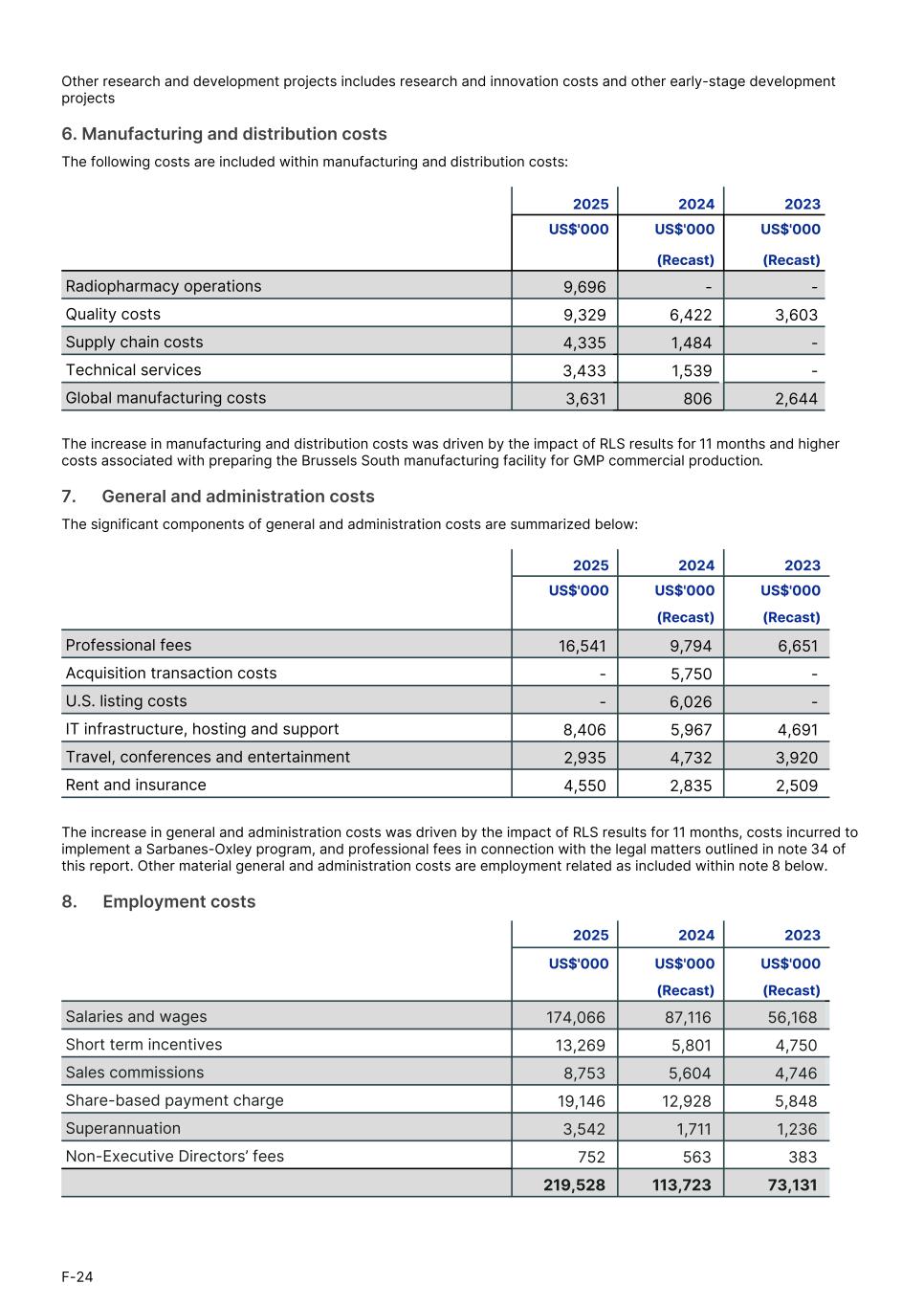 Other research and development projects includes research and innovation costs and other early-stage development projects 6. Manufacturing and distribution costs The following costs are included within manufacturing and distribution costs: 2025 2024 2023 US$'000 US$'000 US$'000 (Recast) (Recast) Radiopharmacy operations 9,696 - - Quality costs 9,329 6,422 3,603 Supply chain costs 4,335 1,484 - Technical services 3,433 1,539 - Global manufacturing costs 3,631 806 2,644 The increase in manufacturing and distribution costs was driven by the impact of RLS results for 11 months and higher costs associated with preparing the Brussels South manufacturing facility for GMP commercial production. 7.      General and administration costs The significant components of general and administration costs are summarized below: 2025 2024 2023 US$'000 US$'000 US$'000 (Recast) (Recast) Professional fees 16,541 9,794 6,651 Acquisition transaction costs - 5,750 - U.S. listing costs - 6,026 - IT infrastructure, hosting and support 8,406 5,967 4,691 Travel, conferences and entertainment 2,935 4,732 3,920 Rent and insurance 4,550 2,835 2,509 The increase in general and administration costs was driven by the impact of RLS results for 11 months, costs incurred to implement a Sarbanes-Oxley program, and professional fees in connection with the legal matters outlined in note 34 of this report. Other material general and administration costs are employment related as included within note 8 below. 8.      Employment costs 2025 2024 2023 US$'000 US$'000 US$'0001. (Recast) (Recast) Salaries and wages 174,066 87,116 56,168 Short term incentives 13,269 5,801 4,750 Sales commissions 8,753 5,604 4,746 Share-based payment charge 19,146 12,928 5,848 Superannuation 3,542 1,711 1,236 Non-Executive Directors’ fees 752 563 383 219,528 113,723 73,131 F-24