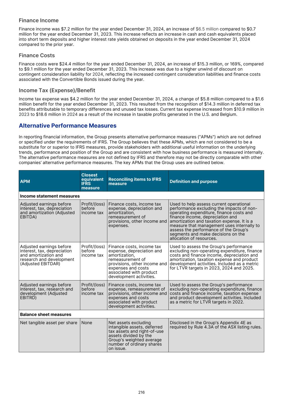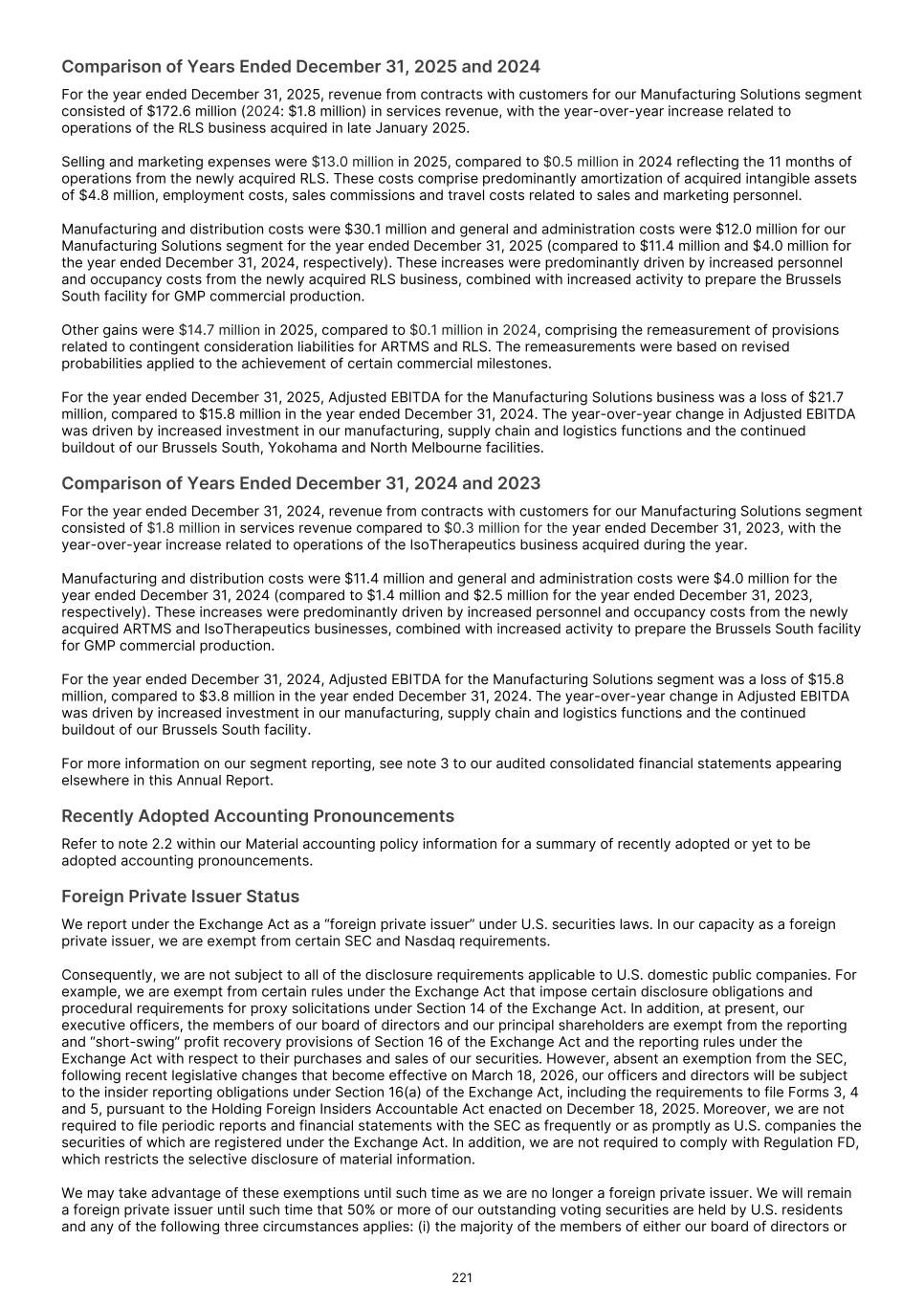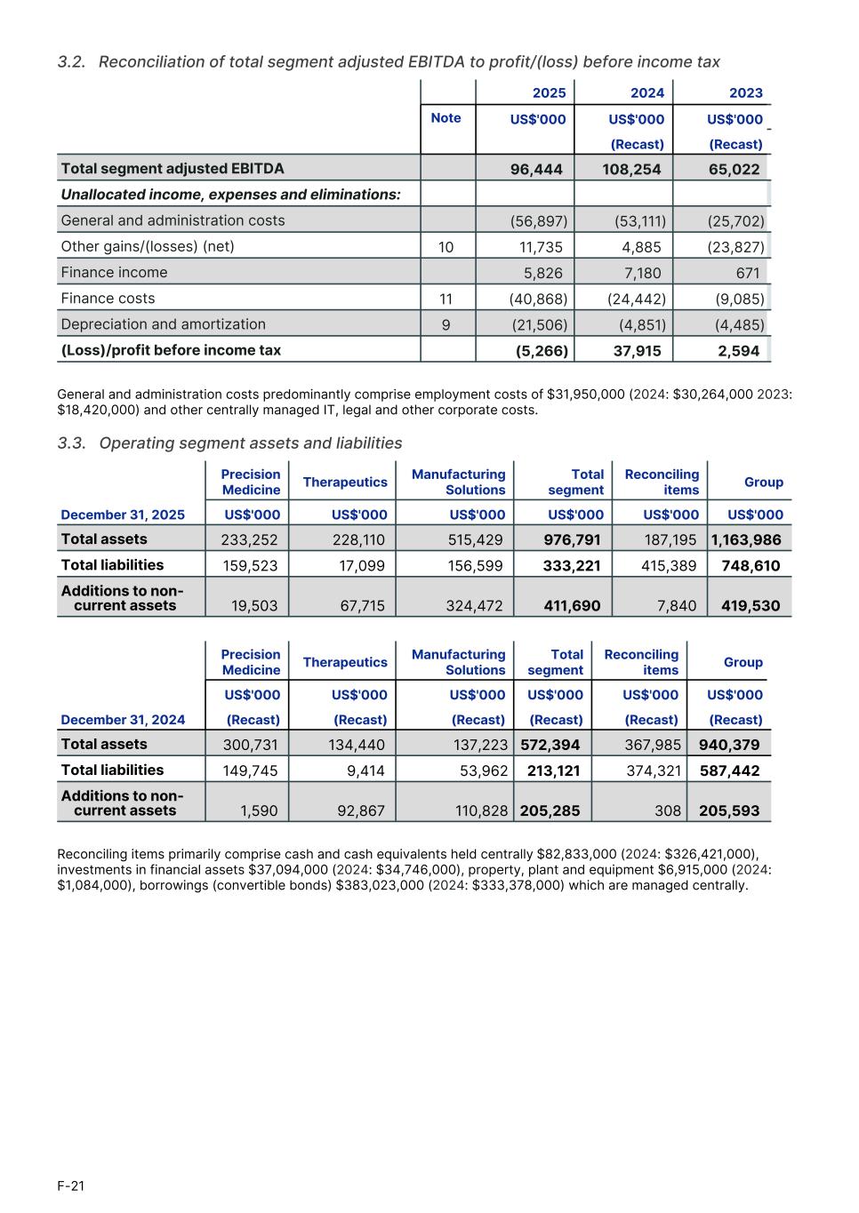 3.2.   Reconciliation of total segment adjusted EBITDA to profit/(loss) before income tax 2025 2024 2023 Note US$'000 US$'000 US$'000 (Recast) (Recast) Total segment adjusted EBITDA 96,444 108,254 65,022 Unallocated income, expenses and eliminations: General and administration costs (56,897) (53,111) (25,702) Other gains/(losses) (net) 10 11,735 4,885 (23,827) Finance income 5,826 7,180 671 Finance costs 11 (40,868) (24,442) (9,085) Depreciation and amortization 9 (21,506) (4,851) (4,485) (Loss)/profit before income tax (5,266) 37,915 2,594 General and administration costs predominantly comprise employment costs of $31,950,000 (2024: $30,264,000 2023: $18,420,000) and other centrally managed IT, legal and other corporate costs. 3.3.   Operating segment assets and liabilities Precision Medicine Therapeutics Manufacturing Solutions Total segment Reconciling items Group1. December 31, 2025 US$'000 US$'000 US$'000 US$'000 US$'000 US$'000 Total assets 233,252 228,110 515,429 976,791 187,195 1,163,986 Total liabilities 159,523 17,099 156,599 333,221 415,389 748,610 Additions to non- current assets 19,503 67,715 324,472 411,690 7,840 419,530 Precision Medicine Therapeutics Manufacturing Solutions Total segment Reconciling items Group US$'000 US$'000 US$'000 US$'000 US$'000 US$'000 December 31, 2024 (Recast) (Recast) (Recast) (Recast) (Recast) (Recast) Total assets 300,731 134,440 137,223 572,394 367,985 940,379 Total liabilities 149,745 9,414 53,962 213,121 374,321 587,442 Additions to non- current assets 1,590 92,867 110,828 205,285 308 205,593 Reconciling items primarily comprise cash and cash equivalents held centrally $82,833,000 (2024: $326,421,000), investments in financial assets $37,094,000 (2024: $34,746,000), property, plant and equipment $6,915,000 (2024: $1,084,000), borrowings (convertible bonds) $383,023,000 (2024: $333,378,000) which are managed centrally. F-21