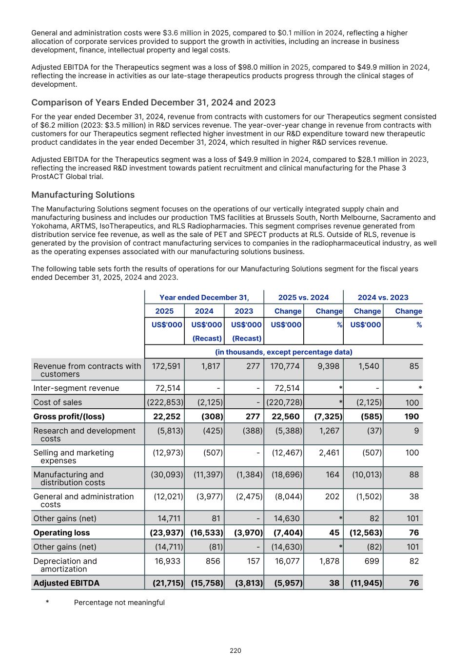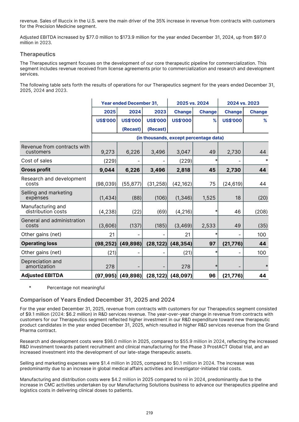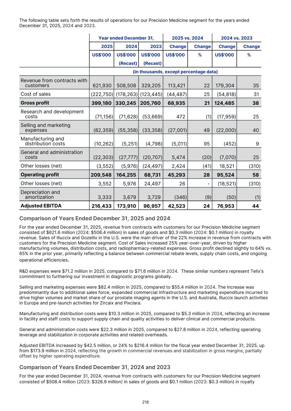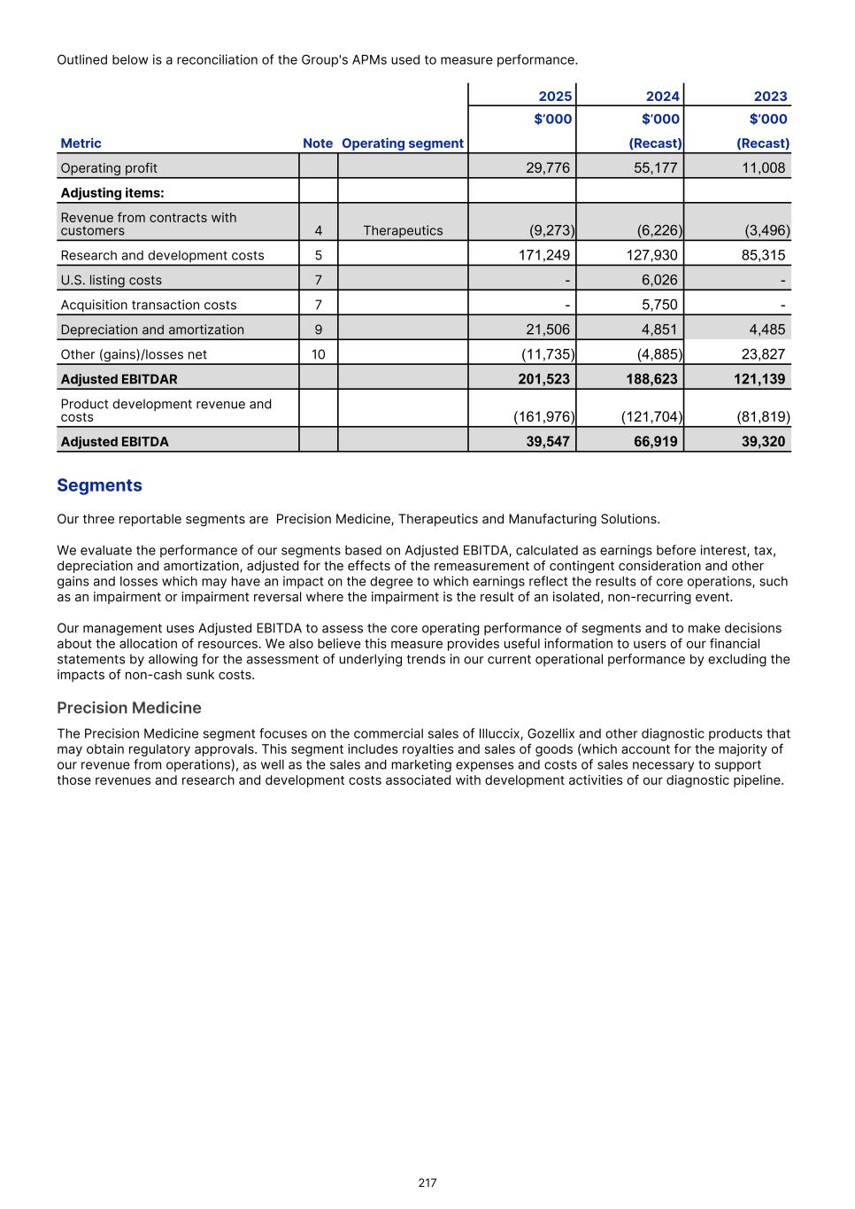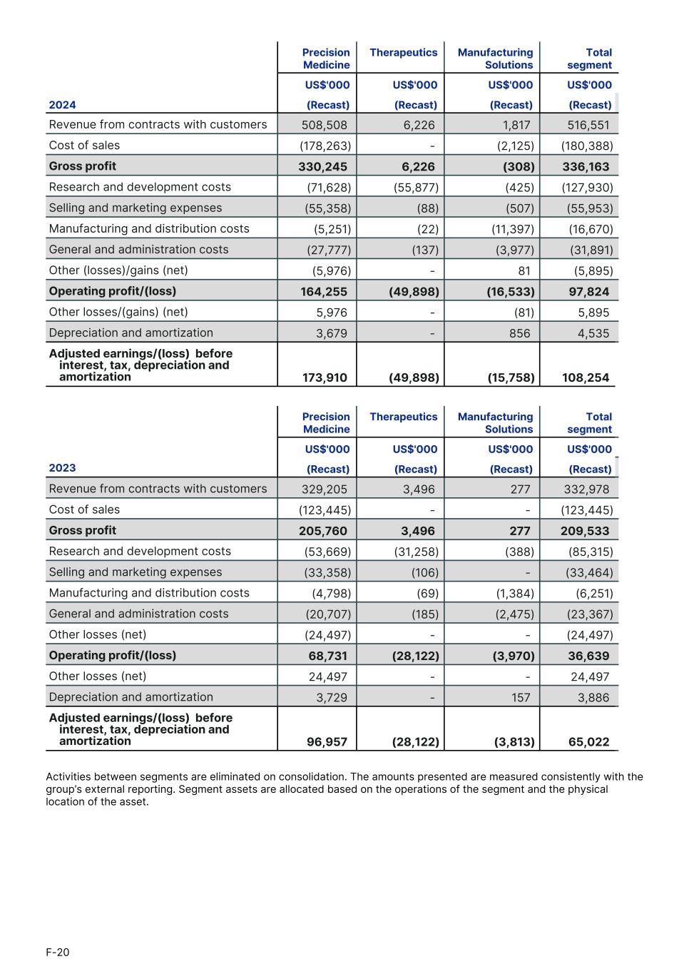 Precision Medicine Therapeutics Manufacturing Solutions Total segment1. US$'000 US$'000 US$'000 US$'000 2024 (Recast) (Recast) (Recast) (Recast) Revenue from contracts with customers 508,508 6,226 1,817 516,551 Cost of sales (178,263) - (2,125) (180,388) Gross profit 330,245 6,226 (308) 336,163 Research and development costs (71,628) (55,877) (425) (127,930) Selling and marketing expenses (55,358) (88) (507) (55,953) Manufacturing and distribution costs (5,251) (22) (11,397) (16,670) General and administration costs (27,777) (137) (3,977) (31,891) Other (losses)/gains (net) (5,976) - 81 (5,895) Operating profit/(loss) 164,255 (49,898) (16,533) 97,824 Other losses/(gains) (net) 5,976 - (81) 5,895 Depreciation and amortization 3,679 - 856 4,535 Adjusted earnings/(loss) before interest, tax, depreciation and amortization 173,910 (49,898) (15,758) 108,254 Precision Medicine Therapeutics Manufacturing Solutions Total segment US$'000 US$'000 US$'000 US$'000 2023 (Recast) (Recast) (Recast) (Recast) Revenue from contracts with customers 329,205 3,496 277 332,978 Cost of sales (123,445) - - (123,445) Gross profit 205,760 3,496 277 209,533 Research and development costs (53,669) (31,258) (388) (85,315) Selling and marketing expenses (33,358) (106) - (33,464) Manufacturing and distribution costs (4,798) (69) (1,384) (6,251) General and administration costs (20,707) (185) (2,475) (23,367) Other losses (net) (24,497) - - (24,497) Operating profit/(loss) 68,731 (28,122) (3,970) 36,639 Other losses (net) 24,497 - - 24,497 Depreciation and amortization 3,729 - 157 3,886 Adjusted earnings/(loss) before interest, tax, depreciation and amortization 96,957 (28,122) (3,813) 65,022 Activities between segments are eliminated on consolidation. The amounts presented are measured consistently with the group’s external reporting. Segment assets are allocated based on the operations of the segment and the physical location of the asset. F-20