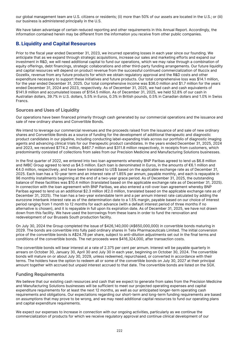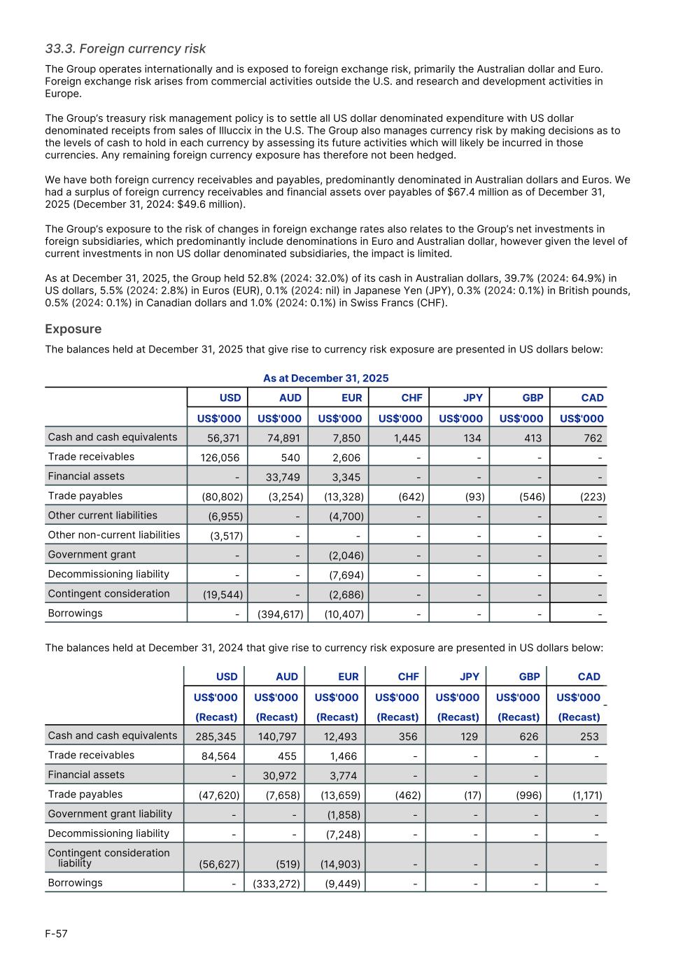 33.3. Foreign currency risk The Group operates internationally and is exposed to foreign exchange risk, primarily the Australian dollar and Euro. Foreign exchange risk arises from commercial activities outside the U.S. and research and development activities in Europe. The Group’s treasury risk management policy is to settle all US dollar denominated expenditure with US dollar denominated receipts from sales of Illuccix in the U.S. The Group also manages currency risk by making decisions as to the levels of cash to hold in each currency by assessing its future activities which will likely be incurred in those currencies. Any remaining foreign currency exposure has therefore not been hedged. We have both foreign currency receivables and payables, predominantly denominated in Australian dollars and Euros. We had a surplus of foreign currency receivables and financial assets over payables of $67.4 million as of December 31, 2025 (December 31, 2024: $49.6 million). The Group’s exposure to the risk of changes in foreign exchange rates also relates to the Group’s net investments in foreign subsidiaries, which predominantly include denominations in Euro and Australian dollar, however given the level of current investments in non US dollar denominated subsidiaries, the impact is limited. As at December 31, 2025, the Group held 52.8% (2024: 32.0%) of its cash in Australian dollars, 39.7% (2024: 64.9%) in US dollars, 5.5% (2024: 2.8%) in Euros (EUR), 0.1% (2024: nil) in Japanese Yen (JPY), 0.3% (2024: 0.1%) in British pounds, 0.5% (2024: 0.1%) in Canadian dollars and 1.0% (2024: 0.1%) in Swiss Francs (CHF). Exposure The balances held at December 31, 2025 that give rise to currency risk exposure are presented in US dollars below: As at December 31, 2025 USD AUD EUR CHF JPY GBP CAD US$'000 US$'000 US$'000 US$'000 US$'000 US$'000 US$'000 Cash and cash equivalents 56,371 74,891 7,850 1,445 134 413 762 Trade receivables 126,056 540 2,606 - - - - Financial assets - 33,749 3,345 - - - - Trade payables (80,802) (3,254) (13,328) (642) (93) (546) (223) Other current liabilities (6,955) - (4,700) - - - - Other non-current liabilities (3,517) - - - - - - Government grant - - (2,046) - - - - Decommissioning liability - - (7,694) - - - - Contingent consideration (19,544) - (2,686) - - - - Borrowings - (394,617) (10,407) - - - - The balances held at December 31, 2024 that give rise to currency risk exposure are presented in US dollars below: USD AUD EUR CHF JPY GBP CAD1. US$'000 US$'000 US$'000 US$'000 US$'000 US$'000 US$'000 (Recast) (Recast) (Recast) (Recast) (Recast) (Recast) (Recast) Cash and cash equivalents 285,345 140,797 12,493 356 129 626 253 Trade receivables 84,564 455 1,466 - - - - Financial assets - 30,972 3,774 - - - Trade payables (47,620) (7,658) (13,659) (462) (17) (996) (1,171) Government grant liability - - (1,858) - - - - Decommissioning liability - - (7,248) - - - - Contingent consideration liability (56,627) (519) (14,903) - - - - Borrowings - (333,272) (9,449) - - - - F-57