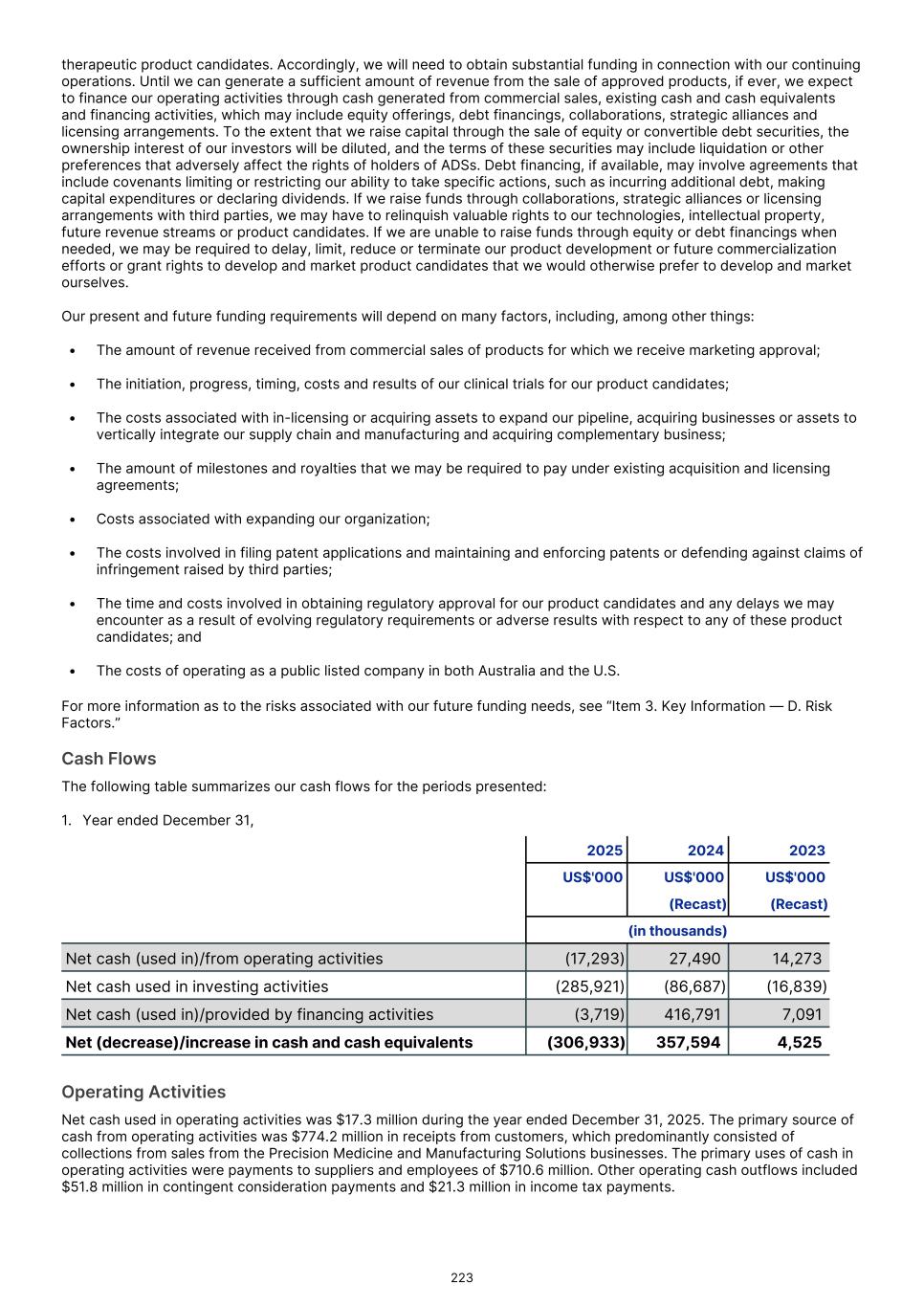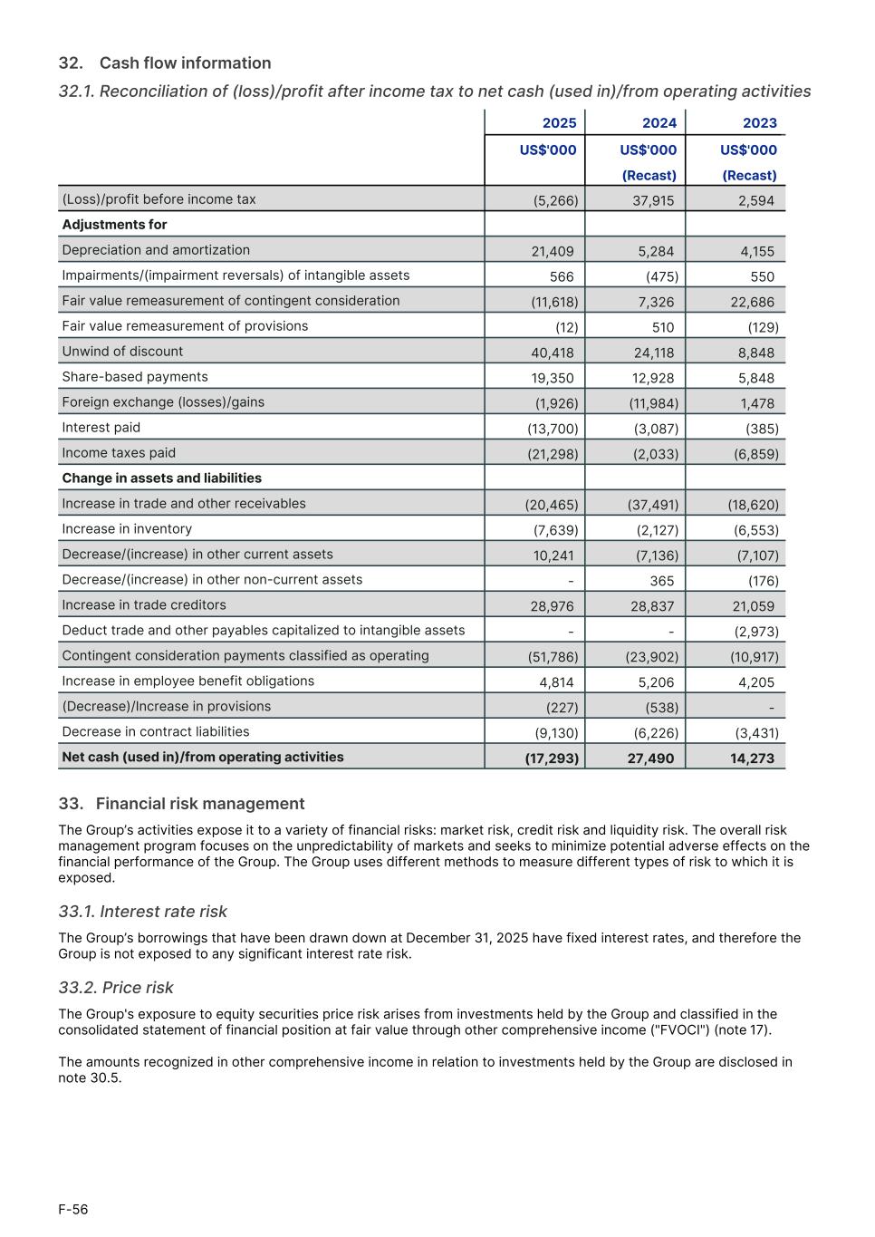 32.    Cash flow information 32.1. Reconciliation of (loss)/profit after income tax to net cash (used in)/from operating activities 2025 2024 2023 US$'000 US$'000 US$'000 (Recast) (Recast) (Loss)/profit before income tax (5,266) 37,915 2,594 Adjustments for Depreciation and amortization 21,409 5,284 4,155 Impairments/(impairment reversals) of intangible assets 566 (475) 550 Fair value remeasurement of contingent consideration (11,618) 7,326 22,686 Fair value remeasurement of provisions (12) 510 (129) Unwind of discount 40,418 24,118 8,848 Share-based payments 19,350 12,928 5,848 Foreign exchange (losses)/gains (1,926) (11,984) 1,478 Interest paid (13,700) (3,087) (385) Income taxes paid (21,298) (2,033) (6,859) Change in assets and liabilities Increase in trade and other receivables (20,465) (37,491) (18,620) Increase in inventory (7,639) (2,127) (6,553) Decrease/(increase) in other current assets 10,241 (7,136) (7,107) Decrease/(increase) in other non-current assets - 365 (176) Increase in trade creditors 28,976 28,837 21,059 Deduct trade and other payables capitalized to intangible assets - - (2,973) Contingent consideration payments classified as operating (51,786) (23,902) (10,917) Increase in employee benefit obligations 4,814 5,206 4,205 (Decrease)/Increase in provisions (227) (538) - Decrease in contract liabilities (9,130) (6,226) (3,431) Net cash (used in)/from operating activities (17,293) 27,490 14,273 33.   Financial risk management The Group’s activities expose it to a variety of financial risks: market risk, credit risk and liquidity risk. The overall risk management program focuses on the unpredictability of markets and seeks to minimize potential adverse effects on the financial performance of the Group. The Group uses different methods to measure different types of risk to which it is exposed. 33.1. Interest rate risk The Group’s borrowings that have been drawn down at December 31, 2025 have fixed interest rates, and therefore the Group is not exposed to any significant interest rate risk. 33.2. Price risk The Group's exposure to equity securities price risk arises from investments held by the Group and classified in the consolidated statement of financial position at fair value through other comprehensive income ("FVOCI") (note 17). The amounts recognized in other comprehensive income in relation to investments held by the Group are disclosed in note 30.5. F-56