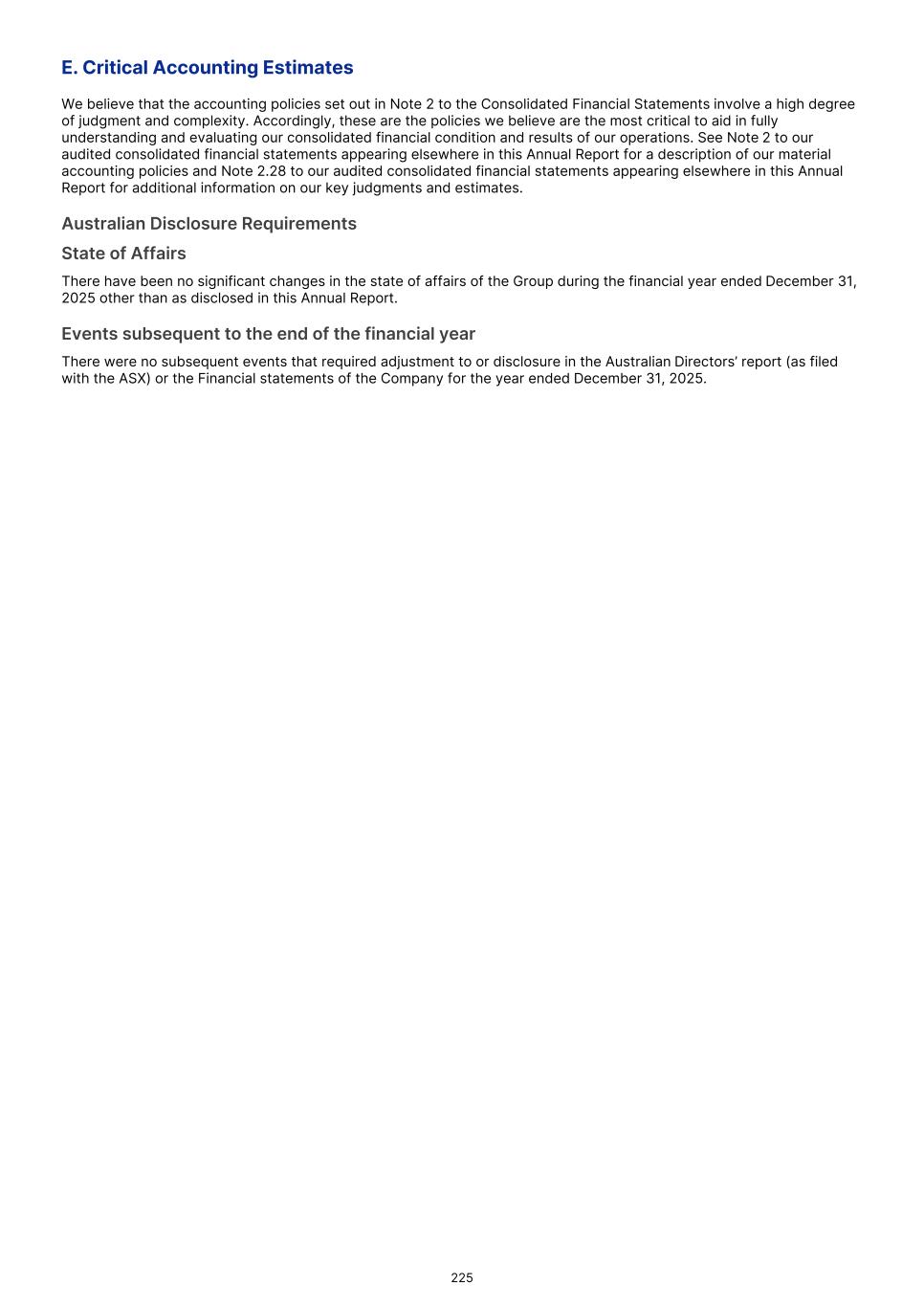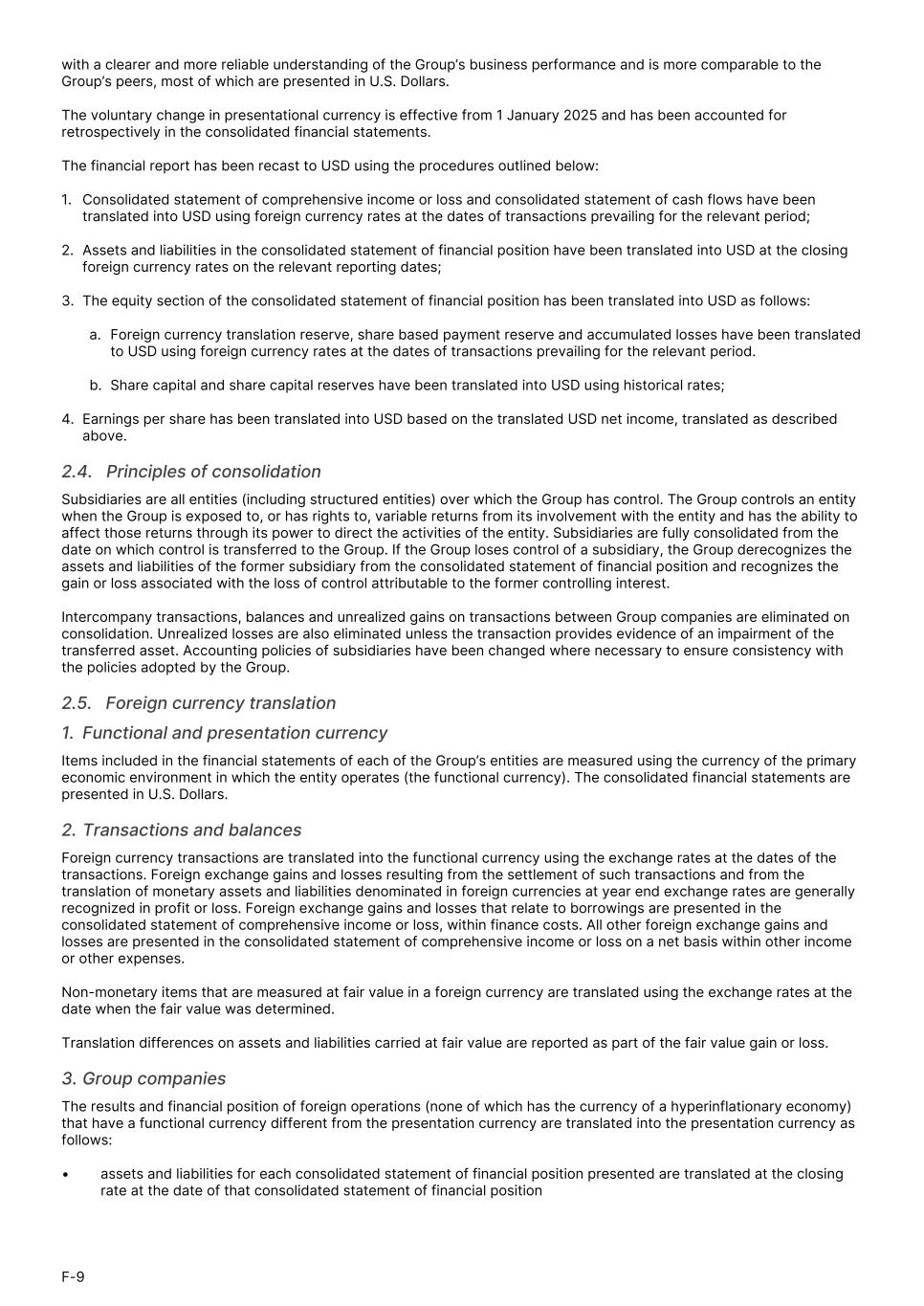 with a clearer and more reliable understanding of the Group’s business performance and is more comparable to the Group’s peers, most of which are presented in U.S. Dollars. The voluntary change in presentational currency is effective from 1 January 2025 and has been accounted for retrospectively in the consolidated financial statements. The financial report has been recast to USD using the procedures outlined below: 1. Consolidated statement of comprehensive income or loss and consolidated statement of cash flows have been translated into USD using foreign currency rates at the dates of transactions prevailing for the relevant period; 2. Assets and liabilities in the consolidated statement of financial position have been translated into USD at the closing foreign currency rates on the relevant reporting dates; 3. The equity section of the consolidated statement of financial position has been translated into USD as follows: a. Foreign currency translation reserve, share based payment reserve and accumulated losses have been translated to USD using foreign currency rates at the dates of transactions prevailing for the relevant period. b. Share capital and share capital reserves have been translated into USD using historical rates; 4. Earnings per share has been translated into USD based on the translated USD net income, translated as described above. 2.4.   Principles of consolidation Subsidiaries are all entities (including structured entities) over which the Group has control. The Group controls an entity when the Group is exposed to, or has rights to, variable returns from its involvement with the entity and has the ability to affect those returns through its power to direct the activities of the entity. Subsidiaries are fully consolidated from the date on which control is transferred to the Group. If the Group loses control of a subsidiary, the Group derecognizes the assets and liabilities of the former subsidiary from the consolidated statement of financial position and recognizes the gain or loss associated with the loss of control attributable to the former controlling interest. Intercompany transactions, balances and unrealized gains on transactions between Group companies are eliminated on consolidation. Unrealized losses are also eliminated unless the transaction provides evidence of an impairment of the transferred asset. Accounting policies of subsidiaries have been changed where necessary to ensure consistency with the policies adopted by the Group. 2.5.   Foreign currency translation 1. Functional and presentation currency Items included in the financial statements of each of the Group’s entities are measured using the currency of the primary economic environment in which the entity operates (the functional currency). The consolidated financial statements are presented in U.S. Dollars. 2. Transactions and balances Foreign currency transactions are translated into the functional currency using the exchange rates at the dates of the transactions. Foreign exchange gains and losses resulting from the settlement of such transactions and from the translation of monetary assets and liabilities denominated in foreign currencies at year end exchange rates are generally recognized in profit or loss. Foreign exchange gains and losses that relate to borrowings are presented in the consolidated statement of comprehensive income or loss, within finance costs. All other foreign exchange gains and losses are presented in the consolidated statement of comprehensive income or loss on a net basis within other income or other expenses. Non-monetary items that are measured at fair value in a foreign currency are translated using the exchange rates at the date when the fair value was determined. Translation differences on assets and liabilities carried at fair value are reported as part of the fair value gain or loss. 3. Group companies The results and financial position of foreign operations (none of which has the currency of a hyperinflationary economy) that have a functional currency different from the presentation currency are translated into the presentation currency as follows: • assets and liabilities for each consolidated statement of financial position presented are translated at the closing rate at the date of that consolidated statement of financial position F-9