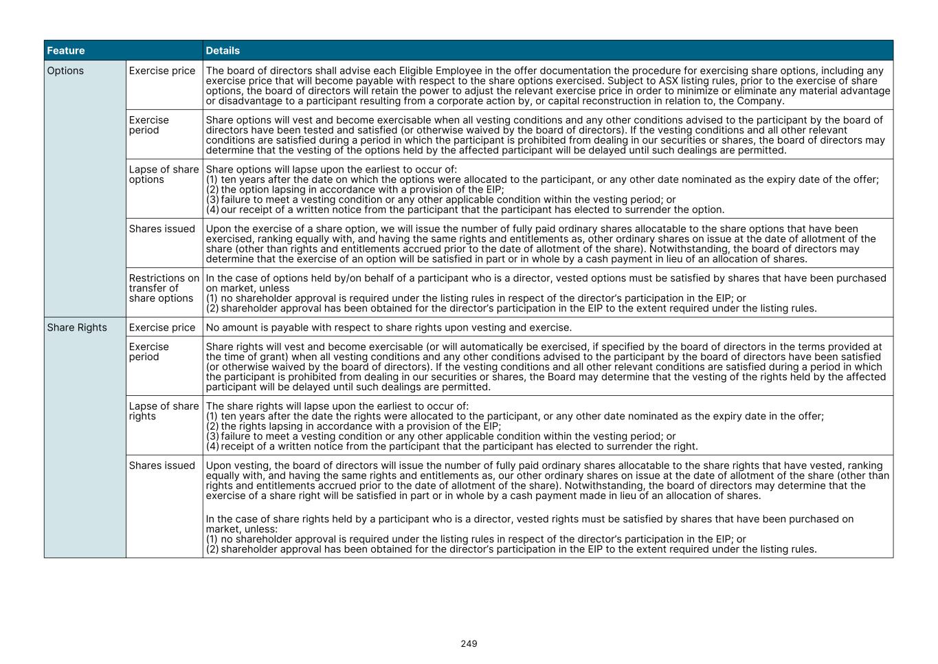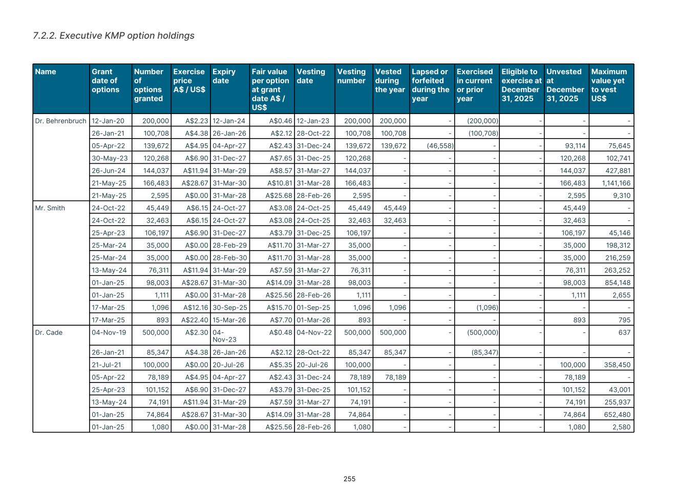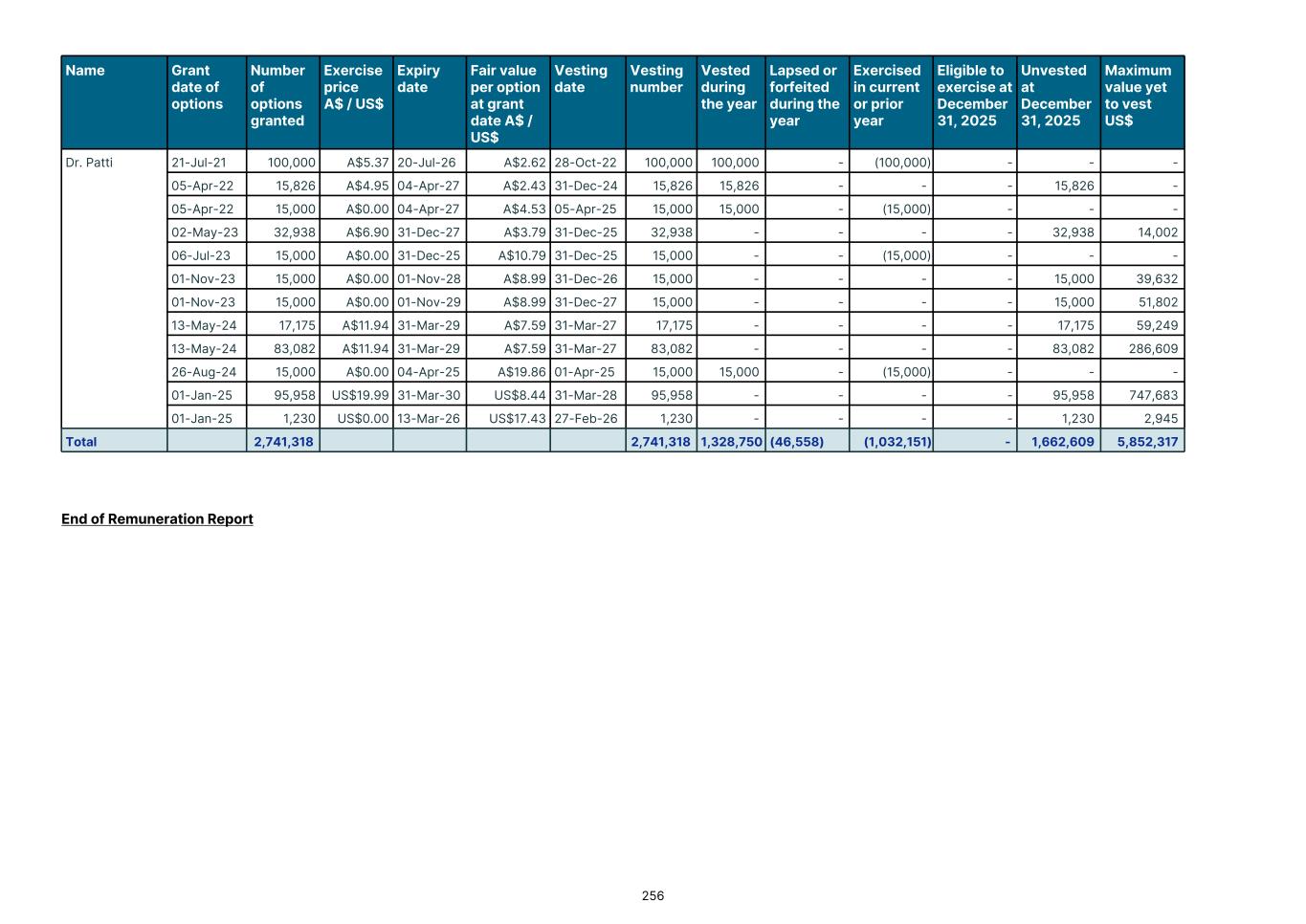 Details of the number of options convertible to ADS-backed shares issued under the EIP outstanding at the end of the year: Grant date Vesting date Expiry date Exercise price Options on issue at January 1, 2025 Issued during the year Vested during the year Exercised during the year Lapsed during the year Options on issue at December 31, 2025 US$ ’000 ’000 ’000 ’000 ’000 ’000 01-01-2025 03-31-2028 03-31-2030 19.99 - 2,881 - (287) 2,594 01-01-2025 02-27-2026 03-13-2026 0.00 - 10 - - 10 10-24-2025 03-31-2028 03-31-2028 9.98 - 1,758 - - 1,758 03-17-2025 09-01-2025 09-30-2025 8.02 - 26 (24) (2) - 03-17-2025 03-01-2026 03-15-2026 13.61 - 29 - (3) 26 - 4,704 - (24) (292) 4,388 The assessed fair value of recent tranches of options granted are outlined below. The fair value at grant date is independently determined using the Black Scholes Model. The model inputs for options granted during the year ended December 31, 2025 are included below: ASX securities January 2025 January 2025 May 2025 October 2025 March 2025 March 2025 Fair value A$14.09 A$25.56 A$25.68 A$6.31 A$15.70 A$7.70 Consideration Nil Nil Nil Nil Nil Nil Exercise price A$28.67 A$0.00 A$0.00 A$14.90 A$12.16 A$22.40 Grant date 01-01-2025 01-01-2025 05-21-2025 10-24-2025 03-17-202 5 03-17-202 5 Expiry date 03-31-2030 03-31-202 8 03-31-2028 03-31-2028 09-30-202 5 03-15-202 6 Term 5 years 3 years 3 years 2 years 1 years 1 years Share price at grant date A$ 27.80 A$ 25.56 A$ 25.68 A$ 13.66 A$ 27.36 A$ 27.36 Volatility 55% 47% 47% 55% 44% 44% Dividend yield 0.00% 0.00% 0.00% 0.00% 0.00% 0.00% Risk-free rate 3.88% 3.56% 3.56% 3.51% 3.56% 3.56% ADS-backed securities January 2025 January 2025 October 2025 March 2025 March 2025 Fair value US$8.44 US$17.43 US$4.25 US$10.10 US$5.83 Consideration Nil Nil Nil Nil Nil Exercise price US$19.99 US$0.00 US$9.98 US$8.02 US$13.61 Grant date 01-01-2025 01-01-2025 10-24-202 5 03-17-2025 03-17-2025 Expiry date 03-31-2030 03-13-2026 03-31-202 8 09-30-2025 03-15-2026 Term 5 years 1 years 2 years 1 years 1 years Share price at grant date A$ 17.53 A$ 17.43 A$ 9.16 A$ 17.60 A$ 17.60 Volatility 55% 50% 55% 56% 51% Dividend yield 0.00% 0.00% 0.00% 0.00% 0.00% Risk-free rate 4.01% 4.01% 3.64% 4.01% 4.01% F-55