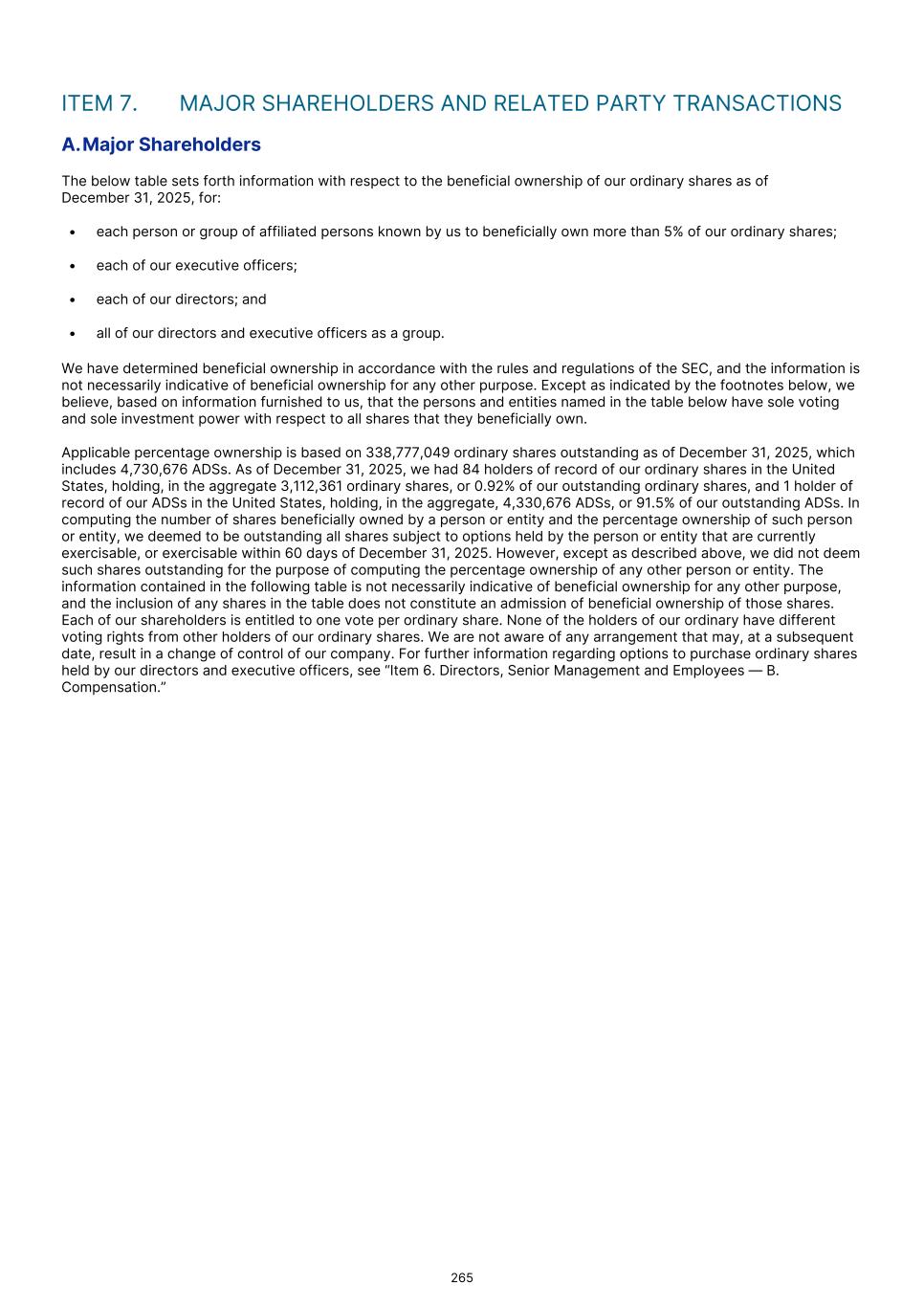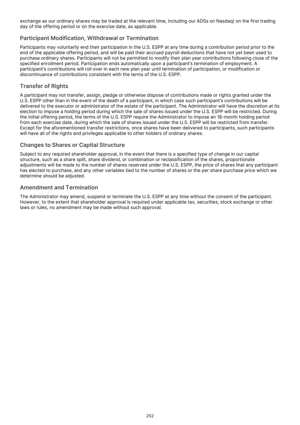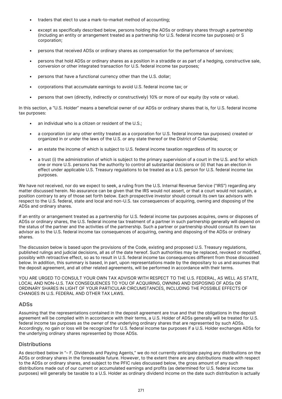 • traders that elect to use a mark-to-market method of accounting; • except as specifically described below, persons holding the ADSs or ordinary shares through a partnership (including an entity or arrangement treated as a partnership for U.S. federal income tax purposes) or S corporation; • persons that received ADSs or ordinary shares as compensation for the performance of services; • persons that hold ADSs or ordinary shares as a position in a straddle or as part of a hedging, constructive sale, conversion or other integrated transaction for U.S. federal income tax purposes; • persons that have a functional currency other than the U.S. dollar; • corporations that accumulate earnings to avoid U.S. federal income tax; or • persons that own (directly, indirectly or constructively) 10% or more of our equity (by vote or value). In this section, a “U.S. Holder” means a beneficial owner of our ADSs or ordinary shares that is, for U.S. federal income tax purposes: • an individual who is a citizen or resident of the U.S.; • a corporation (or any other entity treated as a corporation for U.S. federal income tax purposes) created or organized in or under the laws of the U.S. or any state thereof or the District of Columbia; • an estate the income of which is subject to U.S. federal income taxation regardless of its source; or • a trust (i) the administration of which is subject to the primary supervision of a court in the U.S. and for which one or more U.S. persons has the authority to control all substantial decisions or (ii) that has an election in effect under applicable U.S. Treasury regulations to be treated as a U.S. person for U.S. federal income tax purposes. We have not received, nor do we expect to seek, a ruling from the U.S. Internal Revenue Service ("IRS") regarding any matter discussed herein. No assurance can be given that the IRS would not assert, or that a court would not sustain, a position contrary to any of those set forth below. Each prospective investor should consult its own tax advisors with respect to the U.S. federal, state and local and non-U.S. tax consequences of acquiring, owning and disposing of the ADSs and ordinary shares. If an entity or arrangement treated as a partnership for U.S. federal income tax purposes acquires, owns or disposes of ADSs or ordinary shares, the U.S. federal income tax treatment of a partner in such partnership generally will depend on the status of the partner and the activities of the partnership. Such a partner or partnership should consult its own tax advisor as to the U.S. federal income tax consequences of acquiring, owning and disposing of the ADSs or ordinary shares. The discussion below is based upon the provisions of the Code, existing and proposed U.S. Treasury regulations, published rulings and judicial decisions, all as of the date hereof. Such authorities may be replaced, revoked or modified, possibly with retroactive effect, so as to result in U.S. federal income tax consequences different from those discussed below. In addition, this summary is based, in part, upon representations made by the depositary to us and assumes that the deposit agreement, and all other related agreements, will be performed in accordance with their terms. YOU ARE URGED TO CONSULT YOUR OWN TAX ADVISOR WITH RESPECT TO THE U.S. FEDERAL, AS WELL AS STATE, LOCAL AND NON-U.S. TAX CONSEQUENCES TO YOU OF ACQUIRING, OWNING AND DISPOSING OF ADSs OR ORDINARY SHARES IN LIGHT OF YOUR PARTICULAR CIRCUMSTANCES, INCLUDING THE POSSIBLE EFFECTS OF CHANGES IN U.S. FEDERAL AND OTHER TAX LAWS. ADSs Assuming that the representations contained in the deposit agreement are true and that the obligations in the deposit agreement will be complied with in accordance with their terms, a U.S. Holder of ADSs generally will be treated for U.S. federal income tax purposes as the owner of the underlying ordinary shares that are represented by such ADSs. Accordingly, no gain or loss will be recognized for U.S. federal income tax purposes if a U.S. Holder exchanges ADSs for the underlying ordinary shares represented by those ADSs. Distributions As described below in “– F. Dividends and Paying Agents,” we do not currently anticipate paying any distributions on the ADSs or ordinary shares in the foreseeable future. However, to the extent there are any distributions made with respect to the ADSs or ordinary shares, and subject to the PFIC rules discussed below, the gross amount of any such distributions made out of our current or accumulated earnings and profits (as determined for U.S. federal income tax purposes) will generally be taxable to a U.S. Holder as ordinary dividend income on the date such distribution is actually 271