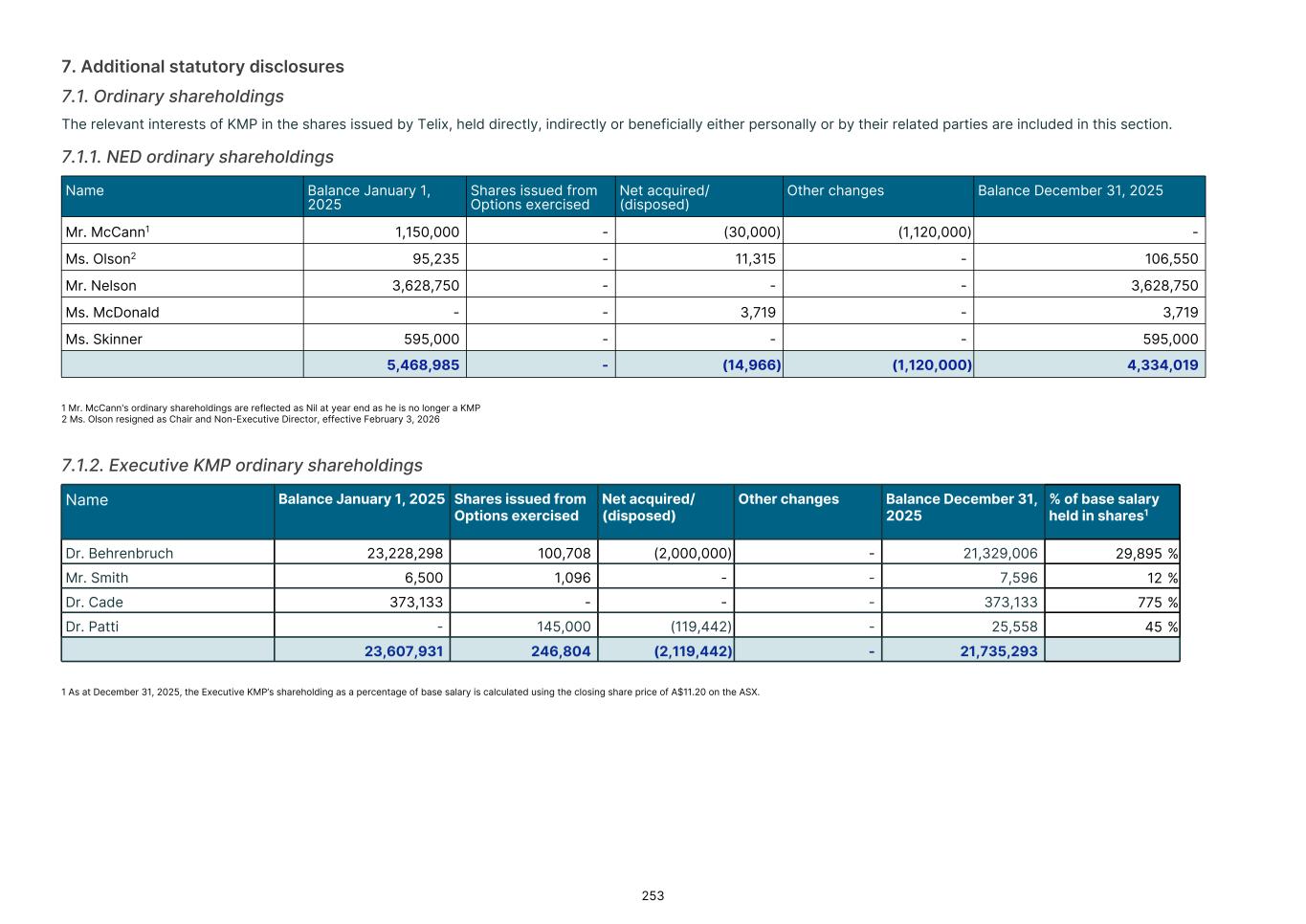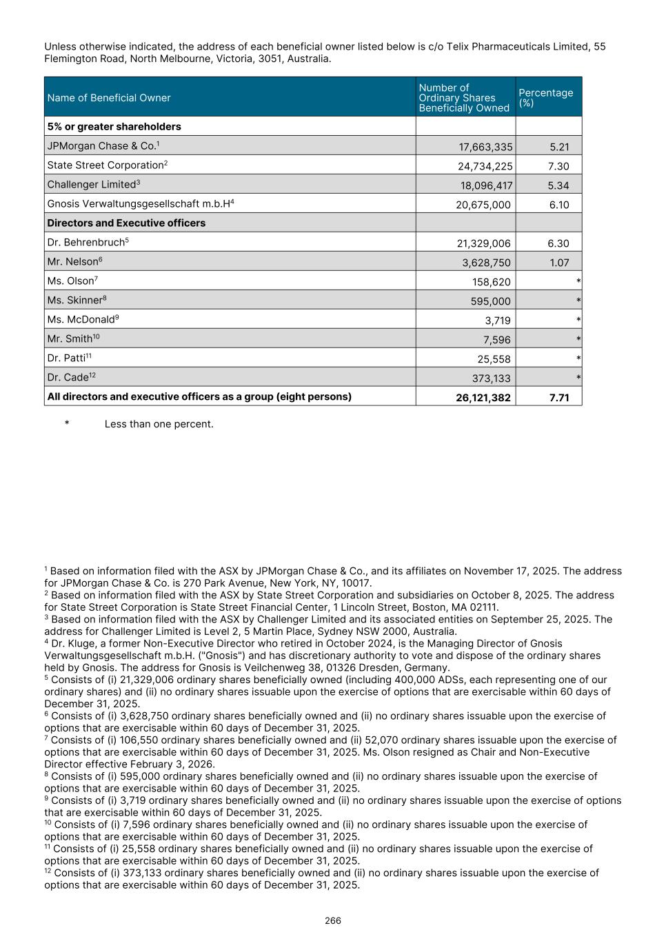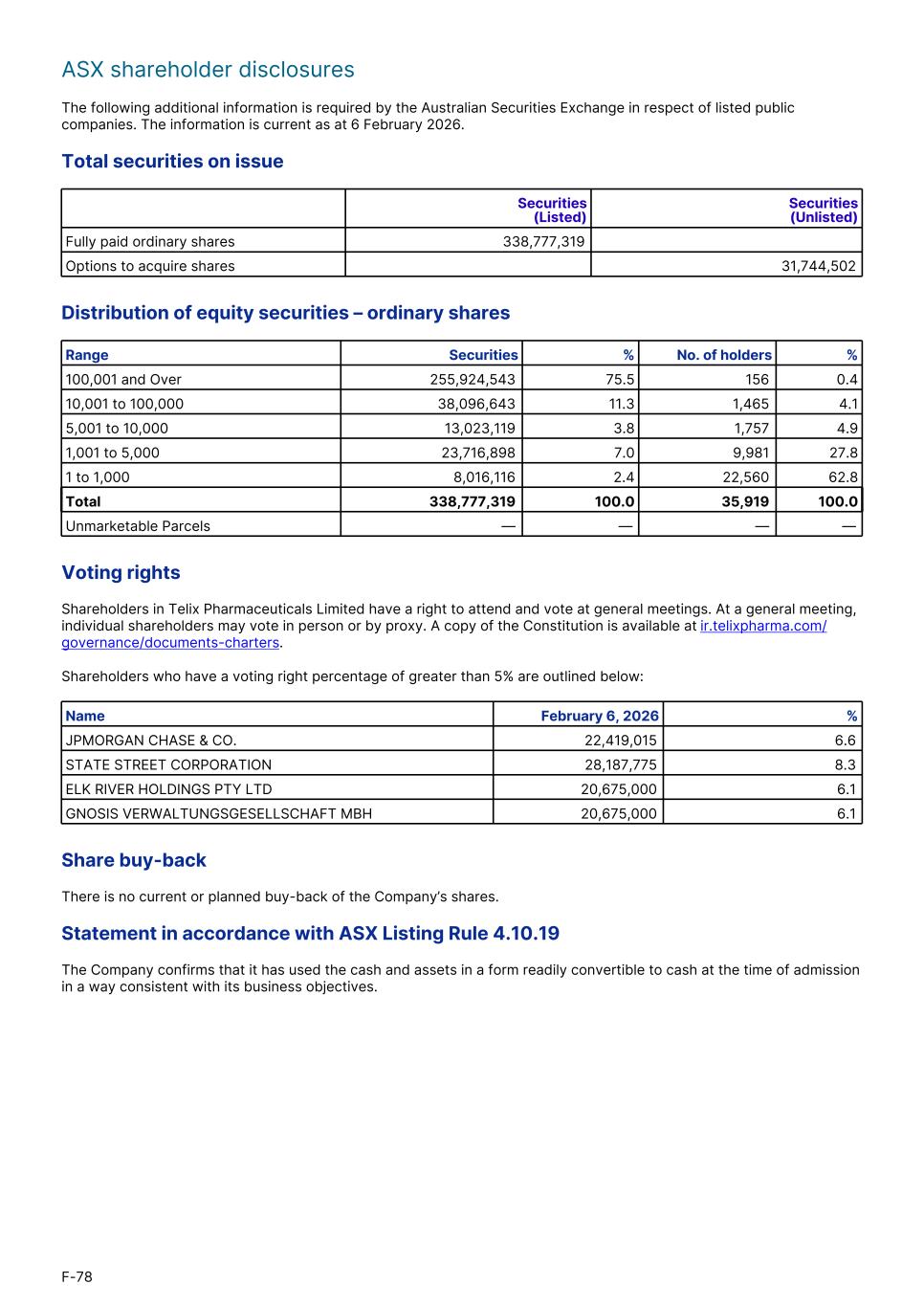 ASX shareholder disclosures The following additional information is required by the Australian Securities Exchange in respect of listed public companies. The information is current as at 6 February 2026. Total securities on issue Securities (Listed) Securities (Unlisted) Fully paid ordinary shares 338,777,319 Options to acquire shares 31,744,502 Distribution of equity securities – ordinary shares Range Securities % No. of holders % 100,001 and Over 255,924,543 75.5 156 0.4 10,001 to 100,000 38,096,643 11.3 1,465 4.1 5,001 to 10,000 13,023,119 3.8 1,757 4.9 1,001 to 5,000 23,716,898 7.0 9,981 27.8 1 to 1,000 8,016,116 2.4 22,560 62.8 Total 338,777,319 100.0 35,919 100.0 Unmarketable Parcels — — — — Voting rights Shareholders in Telix Pharmaceuticals Limited have a right to attend and vote at general meetings. At a general meeting, individual shareholders may vote in person or by proxy. A copy of the Constitution is available at ir.telixpharma.com/ governance/documents-charters. Shareholders who have a voting right percentage of greater than 5% are outlined below: Name February 6, 2026 % JPMORGAN CHASE & CO. 22,419,015 6.6 STATE STREET CORPORATION 28,187,775 8.3 ELK RIVER HOLDINGS PTY LTD 20,675,000 6.1 GNOSIS VERWALTUNGSGESELLSCHAFT MBH 20,675,000 6.1 Share buy-back There is no current or planned buy-back of the Company’s shares. Statement in accordance with ASX Listing Rule 4.10.19 The Company confirms that it has used the cash and assets in a form readily convertible to cash at the time of admission in a way consistent with its business objectives. F-78