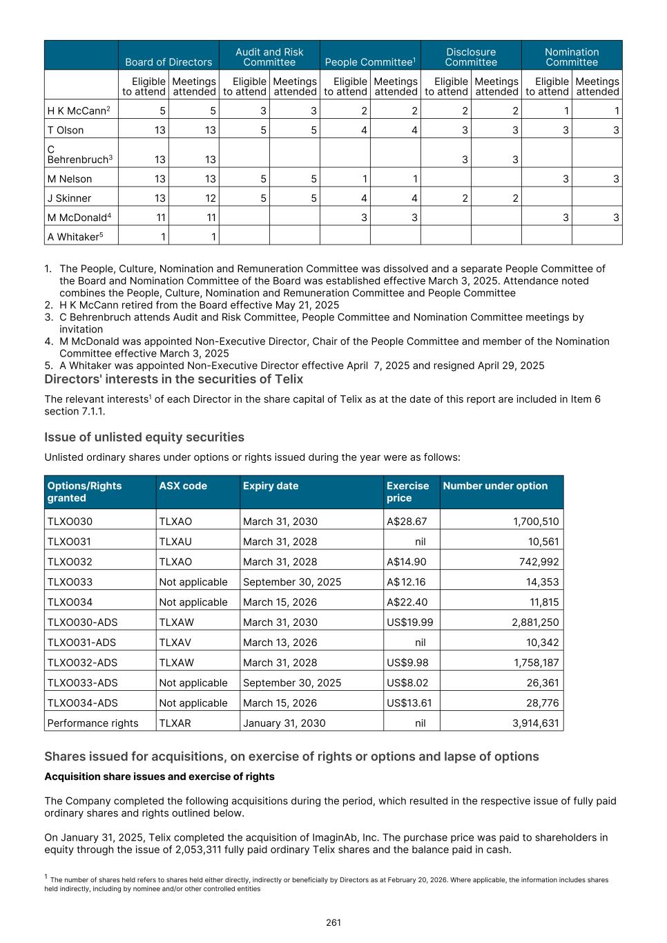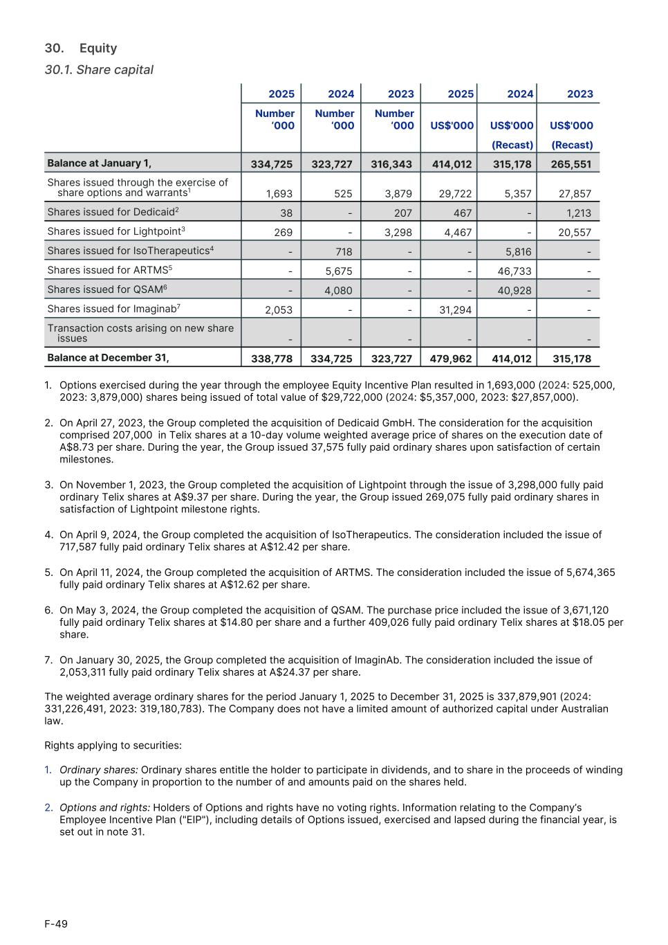 30.     Equity 30.1. Share capital 2025 2024 2023 2025 2024 2023 Number ‘000 Number ‘000 Number ‘000 US$'000 US$'000 US$'0001. (Recast) (Recast) Balance at January 1, 334,725 323,727 316,343 414,012 315,178 265,551 Shares issued through the exercise of share options and warrants1 1,693 525 3,879 29,722 5,357 27,857 Shares issued for Dedicaid2 38 - 207 467 - 1,213 Shares issued for Lightpoint3 269 - 3,298 4,467 - 20,557 Shares issued for IsoTherapeutics4 - 718 - - 5,816 - Shares issued for ARTMS5 - 5,675 - - 46,733 - Shares issued for QSAM6 - 4,080 - - 40,928 - Shares issued for Imaginab7 2,053 - - 31,294 - - Transaction costs arising on new share issues - - - - - - Balance at December 31, 338,778 334,725 323,727 479,962 414,012 315,178 1. Options exercised during the year through the employee Equity Incentive Plan resulted in 1,693,000 (2024: 525,000, 2023: 3,879,000) shares being issued of total value of $29,722,000 (2024: $5,357,000, 2023: $27,857,000). 2. On April 27, 2023, the Group completed the acquisition of Dedicaid GmbH. The consideration for the acquisition comprised 207,000 in Telix shares at a 10-day volume weighted average price of shares on the execution date of A$8.73 per share. During the year, the Group issued 37,575 fully paid ordinary shares upon satisfaction of certain milestones. 3. On November 1, 2023, the Group completed the acquisition of Lightpoint through the issue of 3,298,000 fully paid ordinary Telix shares at A$9.37 per share. During the year, the Group issued 269,075 fully paid ordinary shares in satisfaction of Lightpoint milestone rights. 4. On April 9, 2024, the Group completed the acquisition of IsoTherapeutics. The consideration included the issue of 717,587 fully paid ordinary Telix shares at A$12.42 per share. 5. On April 11, 2024, the Group completed the acquisition of ARTMS. The consideration included the issue of 5,674,365 fully paid ordinary Telix shares at A$12.62 per share. 6. On May 3, 2024, the Group completed the acquisition of QSAM. The purchase price included the issue of 3,671,120 fully paid ordinary Telix shares at $14.80 per share and a further 409,026 fully paid ordinary Telix shares at $18.05 per share. 7. On January 30, 2025, the Group completed the acquisition of ImaginAb. The consideration included the issue of 2,053,311 fully paid ordinary Telix shares at A$24.37 per share. The weighted average ordinary shares for the period January 1, 2025 to December 31, 2025 is 337,879,901 (2024: 331,226,491, 2023: 319,180,783). The Company does not have a limited amount of authorized capital under Australian law. Rights applying to securities: 1. Ordinary shares: Ordinary shares entitle the holder to participate in dividends, and to share in the proceeds of winding up the Company in proportion to the number of and amounts paid on the shares held. 2. Options and rights: Holders of Options and rights have no voting rights. Information relating to the Company’s Employee Incentive Plan ("EIP"), including details of Options issued, exercised and lapsed during the financial year, is set out in note 31. F-49