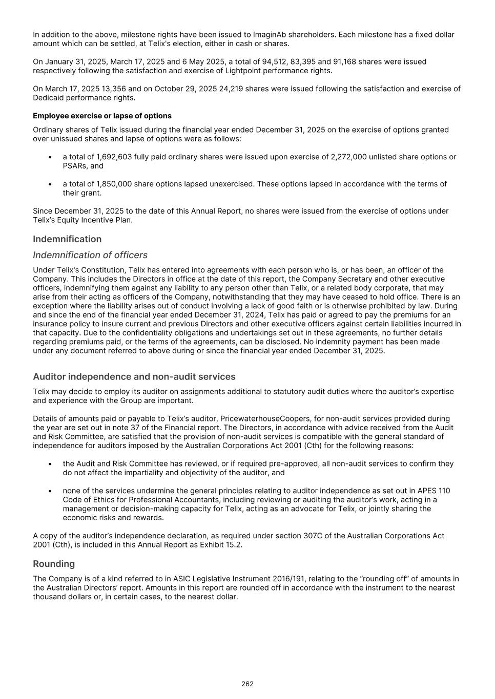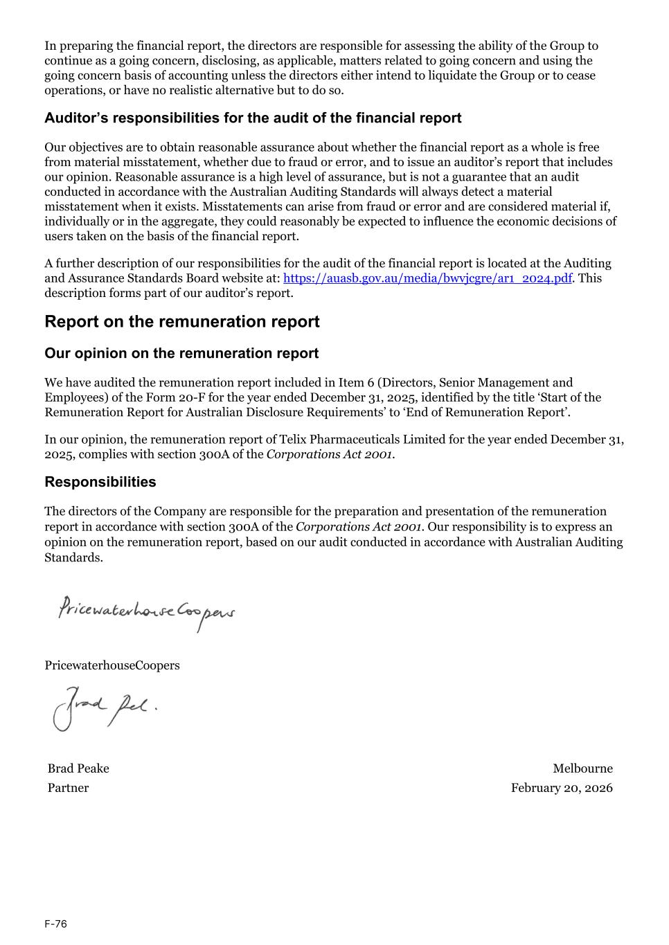 In preparing the financial report, the directors are responsible for assessing the ability of the Group to continue as a going concern, disclosing, as applicable, matters related to going concern and using the going concern basis of accounting unless the directors either intend to liquidate the Group or to cease operations, or have no realistic alternative but to do so. Auditor’s responsibilities for the audit of the financial report Our objectives are to obtain reasonable assurance about whether the financial report as a whole is free from material misstatement, whether due to fraud or error, and to issue an auditor’s report that includes our opinion. Reasonable assurance is a high level of assurance, but is not a guarantee that an audit conducted in accordance with the Australian Auditing Standards will always detect a material misstatement when it exists. Misstatements can arise from fraud or error and are considered material if, individually or in the aggregate, they could reasonably be expected to influence the economic decisions of users taken on the basis of the financial report. A further description of our responsibilities for the audit of the financial report is located at the Auditing and Assurance Standards Board website at: https://auasb.gov.au/media/bwvjcgre/ar1_2024.pdf. This description forms part of our auditor’s report. Report on the remuneration report Our opinion on the remuneration report We have audited the remuneration report included in Item 6 (Directors, Senior Management and Employees) of the Form 20-F for the year ended December 31, 2025, identified by the title ‘Start of the Remuneration Report for Australian Disclosure Requirements’ to ‘End of Remuneration Report’. In our opinion, the remuneration report of Telix Pharmaceuticals Limited for the year ended December 31, 2025, complies with section 300A of the Corporations Act 2001. Responsibilities The directors of the Company are responsible for the preparation and presentation of the remuneration report in accordance with section 300A of the Corporations Act 2001. Our responsibility is to express an opinion on the remuneration report, based on our audit conducted in accordance with Australian Auditing Standards. PricewaterhouseCoopers Brad Peake Melbourne Partner February 20, 2026 F-76