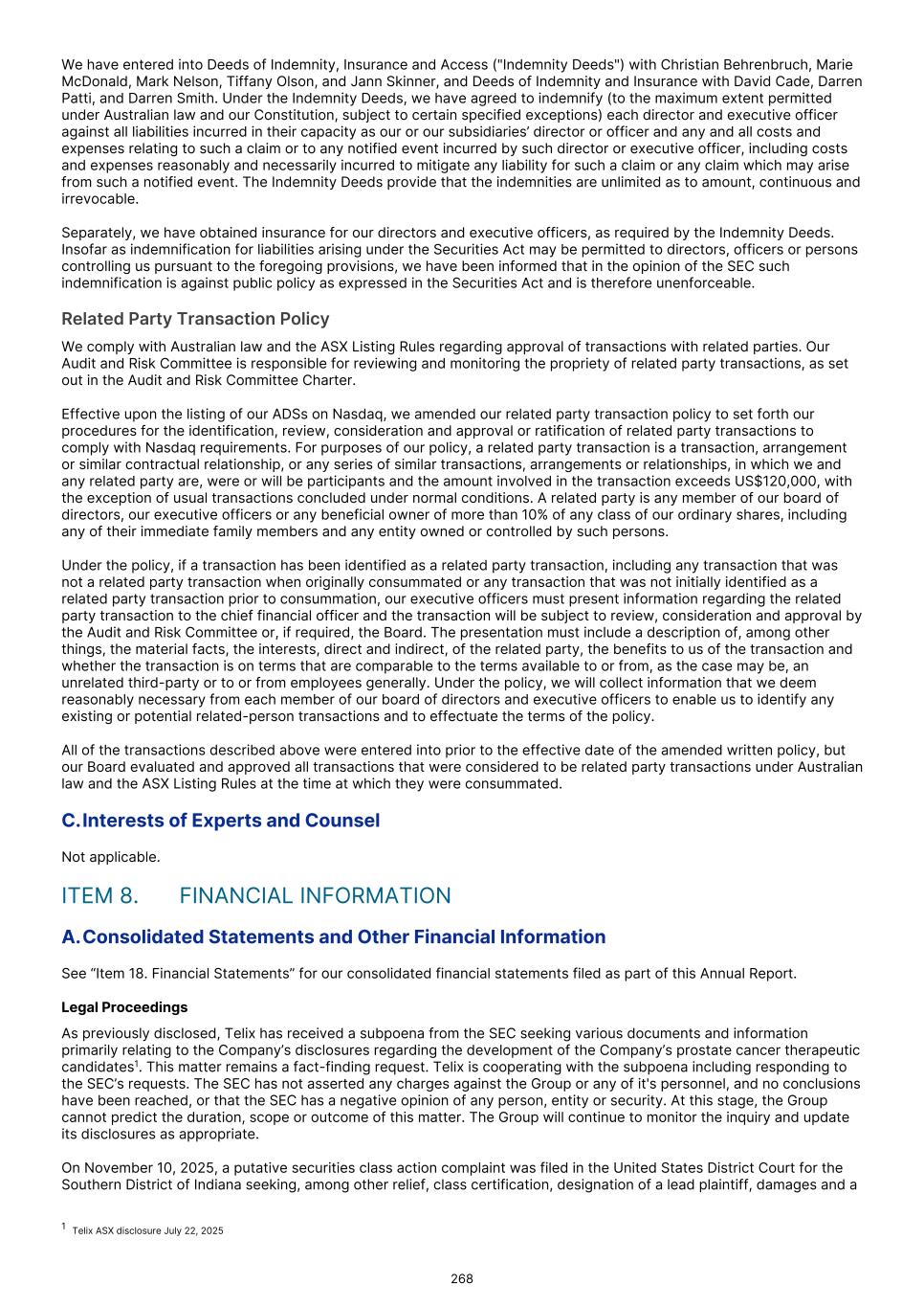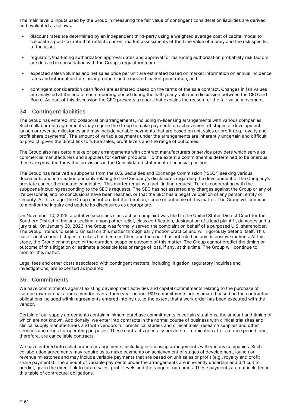 The main level 3 inputs used by the Group in measuring the fair value of contingent consideration liabilities are derived and evaluated as follows: • discount rates are determined by an independent third-party using a weighted average cost of capital model to calculate a post-tax rate that reflects current market assessments of the time value of money and the risk specific to the asset • regulatory/marketing authorization approval dates and approval for marketing authorization probability risk factors are derived in consultation with the Group’s regulatory team • expected sales volumes and net sales price per unit are estimated based on market information on annual incidence rates and information for similar products and expected market penetration, and • contingent consideration cash flows are estimated based on the terms of the sale contract. Changes in fair values are analyzed at the end of each reporting period during the half-yearly valuation discussion between the CFO and Board. As part of this discussion the CFO presents a report that explains the reason for the fair value movement. 34.   Contingent liabilities The Group has entered into collaboration arrangements, including in-licensing arrangements with various companies. Such collaboration agreements may require the Group to make payments on achievement of stages of development, launch or revenue milestones and may include variable payments that are based on unit sales or profit (e.g. royalty and profit share payments). The amount of variable payments under the arrangements are inherently uncertain and difficult to predict, given the direct link to future sales, profit levels and the range of outcomes. The Group also has certain take or pay arrangements with contract manufacturers or service providers which serve as commercial manufacturers and suppliers for certain products. To the extent a commitment is determined to be onerous, these are provided for within provisions in the Consolidated statement of financial position. The Group has received a subpoena from the U.S. Securities and Exchange Commission ("SEC") seeking various documents and information primarily relating to the Company’s disclosures regarding the development of the Company’s prostate cancer therapeutic candidates. This matter remains a fact-finding request. Telix is cooperating with the subpoena including responding to the SEC’s requests. The SEC has not asserted any charges against the Group or any of it's personnel, and no conclusions have been reached, or that the SEC has a negative opinion of any person, entity or security. At this stage, the Group cannot predict the duration, scope or outcome of this matter. The Group will continue to monitor the inquiry and update its disclosures as appropriate. On November 10, 2025, a putative securities class action complaint was filed in the United States District Court for the Southern District of Indiana seeking, among other relief, class certification, designation of a lead plaintiff, damages and a jury trial. On January 20, 2026, the Group was formally served the complaint on behalf of a purposed U.S. shareholder. The Group intends to seek dismissal on this matter through early motion practice and will rigorously defend itself. This case is in its earliest stages; no class has been certified and the court has not ruled on any dispositive motions. At this stage, the Group cannot predict the duration, scope or outcome of this matter. The Group cannot predict the timing or outcome of this litigation or estimate a possible loss or range of loss, if any, at this time. The Group will continue to monitor this matter. Legal fees and other costs associated with contingent matters, including litigation, regulatory inquiries and investigations, are expensed as incurred. 35.   Commitments We have commitments against existing development activities and capital commitments relating to the purchase of isotope raw materials from a vendor over a three year period. R&D commitments are estimated based on the contractual obligations included within agreements entered into by us, to the extent that a work order has been executed with the vendor. Certain of our supply agreements contain minimum purchase commitments in certain situations, the amount and timing of which are not known. Additionally, we enter into contracts in the normal course of business with clinical trial sites and clinical supply manufacturers and with vendors for preclinical studies and clinical trials, research supplies and other services and drugs for operating purposes. These contracts generally provide for termination after a notice period, and, therefore, are cancellable contracts. We have entered into collaboration arrangements, including in-licensing arrangements with various companies. Such collaboration agreements may require us to make payments on achievement of stages of development, launch or revenue milestones and may include variable payments that are based on unit sales or profit (e.g., royalty and profit share payments). The amount of variable payments under the arrangements are inherently uncertain and difficult to predict, given the direct link to future sales, profit levels and the range of outcomes. These payments are not included in this table of contractual obligations. F-61