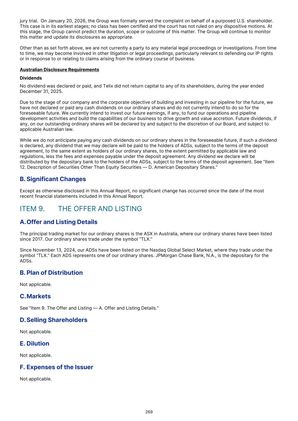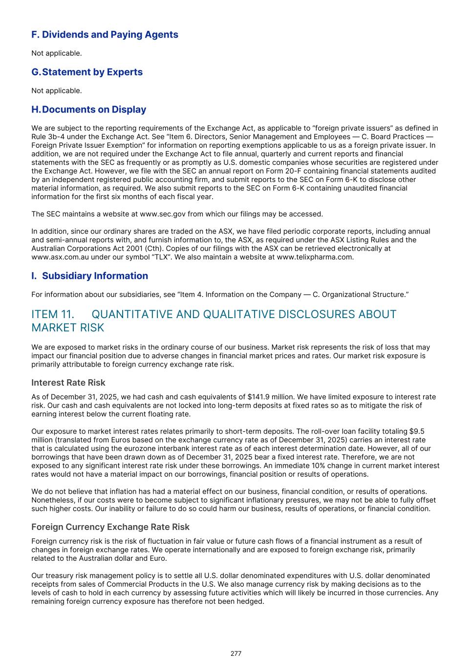 F. Dividends and Paying Agents Not applicable. G.Statement by Experts Not applicable. H.Documents on Display We are subject to the reporting requirements of the Exchange Act, as applicable to “foreign private issuers” as defined in Rule 3b-4 under the Exchange Act. See “Item 6. Directors, Senior Management and Employees — C. Board Practices — Foreign Private Issuer Exemption” for information on reporting exemptions applicable to us as a foreign private issuer. In addition, we are not required under the Exchange Act to file annual, quarterly and current reports and financial statements with the SEC as frequently or as promptly as U.S. domestic companies whose securities are registered under the Exchange Act. However, we file with the SEC an annual report on Form 20-F containing financial statements audited by an independent registered public accounting firm, and submit reports to the SEC on Form 6-K to disclose other material information, as required. We also submit reports to the SEC on Form 6-K containing unaudited financial information for the first six months of each fiscal year. The SEC maintains a website at www.sec.gov from which our filings may be accessed. In addition, since our ordinary shares are traded on the ASX, we have filed periodic corporate reports, including annual and semi-annual reports with, and furnish information to, the ASX, as required under the ASX Listing Rules and the Australian Corporations Act 2001 (Cth). Copies of our filings with the ASX can be retrieved electronically at www.asx.com.au under our symbol “TLX”. We also maintain a website at www.telixpharma.com. I. Subsidiary Information For information about our subsidiaries, see “Item 4. Information on the Company — C. Organizational Structure.” ITEM 11.  QUANTITATIVE AND QUALITATIVE DISCLOSURES ABOUT MARKET RISK We are exposed to market risks in the ordinary course of our business. Market risk represents the risk of loss that may impact our financial position due to adverse changes in financial market prices and rates. Our market risk exposure is primarily attributable to foreign currency exchange rate risk. Interest Rate Risk As of December 31, 2025, we had cash and cash equivalents of $141.9 million. We have limited exposure to interest rate risk. Our cash and cash equivalents are not locked into long-term deposits at fixed rates so as to mitigate the risk of earning interest below the current floating rate. Our exposure to market interest rates relates primarily to short-term deposits. The roll-over loan facility totaling $9.5 million (translated from Euros based on the exchange currency rate as of December 31, 2025) carries an interest rate that is calculated using the eurozone interbank interest rate as of each interest determination date. However, all of our borrowings that have been drawn down as of December 31, 2025 bear a fixed interest rate. Therefore, we are not exposed to any significant interest rate risk under these borrowings. An immediate 10% change in current market interest rates would not have a material impact on our borrowings, financial position or results of operations. We do not believe that inflation has had a material effect on our business, financial condition, or results of operations. Nonetheless, if our costs were to become subject to significant inflationary pressures, we may not be able to fully offset such higher costs. Our inability or failure to do so could harm our business, results of operations, or financial condition. Foreign Currency Exchange Rate Risk Foreign currency risk is the risk of fluctuation in fair value or future cash flows of a financial instrument as a result of changes in foreign exchange rates. We operate internationally and are exposed to foreign exchange risk, primarily related to the Australian dollar and Euro. Our treasury risk management policy is to settle all U.S. dollar denominated expenditures with U.S. dollar denominated receipts from sales of Commercial Products in the U.S. We also manage currency risk by making decisions as to the levels of cash to hold in each currency by assessing future activities which will likely be incurred in those currencies. Any remaining foreign currency exposure has therefore not been hedged. 277