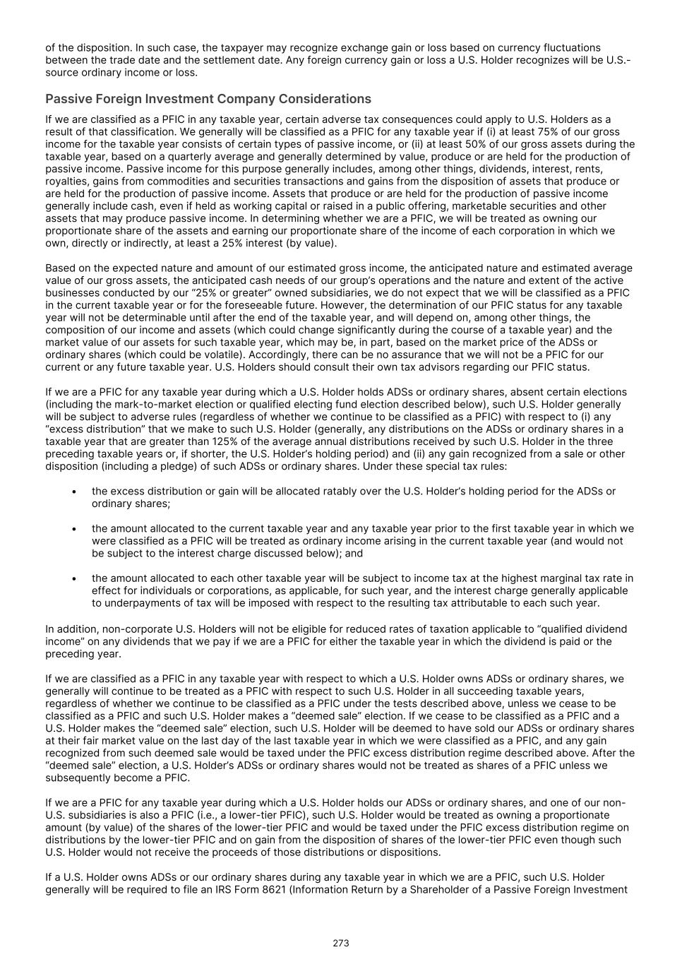 of the disposition. In such case, the taxpayer may recognize exchange gain or loss based on currency fluctuations between the trade date and the settlement date. Any foreign currency gain or loss a U.S. Holder recognizes will be U.S.- source ordinary income or loss. Passive Foreign Investment Company Considerations If we are classified as a PFIC in any taxable year, certain adverse tax consequences could apply to U.S. Holders as a result of that classification. We generally will be classified as a PFIC for any taxable year if (i) at least 75% of our gross income for the taxable year consists of certain types of passive income, or (ii) at least 50% of our gross assets during the taxable year, based on a quarterly average and generally determined by value, produce or are held for the production of passive income. Passive income for this purpose generally includes, among other things, dividends, interest, rents, royalties, gains from commodities and securities transactions and gains from the disposition of assets that produce or are held for the production of passive income. Assets that produce or are held for the production of passive income generally include cash, even if held as working capital or raised in a public offering, marketable securities and other assets that may produce passive income. In determining whether we are a PFIC, we will be treated as owning our proportionate share of the assets and earning our proportionate share of the income of each corporation in which we own, directly or indirectly, at least a 25% interest (by value). Based on the expected nature and amount of our estimated gross income, the anticipated nature and estimated average value of our gross assets, the anticipated cash needs of our group’s operations and the nature and extent of the active businesses conducted by our “25% or greater” owned subsidiaries, we do not expect that we will be classified as a PFIC in the current taxable year or for the foreseeable future. However, the determination of our PFIC status for any taxable year will not be determinable until after the end of the taxable year, and will depend on, among other things, the composition of our income and assets (which could change significantly during the course of a taxable year) and the market value of our assets for such taxable year, which may be, in part, based on the market price of the ADSs or ordinary shares (which could be volatile). Accordingly, there can be no assurance that we will not be a PFIC for our current or any future taxable year. U.S. Holders should consult their own tax advisors regarding our PFIC status. If we are a PFIC for any taxable year during which a U.S. Holder holds ADSs or ordinary shares, absent certain elections (including the mark-to-market election or qualified electing fund election described below), such U.S. Holder generally will be subject to adverse rules (regardless of whether we continue to be classified as a PFIC) with respect to (i) any “excess distribution” that we make to such U.S. Holder (generally, any distributions on the ADSs or ordinary shares in a taxable year that are greater than 125% of the average annual distributions received by such U.S. Holder in the three preceding taxable years or, if shorter, the U.S. Holder’s holding period) and (ii) any gain recognized from a sale or other disposition (including a pledge) of such ADSs or ordinary shares. Under these special tax rules: • the excess distribution or gain will be allocated ratably over the U.S. Holder’s holding period for the ADSs or ordinary shares; • the amount allocated to the current taxable year and any taxable year prior to the first taxable year in which we were classified as a PFIC will be treated as ordinary income arising in the current taxable year (and would not be subject to the interest charge discussed below); and • the amount allocated to each other taxable year will be subject to income tax at the highest marginal tax rate in effect for individuals or corporations, as applicable, for such year, and the interest charge generally applicable to underpayments of tax will be imposed with respect to the resulting tax attributable to each such year. In addition, non-corporate U.S. Holders will not be eligible for reduced rates of taxation applicable to “qualified dividend income” on any dividends that we pay if we are a PFIC for either the taxable year in which the dividend is paid or the preceding year. If we are classified as a PFIC in any taxable year with respect to which a U.S. Holder owns ADSs or ordinary shares, we generally will continue to be treated as a PFIC with respect to such U.S. Holder in all succeeding taxable years, regardless of whether we continue to be classified as a PFIC under the tests described above, unless we cease to be classified as a PFIC and such U.S. Holder makes a “deemed sale” election. If we cease to be classified as a PFIC and a U.S. Holder makes the “deemed sale” election, such U.S. Holder will be deemed to have sold our ADSs or ordinary shares at their fair market value on the last day of the last taxable year in which we were classified as a PFIC, and any gain recognized from such deemed sale would be taxed under the PFIC excess distribution regime described above. After the “deemed sale” election, a U.S. Holder’s ADSs or ordinary shares would not be treated as shares of a PFIC unless we subsequently become a PFIC. If we are a PFIC for any taxable year during which a U.S. Holder holds our ADSs or ordinary shares, and one of our non- U.S. subsidiaries is also a PFIC (i.e., a lower-tier PFIC), such U.S. Holder would be treated as owning a proportionate amount (by value) of the shares of the lower-tier PFIC and would be taxed under the PFIC excess distribution regime on distributions by the lower-tier PFIC and on gain from the disposition of shares of the lower-tier PFIC even though such U.S. Holder would not receive the proceeds of those distribu