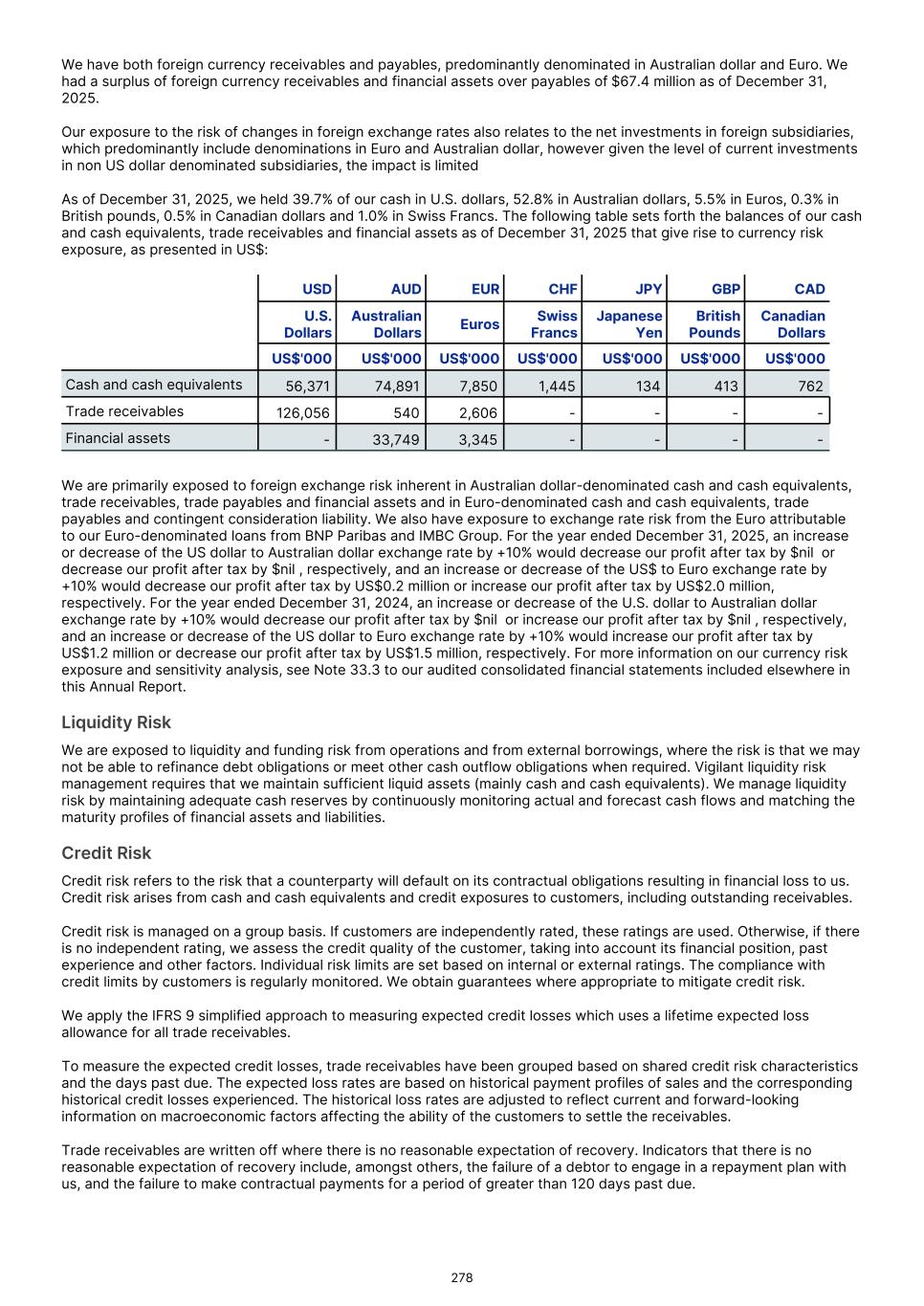 We have both foreign currency receivables and payables, predominantly denominated in Australian dollar and Euro. We had a surplus of foreign currency receivables and financial assets over payables of $67.4 million as of December 31, 2025. Our exposure to the risk of changes in foreign exchange rates also relates to the net investments in foreign subsidiaries, which predominantly include denominations in Euro and Australian dollar, however given the level of current investments in non US dollar denominated subsidiaries, the impact is limited As of December 31, 2025, we held 39.7% of our cash in U.S. dollars, 52.8% in Australian dollars, 5.5% in Euros, 0.3% in British pounds, 0.5% in Canadian dollars and 1.0% in Swiss Francs. The following table sets forth the balances of our cash and cash equivalents, trade receivables and financial assets as of December 31, 2025 that give rise to currency risk exposure, as presented in US$: USD AUD EUR CHF JPY GBP CAD U.S. Dollars Australian Dollars Euros Swiss Francs Japanese Yen British Pounds Canadian Dollars US$'000 US$'000 US$'000 US$'000 US$'000 US$'000 US$'000 Cash and cash equivalents 56,371 74,891 7,850 1,445 134 413 762 Trade receivables 126,056 540 2,606 - - - - Financial assets - 33,749 3,345 - - - - We are primarily exposed to foreign exchange risk inherent in Australian dollar-denominated cash and cash equivalents, trade receivables, trade payables and financial assets and in Euro-denominated cash and cash equivalents, trade payables and contingent consideration liability. We also have exposure to exchange rate risk from the Euro attributable to our Euro-denominated loans from BNP Paribas and IMBC Group. For the year ended December 31, 2025, an increase or decrease of the US dollar to Australian dollar exchange rate by +10% would decrease our profit after tax by $nil or decrease our profit after tax by $nil , respectively, and an increase or decrease of the US$ to Euro exchange rate by +10% would decrease our profit after tax by US$0.2 million or increase our profit after tax by US$2.0 million, respectively. For the year ended December 31, 2024, an increase or decrease of the U.S. dollar to Australian dollar exchange rate by +10% would decrease our profit after tax by $nil or increase our profit after tax by $nil , respectively, and an increase or decrease of the US dollar to Euro exchange rate by +10% would increase our profit after tax by US$1.2 million or decrease our profit after tax by US$1.5 million, respectively. For more information on our currency risk exposure and sensitivity analysis, see Note 33.3 to our audited consolidated financial statements included elsewhere in this Annual Report. Liquidity Risk We are exposed to liquidity and funding risk from operations and from external borrowings, where the risk is that we may not be able to refinance debt obligations or meet other cash outflow obligations when required. Vigilant liquidity risk management requires that we maintain sufficient liquid assets (mainly cash and cash equivalents). We manage liquidity risk by maintaining adequate cash reserves by continuously monitoring actual and forecast cash flows and matching the maturity profiles of financial assets and liabilities. Credit Risk Credit risk refers to the risk that a counterparty will default on its contractual obligations resulting in financial loss to us. Credit risk arises from cash and cash equivalents and credit exposures to customers, including outstanding receivables. Credit risk is managed on a group basis. If customers are independently rated, these ratings are used. Otherwise, if there is no independent rating, we assess the credit quality of the customer, taking into account its financial position, past experience and other factors. Individual risk limits are set based on internal or external ratings. The compliance with credit limits by customers is regularly monitored. We obtain guarantees where appropriate to mitigate credit risk. We apply the IFRS 9 simplified approach to measuring expected credit losses which uses a lifetime expected loss allowance for all trade receivables. To measure the expected credit losses, trade receivables have been grouped based on shared credit risk characteristics and the days past due. The expected loss rates are based on historical payment profiles of sales and the corresponding historical credit losses experienced. The historical loss rates are adjusted to reflect current and forward-looking information on macroeconomic factors affecting the ability of the customers to settle the receivables. Trade receivables are written off where there is no reasonable expectation of recovery. Indicators that there is no reasonable expectation of recovery include, amongst others, the failure of a debtor to engage in a repayment plan with us, and the failure to make contractual payments for a period of greater than 120 days past due. 278