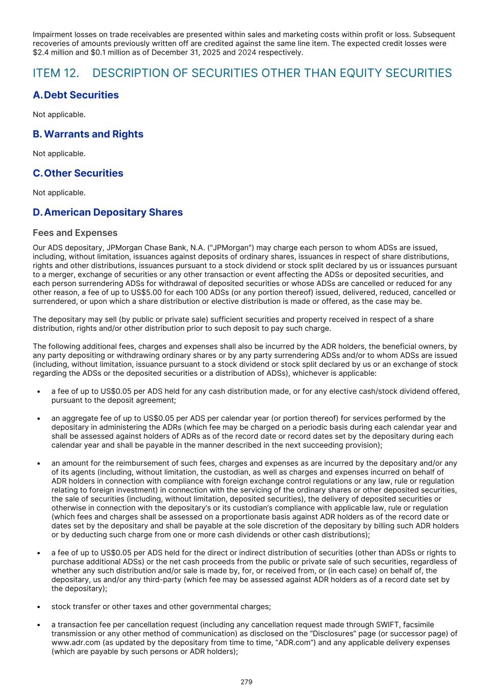 Impairment losses on trade receivables are presented within sales and marketing costs within profit or loss. Subsequent recoveries of amounts previously written off are credited against the same line item. The expected credit losses were $2.4 million and $0.1 million as of December 31, 2025 and 2024 respectively. ITEM 12. DESCRIPTION OF SECURITIES OTHER THAN EQUITY SECURITIES A.Debt Securities Not applicable. B. Warrants and Rights Not applicable. C.Other Securities Not applicable. D.American Depositary Shares Fees and Expenses Our ADS depositary, JPMorgan Chase Bank, N.A. ("JPMorgan") may charge each person to whom ADSs are issued, including, without limitation, issuances against deposits of ordinary shares, issuances in respect of share distributions, rights and other distributions, issuances pursuant to a stock dividend or stock split declared by us or issuances pursuant to a merger, exchange of securities or any other transaction or event affecting the ADSs or deposited securities, and each person surrendering ADSs for withdrawal of deposited securities or whose ADSs are cancelled or reduced for any other reason, a fee of up to US$5.00 for each 100 ADSs (or any portion thereof) issued, delivered, reduced, cancelled or surrendered, or upon which a share distribution or elective distribution is made or offered, as the case may be. The depositary may sell (by public or private sale) sufficient securities and property received in respect of a share distribution, rights and/or other distribution prior to such deposit to pay such charge. The following additional fees, charges and expenses shall also be incurred by the ADR holders, the beneficial owners, by any party depositing or withdrawing ordinary shares or by any party surrendering ADSs and/or to whom ADSs are issued (including, without limitation, issuance pursuant to a stock dividend or stock split declared by us or an exchange of stock regarding the ADSs or the deposited securities or a distribution of ADSs), whichever is applicable: • a fee of up to US$0.05 per ADS held for any cash distribution made, or for any elective cash/stock dividend offered, pursuant to the deposit agreement; • an aggregate fee of up to US$0.05 per ADS per calendar year (or portion thereof) for services performed by the depositary in administering the ADRs (which fee may be charged on a periodic basis during each calendar year and shall be assessed against holders of ADRs as of the record date or record dates set by the depositary during each calendar year and shall be payable in the manner described in the next succeeding provision); • an amount for the reimbursement of such fees, charges and expenses as are incurred by the depositary and/or any of its agents (including, without limitation, the custodian, as well as charges and expenses incurred on behalf of ADR holders in connection with compliance with foreign exchange control regulations or any law, rule or regulation relating to foreign investment) in connection with the servicing of the ordinary shares or other deposited securities, the sale of securities (including, without limitation, deposited securities), the delivery of deposited securities or otherwise in connection with the depositary’s or its custodian’s compliance with applicable law, rule or regulation (which fees and charges shall be assessed on a proportionate basis against ADR holders as of the record date or dates set by the depositary and shall be payable at the sole discretion of the depositary by billing such ADR holders or by deducting such charge from one or more cash dividends or other cash distributions); • a fee of up to US$0.05 per ADS held for the direct or indirect distribution of securities (other than ADSs or rights to purchase additional ADSs) or the net cash proceeds from the public or private sale of such securities, regardless of whether any such distribution and/or sale is made by, for, or received from, or (in each case) on behalf of, the depositary, us and/or any third-party (which fee may be assessed against ADR holders as of a record date set by the depositary); • stock transfer or other taxes and other governmental charges; • a transaction fee per cancellation request (including any cancellation request made through SWIFT, facsimile transmission or any other method of communication) as disclosed on the “Disclosures” page (or successor page) of www.adr.com (as updated by the depositary from time to time, “ADR.com”) and any applicable delivery expenses (which are payable by such persons or ADR holders); 279