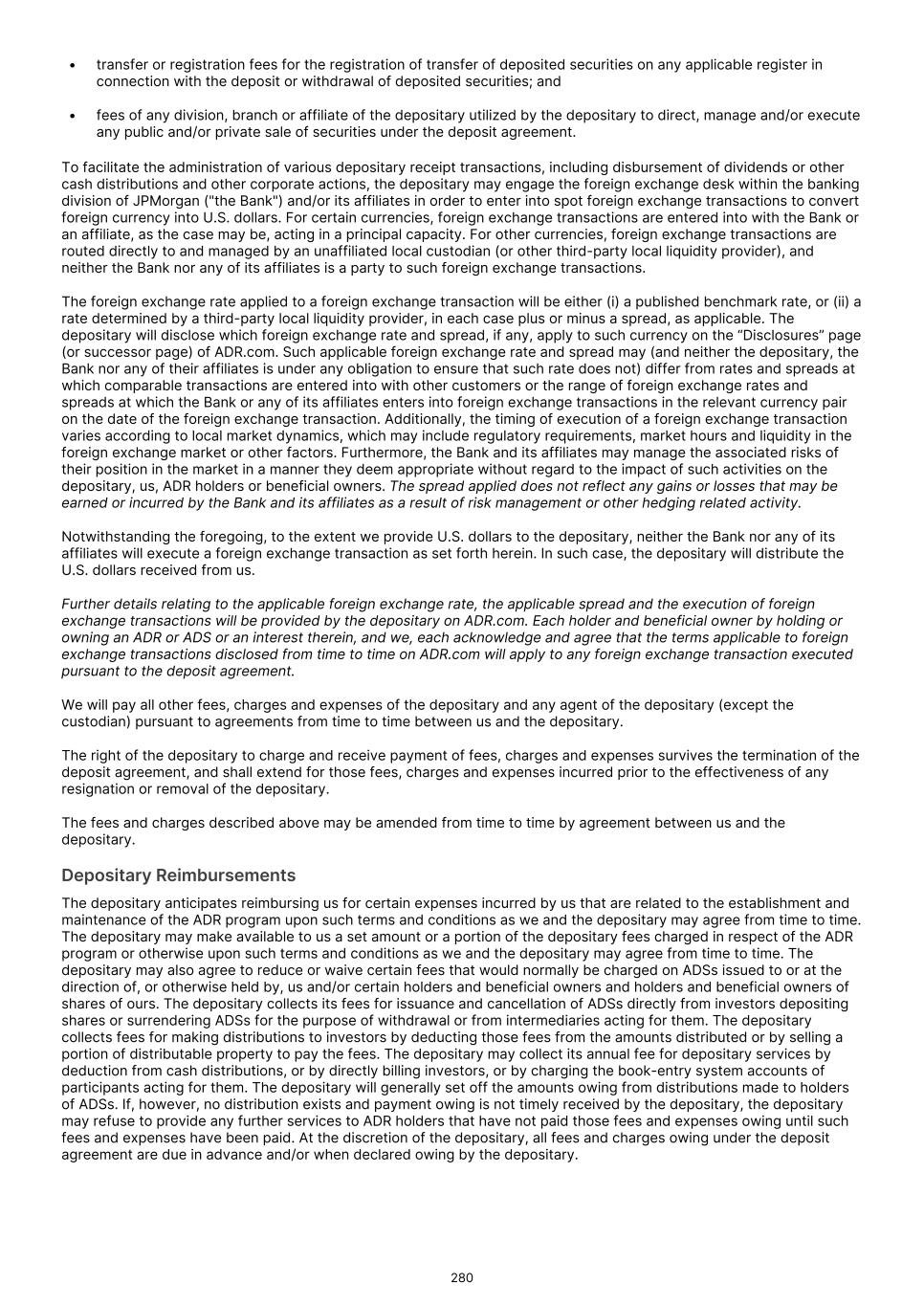 • transfer or registration fees for the registration of transfer of deposited securities on any applicable register in connection with the deposit or withdrawal of deposited securities; and • fees of any division, branch or affiliate of the depositary utilized by the depositary to direct, manage and/or execute any public and/or private sale of securities under the deposit agreement. To facilitate the administration of various depositary receipt transactions, including disbursement of dividends or other cash distributions and other corporate actions, the depositary may engage the foreign exchange desk within the banking division of JPMorgan ("the Bank") and/or its affiliates in order to enter into spot foreign exchange transactions to convert foreign currency into U.S. dollars. For certain currencies, foreign exchange transactions are entered into with the Bank or an affiliate, as the case may be, acting in a principal capacity. For other currencies, foreign exchange transactions are routed directly to and managed by an unaffiliated local custodian (or other third-party local liquidity provider), and neither the Bank nor any of its affiliates is a party to such foreign exchange transactions. The foreign exchange rate applied to a foreign exchange transaction will be either (i) a published benchmark rate, or (ii) a rate determined by a third-party local liquidity provider, in each case plus or minus a spread, as applicable. The depositary will disclose which foreign exchange rate and spread, if any, apply to such currency on the “Disclosures” page (or successor page) of ADR.com. Such applicable foreign exchange rate and spread may (and neither the depositary, the Bank nor any of their affiliates is under any obligation to ensure that such rate does not) differ from rates and spreads at which comparable transactions are entered into with other customers or the range of foreign exchange rates and spreads at which the Bank or any of its affiliates enters into foreign exchange transactions in the relevant currency pair on the date of the foreign exchange transaction. Additionally, the timing of execution of a foreign exchange transaction varies according to local market dynamics, which may include regulatory requirements, market hours and liquidity in the foreign exchange market or other factors. Furthermore, the Bank and its affiliates may manage the associated risks of their position in the market in a manner they deem appropriate without regard to the impact of such activities on the depositary, us, ADR holders or beneficial owners. The spread applied does not reflect any gains or losses that may be earned or incurred by the Bank and its affiliates as a result of risk management or other hedging related activity. Notwithstanding the foregoing, to the extent we provide U.S. dollars to the depositary, neither the Bank nor any of its affiliates will execute a foreign exchange transaction as set forth herein. In such case, the depositary will distribute the U.S. dollars received from us. Further details relating to the applicable foreign exchange rate, the applicable spread and the execution of foreign exchange transactions will be provided by the depositary on ADR.com. Each holder and beneficial owner by holding or owning an ADR or ADS or an interest therein, and we, each acknowledge and agree that the terms applicable to foreign exchange transactions disclosed from time to time on ADR.com will apply to any foreign exchange transaction executed pursuant to the deposit agreement. We will pay all other fees, charges and expenses of the depositary and any agent of the depositary (except the custodian) pursuant to agreements from time to time between us and the depositary. The right of the depositary to charge and receive payment of fees, charges and expenses survives the termination of the deposit agreement, and shall extend for those fees, charges and expenses incurred prior to the effectiveness of any resignation or removal of the depositary. The fees and charges described above may be amended from time to time by agreement between us and the depositary. Depositary Reimbursements The depositary anticipates reimbursing us for certain expenses incurred by us that are related to the establishment and maintenance of the ADR program upon such terms and conditions as we and the depositary may agree from time to time. The depositary may make available to us a set amount or a portion of the depositary fees charged in respect of the ADR program or otherwise upon such terms and conditions as we and the depositary may agree from time to time. The depositary may also agree to reduce or waive certain fees that would normally be charged on ADSs issued to or at the direction of, or otherwise held by, us and/or certain holders and beneficial owners and holders and beneficial owners of shares of ours. The depositary collects its fees for issuance and cancellation of ADSs directly from investors depositing shares or surrendering ADSs for the purpose of withdrawal or from intermediaries acting for them. The depositary collects fees for making distributions to investors by deducting those fees from the amounts distributed or by selling a portion of distributable property to pay the fees. The depositary may collect its annual fee for depositary services by deduction from cash distributions, or by directly billing investors, or by charging the book-entry system accounts of participants acting for them. The depositary will generally set off the amounts owing from distributions made to holders of ADSs. If, however, no distribution exists and payment owing is not timely received by the depositary, the depositary may refuse to provide any further services to ADR holders that have not paid those fees and expenses owing until such fees and expenses have been paid. At the discretion of the depositary, all fees and charges owing under the deposit agreement are due in advance and/or when declared owing by the deposit