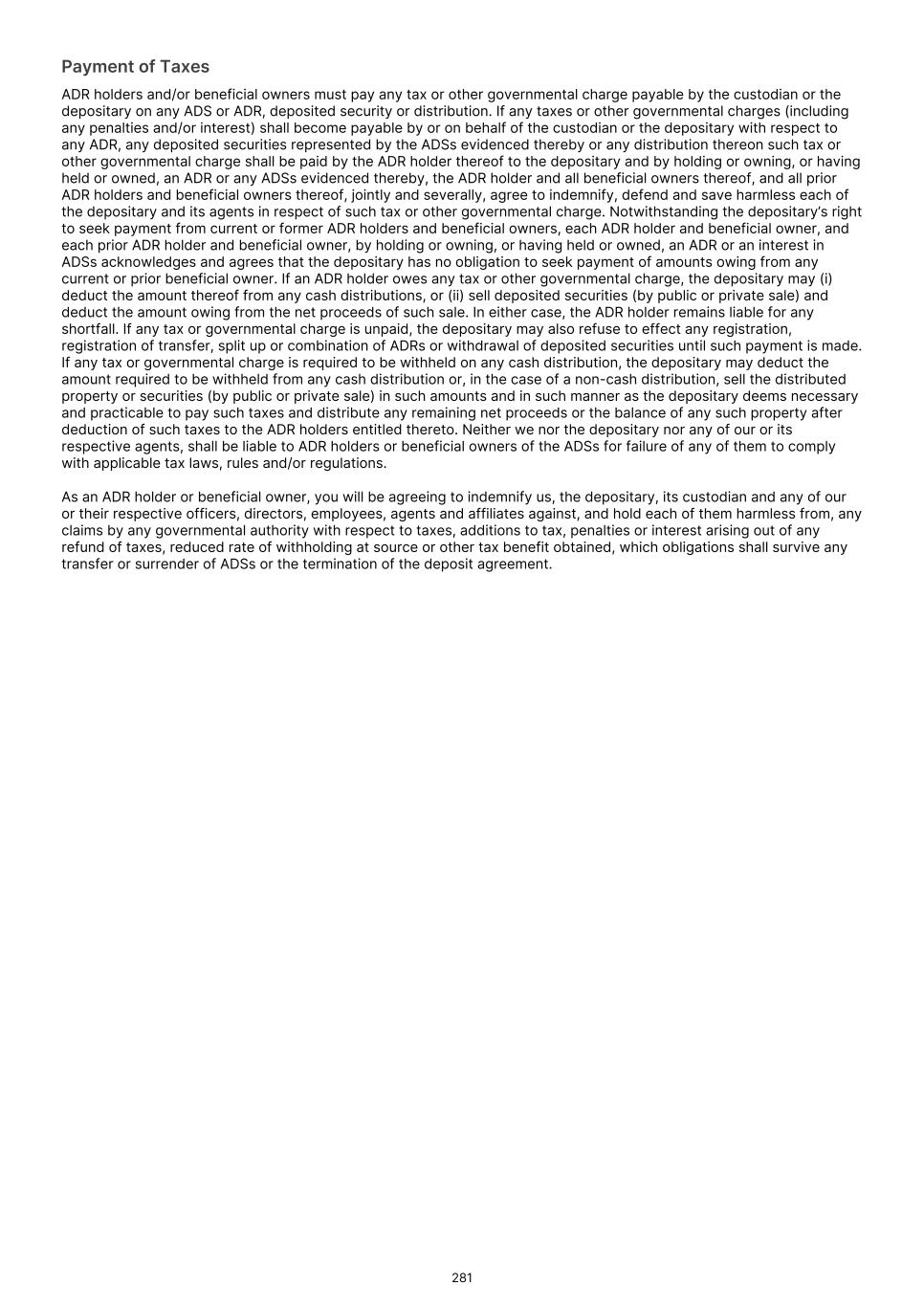 Payment of Taxes ADR holders and/or beneficial owners must pay any tax or other governmental charge payable by the custodian or the depositary on any ADS or ADR, deposited security or distribution. If any taxes or other governmental charges (including any penalties and/or interest) shall become payable by or on behalf of the custodian or the depositary with respect to any ADR, any deposited securities represented by the ADSs evidenced thereby or any distribution thereon such tax or other governmental charge shall be paid by the ADR holder thereof to the depositary and by holding or owning, or having held or owned, an ADR or any ADSs evidenced thereby, the ADR holder and all beneficial owners thereof, and all prior ADR holders and beneficial owners thereof, jointly and severally, agree to indemnify, defend and save harmless each of the depositary and its agents in respect of such tax or other governmental charge. Notwithstanding the depositary’s right to seek payment from current or former ADR holders and beneficial owners, each ADR holder and beneficial owner, and each prior ADR holder and beneficial owner, by holding or owning, or having held or owned, an ADR or an interest in ADSs acknowledges and agrees that the depositary has no obligation to seek payment of amounts owing from any current or prior beneficial owner. If an ADR holder owes any tax or other governmental charge, the depositary may (i) deduct the amount thereof from any cash distributions, or (ii) sell deposited securities (by public or private sale) and deduct the amount owing from the net proceeds of such sale. In either case, the ADR holder remains liable for any shortfall. If any tax or governmental charge is unpaid, the depositary may also refuse to effect any registration, registration of transfer, split up or combination of ADRs or withdrawal of deposited securities until such payment is made. If any tax or governmental charge is required to be withheld on any cash distribution, the depositary may deduct the amount required to be withheld from any cash distribution or, in the case of a non-cash distribution, sell the distributed property or securities (by public or private sale) in such amounts and in such manner as the depositary deems necessary and practicable to pay such taxes and distribute any remaining net proceeds or the balance of any such property after deduction of such taxes to the ADR holders entitled thereto. Neither we nor the depositary nor any of our or its respective agents, shall be liable to ADR holders or beneficial owners of the ADSs for failure of any of them to comply with applicable tax laws, rules and/or regulations. As an ADR holder or beneficial owner, you will be agreeing to indemnify us, the depositary, its custodian and any of our or their respective officers, directors, employees, agents and affiliates against, and hold each of them harmless from, any claims by any governmental authority with respect to taxes, additions to tax, penalties or interest arising out of any refund of taxes, reduced rate of withholding at source or other tax benefit obtained, which obligations shall survive any transfer or surrender of ADSs or the termination of the deposit agreement. 281