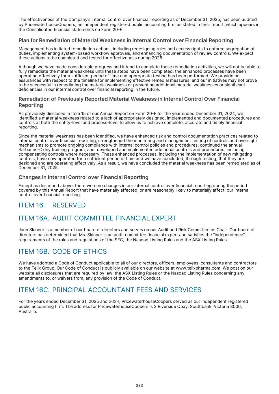 The effectiveness of the Company’s internal control over financial reporting as of December 31, 2025, has been audited by PricewaterhouseCoopers, an independent registered public accounting firm as stated in their report, which appears in the Consolidated financial statements on Form 20-F. Plan for Remediation of Material Weakness in Internal Control over Financial Reporting Management has initiated remediation actions, including redesigning roles and access rights to enforce segregation of duties, implementing system-based workflow approvals, and enhancing documentation of review controls. We expect these actions to be completed and tested for effectiveness during 2026. Although we have made considerable progress and intend to complete these remediation activities, we will not be able to fully remediate the material weakness until these steps have been completed, the enhanced processes have been operating effectively for a sufficient period of time and appropriate testing has been performed. We provide no assurances with respect to the timeline for implementing effective remedial measures, and our initiatives may not prove to be successful in remediating the material weakness or preventing additional material weaknesses or significant deficiencies in our internal control over financial reporting in the future. Remediation of Previously Reported Material Weakness in Internal Control Over Financial Reporting As previously disclosed in Item 15 of our Annual Report on Form 20-F for the year ended December 31, 2024, we identified a material weakness related to a lack of appropriately designed, implemented and documented procedures and controls at both the entity-level and process-level to allow us to achieve complete, accurate and timely financial reporting. Since the material weakness has been identified, we have enhanced risk and control documentation practices related to internal control over financial reporting, strengthened the monitoring and management testing of controls and oversight mechanisms to promote ongoing compliance with internal control policies and procedures, continued the annual Sarbanes-Oxley training program, and developed and implemented additional controls and procedures, including compensating controls where necessary. These enhanced processes, including the implementation of new mitigating controls, have now operated for a sufficient period of time and we have concluded, through testing, that they are designed and are operating effectively. As a result, we have concluded the material weakness has been remediated as of December 31, 2025. Changes in Internal Control over Financial Reporting Except as described above, there were no changes in our internal control over financial reporting during the period covered by this Annual Report that have materially affected, or are reasonably likely to materially affect, our internal control over financial reporting. ITEM 16. RESERVED ITEM 16A. AUDIT COMMITTEE FINANCIAL EXPERT Jann Skinner is a member of our board of directors and serves on our Audit and Risk Committee as Chair. Our board of directors has determined that Ms. Skinner is an audit committee financial expert and satisfies the “independence” requirements of the rules and regulations of the SEC, the Nasdaq Listing Rules and the ASX Listing Rules. ITEM 16B. CODE OF ETHICS We have adopted a Code of Conduct applicable to all of our directors, officers, employees, consultants and contractors to the Telix Group. Our Code of Conduct is publicly available on our website at www.telixpharma.com. We post on our website all disclosures that are required by law, the ASX Listing Rules or the Nasdaq Listing Rules concerning any amendments to, or waivers from, any provision of the Code of Conduct. ITEM 16C. PRINCIPAL ACCOUNTANT FEES AND SERVICES For the years ended December 31, 2025 and 2024, PricewaterhouseCoopers served as our independent registered public accounting firm. The address for PricewaterhouseCoopers is 2 Riverside Quay, Southbank, Victoria 3006, Australia. 283