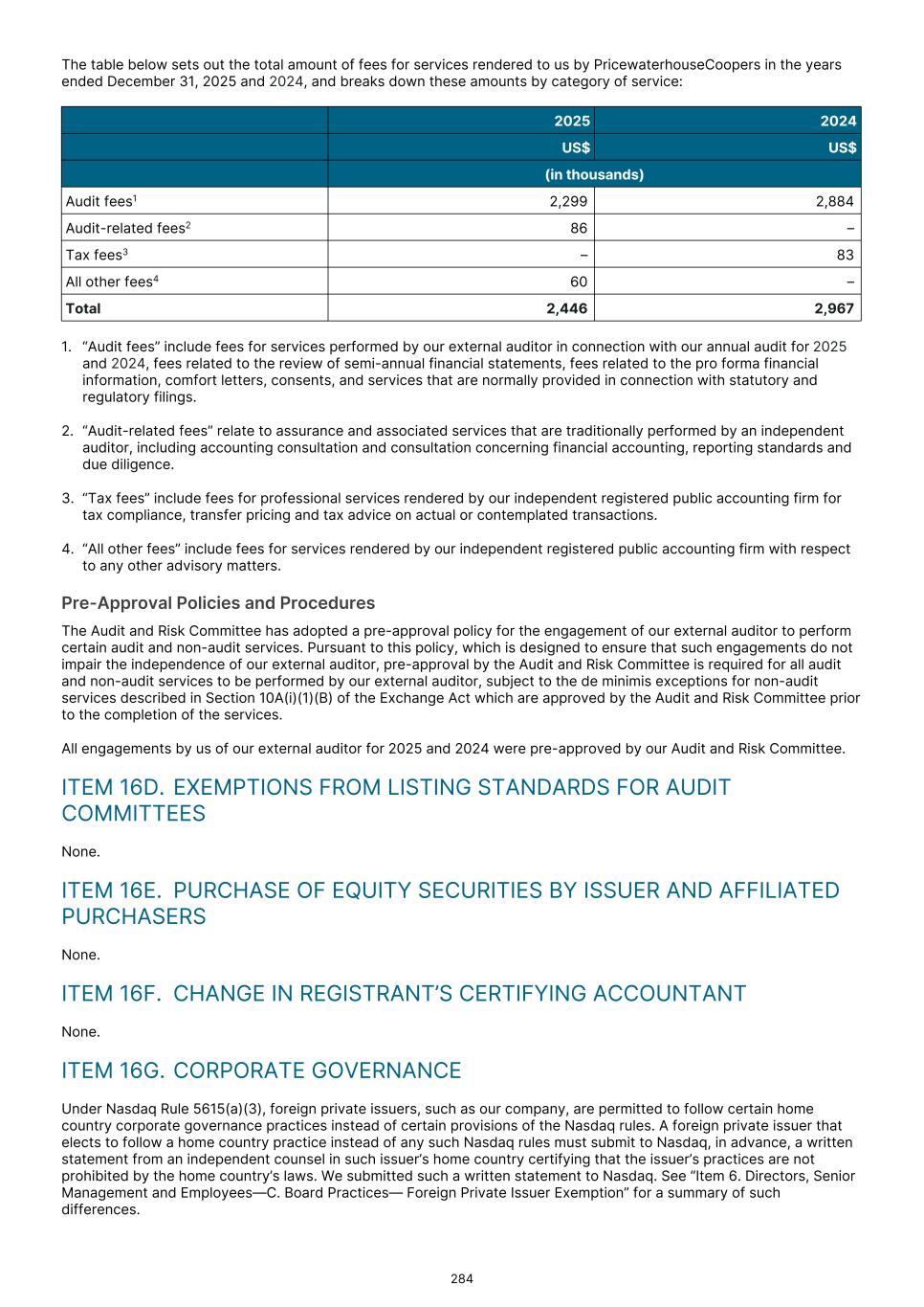 The table below sets out the total amount of fees for services rendered to us by PricewaterhouseCoopers in the years ended December 31, 2025 and 2024, and breaks down these amounts by category of service: 2025 2024 US$ US$ (in thousands) Audit fees1 2,299 2,884 Audit-related fees2 86 – Tax fees3 – 83 All other fees4 60 – Total 2,446 2,967 1. “Audit fees” include fees for services performed by our external auditor in connection with our annual audit for 2025 and 2024, fees related to the review of semi-annual financial statements, fees related to the pro forma financial information, comfort letters, consents, and services that are normally provided in connection with statutory and regulatory filings. 2. “Audit-related fees” relate to assurance and associated services that are traditionally performed by an independent auditor, including accounting consultation and consultation concerning financial accounting, reporting standards and due diligence. 3. “Tax fees” include fees for professional services rendered by our independent registered public accounting firm for tax compliance, transfer pricing and tax advice on actual or contemplated transactions. 4. “All other fees” include fees for services rendered by our independent registered public accounting firm with respect to any other advisory matters. Pre-Approval Policies and Procedures The Audit and Risk Committee has adopted a pre-approval policy for the engagement of our external auditor to perform certain audit and non-audit services. Pursuant to this policy, which is designed to ensure that such engagements do not impair the independence of our external auditor, pre-approval by the Audit and Risk Committee is required for all audit and non-audit services to be performed by our external auditor, subject to the de minimis exceptions for non-audit services described in Section 10A(i)(1)(B) of the Exchange Act which are approved by the Audit and Risk Committee prior to the completion of the services. All engagements by us of our external auditor for 2025 and 2024 were pre-approved by our Audit and Risk Committee. ITEM 16D. EXEMPTIONS FROM LISTING STANDARDS FOR AUDIT COMMITTEES None. ITEM 16E. PURCHASE OF EQUITY SECURITIES BY ISSUER AND AFFILIATED PURCHASERS None. ITEM 16F. CHANGE IN REGISTRANT’S CERTIFYING ACCOUNTANT None. ITEM 16G. CORPORATE GOVERNANCE Under Nasdaq Rule 5615(a)(3), foreign private issuers, such as our company, are permitted to follow certain home country corporate governance practices instead of certain provisions of the Nasdaq rules. A foreign private issuer that elects to follow a home country practice instead of any such Nasdaq rules must submit to Nasdaq, in advance, a written statement from an independent counsel in such issuer’s home country certifying that the issuer’s practices are not prohibited by the home country’s laws. We submitted such a written statement to Nasdaq. See “Item 6. Directors, Senior Management and Employees—C. Board Practices— Foreign Private Issuer Exemption” for a summary of such differences. 284