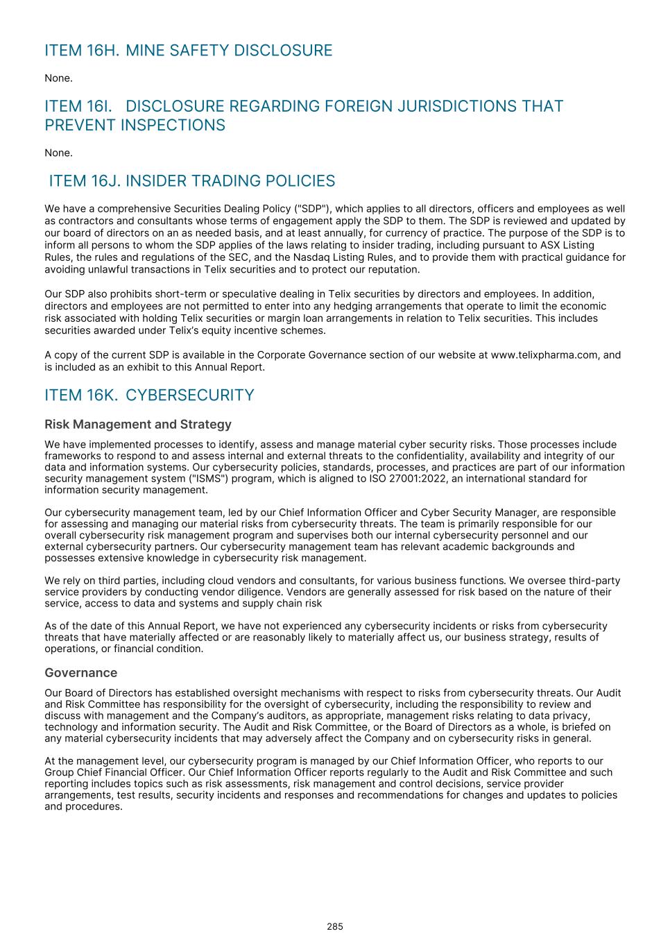 ITEM 16H. MINE SAFETY DISCLOSURE None. ITEM 16I. DISCLOSURE REGARDING FOREIGN JURISDICTIONS THAT PREVENT INSPECTIONS None. ITEM 16J. INSIDER TRADING POLICIES We have a comprehensive Securities Dealing Policy ("SDP"), which applies to all directors, officers and employees as well as contractors and consultants whose terms of engagement apply the SDP to them. The SDP is reviewed and updated by our board of directors on an as needed basis, and at least annually, for currency of practice. The purpose of the SDP is to inform all persons to whom the SDP applies of the laws relating to insider trading, including pursuant to ASX Listing Rules, the rules and regulations of the SEC, and the Nasdaq Listing Rules, and to provide them with practical guidance for avoiding unlawful transactions in Telix securities and to protect our reputation. Our SDP also prohibits short-term or speculative dealing in Telix securities by directors and employees. In addition, directors and employees are not permitted to enter into any hedging arrangements that operate to limit the economic risk associated with holding Telix securities or margin loan arrangements in relation to Telix securities. This includes securities awarded under Telix’s equity incentive schemes. A copy of the current SDP is available in the Corporate Governance section of our website at www.telixpharma.com, and is included as an exhibit to this Annual Report. ITEM 16K. CYBERSECURITY Risk Management and Strategy We have implemented processes to identify, assess and manage material cyber security risks. Those processes include frameworks to respond to and assess internal and external threats to the confidentiality, availability and integrity of our data and information systems. Our cybersecurity policies, standards, processes, and practices are part of our information security management system ("ISMS") program, which is aligned to ISO 27001:2022, an international standard for information security management. Our cybersecurity management team, led by our Chief Information Officer and Cyber Security Manager, are responsible for assessing and managing our material risks from cybersecurity threats. The team is primarily responsible for our overall cybersecurity risk management program and supervises both our internal cybersecurity personnel and our external cybersecurity partners. Our cybersecurity management team has relevant academic backgrounds and possesses extensive knowledge in cybersecurity risk management. We rely on third parties, including cloud vendors and consultants, for various business functions. We oversee third-party service providers by conducting vendor diligence. Vendors are generally assessed for risk based on the nature of their service, access to data and systems and supply chain risk As of the date of this Annual Report, we have not experienced any cybersecurity incidents or risks from cybersecurity threats that have materially affected or are reasonably likely to materially affect us, our business strategy, results of operations, or financial condition. Governance Our Board of Directors has established oversight mechanisms with respect to risks from cybersecurity threats. Our Audit and Risk Committee has responsibility for the oversight of cybersecurity, including the responsibility to review and discuss with management and the Company’s auditors, as appropriate, management risks relating to data privacy, technology and information security. The Audit and Risk Committee, or the Board of Directors as a whole, is briefed on any material cybersecurity incidents that may adversely affect the Company and on cybersecurity risks in general. At the management level, our cybersecurity program is managed by our Chief Information Officer, who reports to our Group Chief Financial Officer. Our Chief Information Officer reports regularly to the Audit and Risk Committee and such reporting includes topics such as risk assessments, risk management and control decisions, service provider arrangements, test results, security incidents and responses and recommendations for changes and updates to policies and procedures. 285