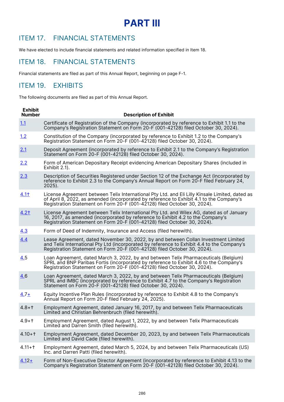 PART III ITEM 17. FINANCIAL STATEMENTS We have elected to include financial statements and related information specified in Item 18. ITEM 18. FINANCIAL STATEMENTS Financial statements are filed as part of this Annual Report, beginning on page F-1. ITEM 19. EXHIBITS The following documents are filed as part of this Annual Report. Exhibit Number Description of Exhibit 1.1 Certificate of Registration of the Company (incorporated by reference to Exhibit 1.1 to the Company’s Registration Statement on Form 20-F (001-42128) filed October 30, 2024). 1.2 Constitution of the Company (incorporated by reference to Exhibit 1.2 to the Company’s Registration Statement on Form 20-F (001-42128) filed October 30, 2024). 2.1 Deposit Agreement (incorporated by reference to Exhibit 2.1 to the Company’s Registration Statement on Form 20-F (001-42128) filed October 30, 2024). 2.2 Form of American Depositary Receipt evidencing American Depositary Shares (included in Exhibit 2.1). 2.3 Description of Securities Registered under Section 12 of the Exchange Act (incorporated by reference to Exhibit 2.3 to the Company’s Annual Report on Form 20-F filed February 24, 2025). 4.1† License Agreement between Telix International Pty Ltd. and Eli Lilly Kinsale Limited, dated as of April 8, 2022, as amended (incorporated by reference to Exhibit 4.1 to the Company’s Registration Statement on Form 20-F (001-42128) filed October 30, 2024). 4.2† License Agreement between Telix International Pty Ltd. and Wilex AG, dated as of January 16, 2017, as amended (incorporated by reference to Exhibit 4.2 to the Company’s Registration Statement on Form 20-F (001-42128) filed October 30, 2024). 4.3 Form of Deed of Indemnity, Insurance and Access (filed herewith). 4.4 Lease Agreement, dated November 30, 2022, by and between Collan Investment Limited and Telix International Pty Ltd (incorporated by reference to Exhibit 4.4 to the Company’s Registration Statement on Form 20-F (001-42128) filed October 30, 2024). 4.5 Loan Agreement, dated March 3, 2022, by and between Telix Pharmaceuticals (Belgium) SPRL and BNP Paribas Fortis (incorporated by reference to Exhibit 4.6 to the Company’s Registration Statement on Form 20-F (001-42128) filed October 30, 2024). 4.6 Loan Agreement, dated March 3, 2022, by and between Telix Pharmaceuticals (Belgium) SPRL and IMBC (incorporated by reference to Exhibit 4.7 to the Company’s Registration Statement on Form 20-F (001-42128) filed October 30, 2024). 4.7+ Equity Incentive Plan Rules (incorporated by reference to Exhibit 4.8 to the Company’s Annual Report on Form 20-F filed February 24, 2025). 4.8+† Employment Agreement, dated January 16, 2017, by and between Telix Pharmaceuticals Limited and Christian Behrenbruch (filed herewith). 4.9+† Employment Agreement, dated August 1, 2022, by and between Telix Pharmaceuticals Limited and Darren Smith (filed herewith). 4.10+† Employment Agreement, dated December 20, 2023, by and between Telix Pharmaceuticals Limited and David Cade (filed herewith). 4.11+† Employment Agreement, dated March 5, 2024, by and between Telix Pharmaceuticals (US) Inc. and Darren Patti (filed herewith). 4.12+ Form of Non-Executive Director Agreement (incorporated by reference to Exhibit 4.13 to the Company’s Registration Statement on Form 20-F (001-42128) filed October 30, 2024). 286