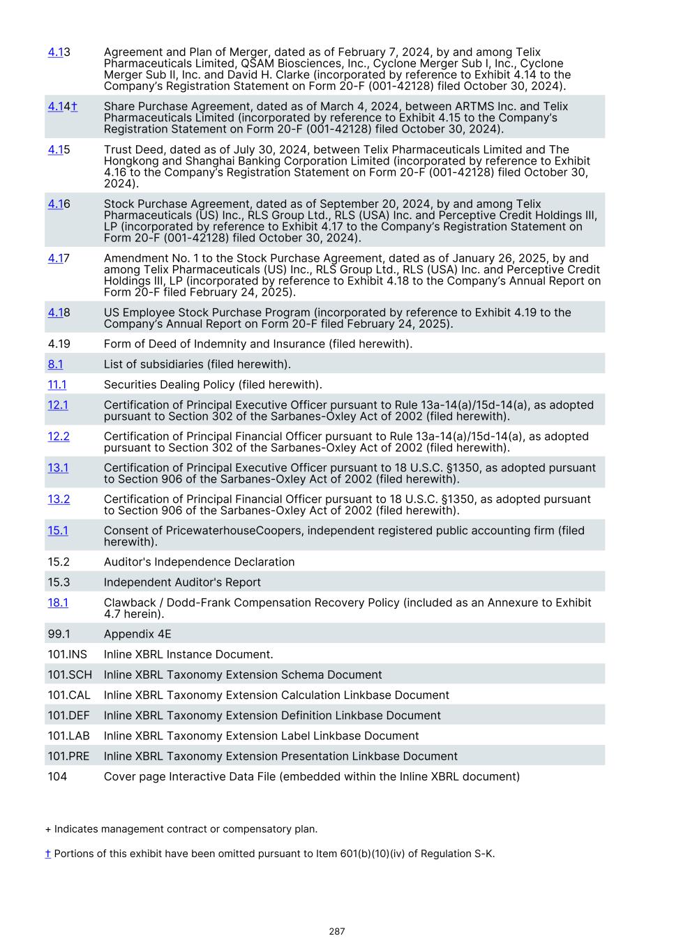 4.13 Agreement and Plan of Merger, dated as of February 7, 2024, by and among Telix Pharmaceuticals Limited, QSAM Biosciences, Inc., Cyclone Merger Sub I, Inc., Cyclone Merger Sub II, Inc. and David H. Clarke (incorporated by reference to Exhibit 4.14 to the Company’s Registration Statement on Form 20-F (001-42128) filed October 30, 2024). 4.14† Share Purchase Agreement, dated as of March 4, 2024, between ARTMS Inc. and Telix Pharmaceuticals Limited (incorporated by reference to Exhibit 4.15 to the Company’s Registration Statement on Form 20-F (001-42128) filed October 30, 2024). 4.15 Trust Deed, dated as of July 30, 2024, between Telix Pharmaceuticals Limited and The Hongkong and Shanghai Banking Corporation Limited (incorporated by reference to Exhibit 4.16 to the Company’s Registration Statement on Form 20-F (001-42128) filed October 30, 2024). 4.16 Stock Purchase Agreement, dated as of September 20, 2024, by and among Telix Pharmaceuticals (US) Inc., RLS Group Ltd., RLS (USA) Inc. and Perceptive Credit Holdings III, LP (incorporated by reference to Exhibit 4.17 to the Company’s Registration Statement on Form 20-F (001-42128) filed October 30, 2024). 4.17 Amendment No. 1 to the Stock Purchase Agreement, dated as of January 26, 2025, by and among Telix Pharmaceuticals (US) Inc., RLS Group Ltd., RLS (USA) Inc. and Perceptive Credit Holdings III, LP (incorporated by reference to Exhibit 4.18 to the Company’s Annual Report on Form 20-F filed February 24, 2025). 4.18 US Employee Stock Purchase Program (incorporated by reference to Exhibit 4.19 to the Company’s Annual Report on Form 20-F filed February 24, 2025). 4.19 Form of Deed of Indemnity and Insurance (filed herewith). 8.1 List of subsidiaries (filed herewith). 11.1 Securities Dealing Policy (filed herewith). 12.1 Certification of Principal Executive Officer pursuant to Rule 13a-14(a)/15d-14(a), as adopted pursuant to Section 302 of the Sarbanes-Oxley Act of 2002 (filed herewith). 12.2 Certification of Principal Financial Officer pursuant to Rule 13a-14(a)/15d-14(a), as adopted pursuant to Section 302 of the Sarbanes-Oxley Act of 2002 (filed herewith). 13.1 Certification of Principal Executive Officer pursuant to 18 U.S.C. §1350, as adopted pursuant to Section 906 of the Sarbanes-Oxley Act of 2002 (filed herewith). 13.2 Certification of Principal Financial Officer pursuant to 18 U.S.C. §1350, as adopted pursuant to Section 906 of the Sarbanes-Oxley Act of 2002 (filed herewith). 15.1 Consent of PricewaterhouseCoopers, independent registered public accounting firm (filed herewith). 15.2 Auditor's Independence Declaration 15.3 Independent Auditor's Report 18.1 Clawback / Dodd-Frank Compensation Recovery Policy (included as an Annexure to Exhibit 4.7 herein). 99.1 Appendix 4E 101.INS Inline XBRL Instance Document. 101.SCH Inline XBRL Taxonomy Extension Schema Document 101.CAL Inline XBRL Taxonomy Extension Calculation Linkbase Document 101.DEF Inline XBRL Taxonomy Extension Definition Linkbase Document 101.LAB Inline XBRL Taxonomy Extension Label Linkbase Document 101.PRE Inline XBRL Taxonomy Extension Presentation Linkbase Document 104 Cover page Interactive Data File (embedded within the Inline XBRL document) + Indicates management contract or compensatory plan. † Portions of this exhibit have been omitted pursuant to Item 601(b)(10)(iv) of Regulation S-K. 287