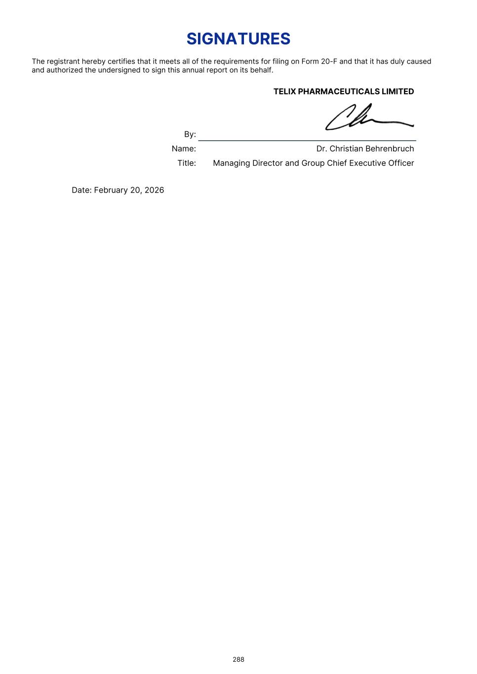 SIGNATURES The registrant hereby certifies that it meets all of the requirements for filing on Form 20-F and that it has duly caused and authorized the undersigned to sign this annual report on its behalf. TELIX PHARMACEUTICALS LIMITED By: Name: Dr. Christian Behrenbruch Title: Managing Director and Group Chief Executive Officer Date: February 20, 2026 288