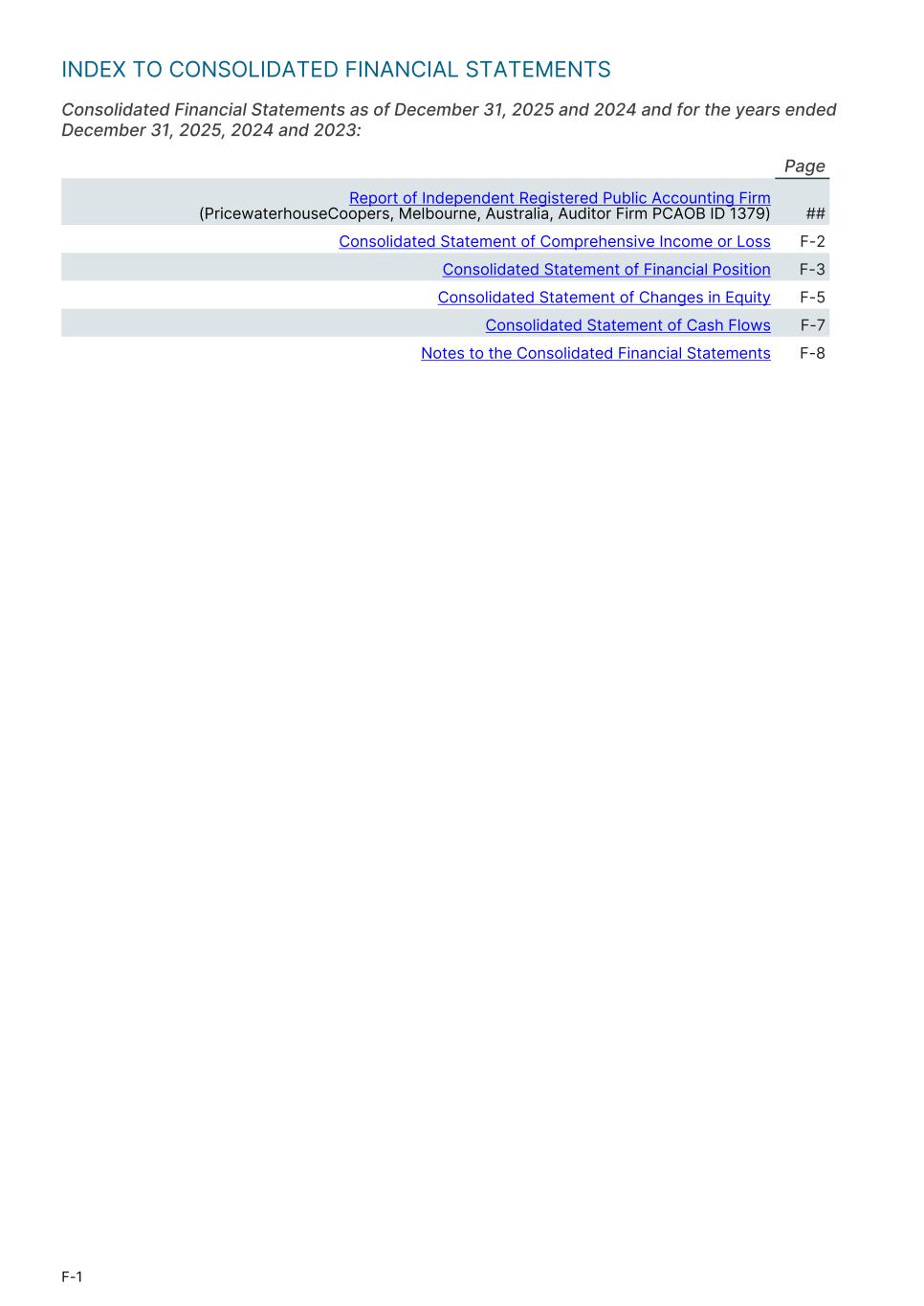 INDEX TO CONSOLIDATED FINANCIAL STATEMENTS Consolidated Financial Statements as of December 31, 2025 and 2024 and for the years ended December 31, 2025, 2024 and 2023: Page Report of Independent Registered Public Accounting Firm (PricewaterhouseCoopers, Melbourne, Australia, Auditor Firm PCAOB ID 1379) ## Consolidated Statement of Comprehensive Income or Loss F-2 Consolidated Statement of Financial Position F-3 Consolidated Statement of Changes in Equity F-5 Consolidated Statement of Cash Flows F-7 Notes to the Consolidated Financial Statements F-8 F-1