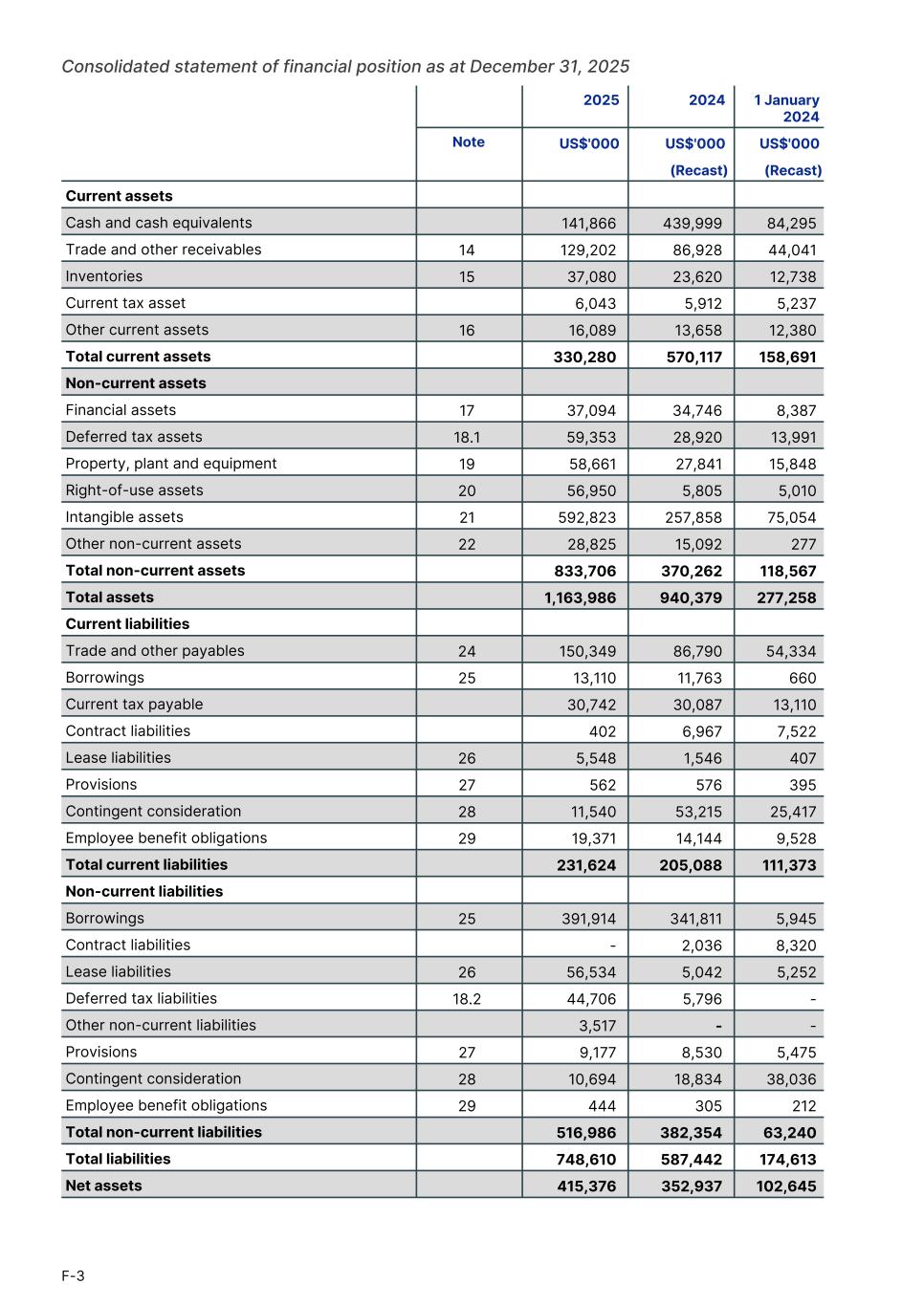 Consolidated statement of financial position as at December 31, 2025 Current assets Cash and cash equivalents 141,866 439,999 84,295 Trade and other receivables 14 129,202 86,928 44,041 Inventories 15 37,080 23,620 12,738 Current tax asset 6,043 5,912 5,237 Other current assets 16 16,089 13,658 12,380 Total current assets 330,280 570,117 158,691 Non-current assets Financial assets 17 37,094 34,746 8,387 Deferred tax assets 18.1 59,353 28,920 13,991 Property, plant and equipment 19 58,661 27,841 15,848 Right-of-use assets 20 56,950 5,805 5,010 Intangible assets 21 592,823 257,858 75,054 Other non-current assets 22 28,825 15,092 277 Total non-current assets 833,706 370,262 118,567 Total assets 1,163,986 940,379 277,258 Current liabilities Trade and other payables 24 150,349 86,790 54,334 Borrowings 25 13,110 11,763 660 Current tax payable 30,742 30,087 13,110 Contract liabilities 402 6,967 7,522 Lease liabilities 26 5,548 1,546 407 Provisions 27 562 576 395 Contingent consideration 28 11,540 53,215 25,417 Employee benefit obligations 29 19,371 14,144 9,528 Total current liabilities 231,624 205,088 111,373 Non-current liabilities Borrowings 25 391,914 341,811 5,945 Contract liabilities - 2,036 8,320 Lease liabilities 26 56,534 5,042 5,252 Deferred tax liabilities 18.2 44,706 5,796 - Other non-current liabilities 3,517 - - Provisions 27 9,177 8,530 5,475 Contingent consideration 28 10,694 18,834 38,036 Employee benefit obligations 29 444 305 212 Total non-current liabilities 516,986 382,354 63,240 Total liabilities 748,610 587,442 174,613 Net assets 415,376 352,937 102,645 2025 2024 1 January 2024 Note US$'000 US$'000 US$'000 (Recast) (Recast) F-3