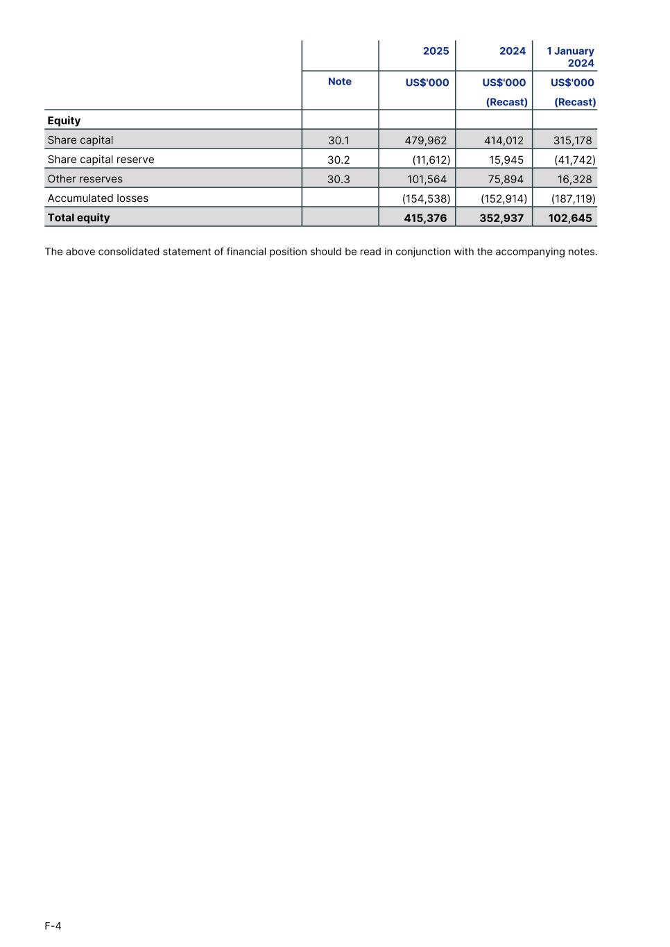 Equity Share capital 30.1 479,962 414,012 315,178 Share capital reserve 30.2 (11,612) 15,945 (41,742) Other reserves 30.3 101,564 75,894 16,328 Accumulated losses (154,538) (152,914) (187,119) Total equity 415,376 352,937 102,645 2025 2024 1 January 2024 Note US$'000 US$'000 US$'000 (Recast) (Recast) The above consolidated statement of financial position should be read in conjunction with the accompanying notes. F-4