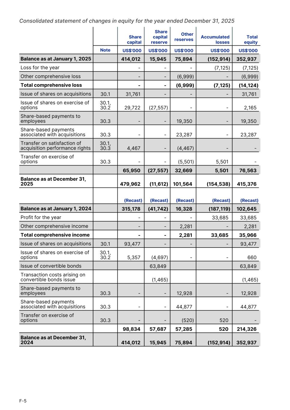 Consolidated statement of changes in equity for the year ended December 31, 2025 Balance as at January 1, 2025 414,012 15,945 75,894 (152,914) 352,937 Loss for the year - - - (7,125) (7,125) Other comprehensive loss - - (6,999) - (6,999) Total comprehensive loss - - (6,999) (7,125) (14,124) Issue of shares on acquisitions 30.1 31,761 - - - 31,761 Issue of shares on exercise of options 30.1, 30.2 29,722 (27,557) - - 2,165 Share-based payments to employees 30.3 - - 19,350 - 19,350 Share-based payments associated with acquisitions 30.3 - - 23,287 - 23,287 Transfer on satisfaction of acquisition performance rights 30.1, 30.3 4,467 - (4,467) - - Transfer on exercise of options 30.3 - - (5,501) 5,501 - 65,950 (27,557) 32,669 5,501 76,563 Balance as at December 31, 2025 479,962 (11,612) 101,564 (154,538) 415,376 (Recast) (Recast) (Recast) (Recast) (Recast) Balance as at January 1, 2024 315,178 (41,742) 16,328 (187,119) 102,645 Profit for the year - - - 33,685 33,685 Other comprehensive income - - 2,281 - 2,281 Total comprehensive income - - 2,281 33,685 35,966 Issue of shares on acquisitions 30.1 93,477 - - - 93,477 Issue of shares on exercise of options 30.1, 30.2 5,357 (4,697) - - 660 Issue of convertible bonds 63,849 63,849 Transaction costs arising on convertible bonds issue (1,465) (1,465) Share-based payments to employees 30.3 - - 12,928 - 12,928 Share-based payments associated with acquisitions 30.3 - - 44,877 - 44,877 Transfer on exercise of options 30.3 - - (520) 520 - 98,834 57,687 57,285 520 214,326 Balance as at December 31, 2024 414,012 15,945 75,894 (152,914) 352,937 Share capital Share capital reserve Other reserves Accumulated losses Total equity Note US$'000 US$'000 US$'000 US$'000 US$'000 F-5