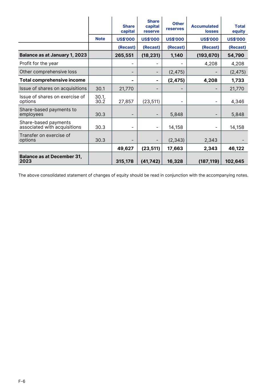 (Recast) (Recast) (Recast) (Recast) (Recast) Balance as at January 1, 2023 265,551 (18,231) 1,140 (193,670) 54,790 Profit for the year - - - 4,208 4,208 Other comprehensive loss - - (2,475) - (2,475) Total comprehensive income - - (2,475) 4,208 1,733 Issue of shares on acquisitions 30.1 21,770 - - - 21,770 Issue of shares on exercise of options 30.1, 30.2 27,857 (23,511) - - 4,346 Share-based payments to employees 30.3 - - 5,848 - 5,848 Share-based payments associated with acquisitions 30.3 - - 14,158 - 14,158 Transfer on exercise of options 30.3 - - (2,343) 2,343 - 49,627 (23,511) 17,663 2,343 46,122 Balance as at December 31, 2023 315,178 (41,742) 16,328 (187,119) 102,645 Share capital Share capital reserve Other reserves Accumulated losses Total equity Note US$'000 US$'000 US$'000 US$'000 US$'000 The above consolidated statement of changes of equity should be read in conjunction with the accompanying notes. F-6