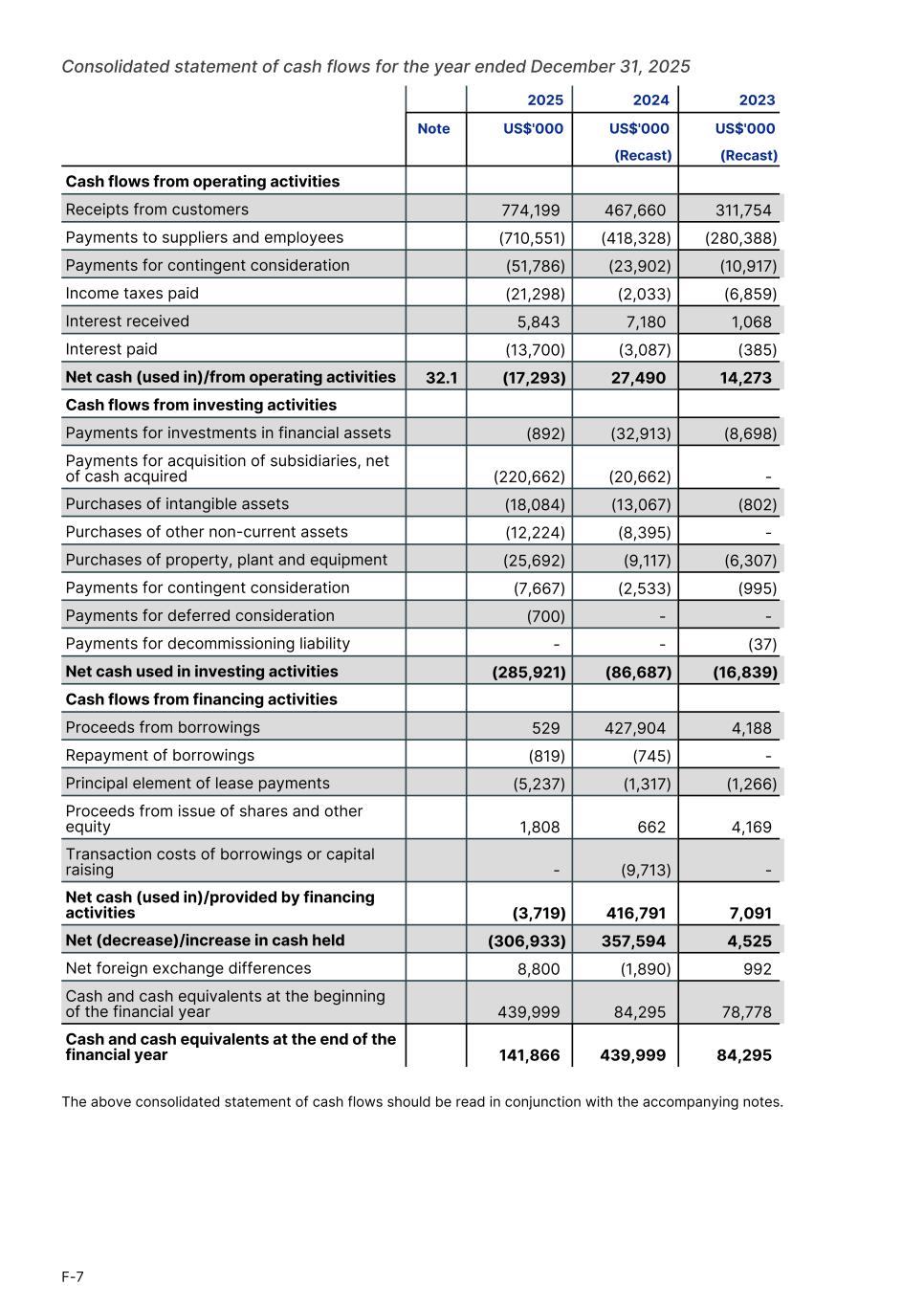 Consolidated statement of cash flows for the year ended December 31, 2025 2025 2024 2023 Note US$'000 US$'000 US$'000 (Recast) (Recast) Cash flows from operating activities Receipts from customers 774,199 467,660 311,754 Payments to suppliers and employees (710,551) (418,328) (280,388) Payments for contingent consideration (51,786) (23,902) (10,917) Income taxes paid (21,298) (2,033) (6,859) Interest received 5,843 7,180 1,068 Interest paid (13,700) (3,087) (385) Net cash (used in)/from operating activities 32.1 (17,293) 27,490 14,273 Cash flows from investing activities Payments for investments in financial assets (892) (32,913) (8,698) Payments for acquisition of subsidiaries, net of cash acquired (220,662) (20,662) - Purchases of intangible assets (18,084) (13,067) (802) Purchases of other non-current assets (12,224) (8,395) - Purchases of property, plant and equipment (25,692) (9,117) (6,307) Payments for contingent consideration (7,667) (2,533) (995) Payments for deferred consideration (700) - - Payments for decommissioning liability - - (37) Net cash used in investing activities (285,921) (86,687) (16,839) Cash flows from financing activities Proceeds from borrowings 529 427,904 4,188 Repayment of borrowings (819) (745) - Principal element of lease payments (5,237) (1,317) (1,266) Proceeds from issue of shares and other equity 1,808 662 4,169 Transaction costs of borrowings or capital raising - (9,713) - Net cash (used in)/provided by financing activities (3,719) 416,791 7,091 Net (decrease)/increase in cash held (306,933) 357,594 4,525 Net foreign exchange differences 8,800 (1,890) 992 Cash and cash equivalents at the beginning of the financial year 439,999 84,295 78,778 Cash and cash equivalents at the end of the financial year 141,866 439,999 84,295 The above consolidated statement of cash flows should be read in conjunction with the accompanying notes. F-7