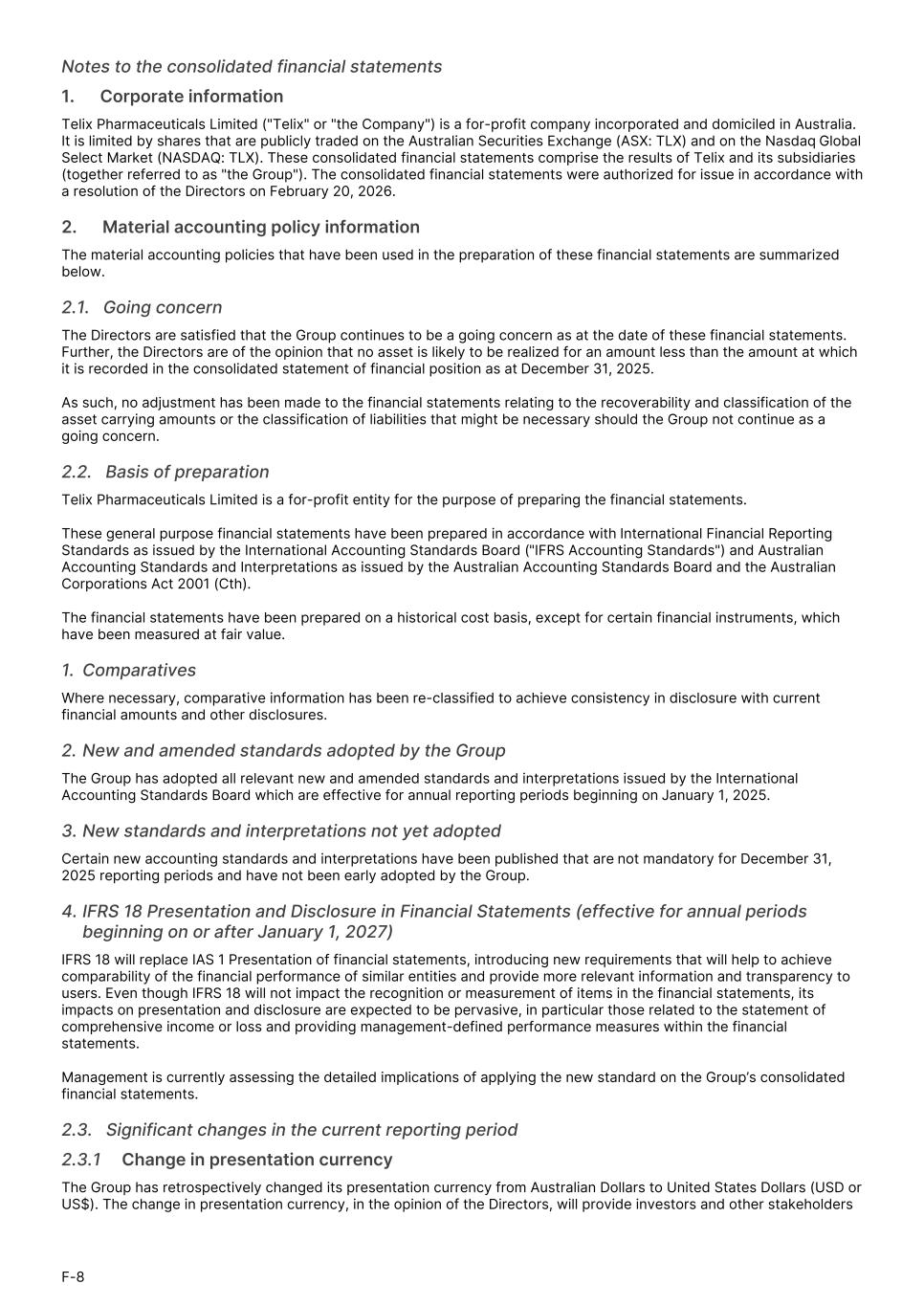 Notes to the consolidated financial statements 1.      Corporate information Telix Pharmaceuticals Limited ("Telix" or "the Company") is a for-profit company incorporated and domiciled in Australia. It is limited by shares that are publicly traded on the Australian Securities Exchange (ASX: TLX) and on the Nasdaq Global Select Market (NASDAQ: TLX). These consolidated financial statements comprise the results of Telix and its subsidiaries (together referred to as "the Group"). The consolidated financial statements were authorized for issue in accordance with a resolution of the Directors on February 20, 2026. 2.      Material accounting policy information The material accounting policies that have been used in the preparation of these financial statements are summarized below. 2.1.   Going concern The Directors are satisfied that the Group continues to be a going concern as at the date of these financial statements. Further, the Directors are of the opinion that no asset is likely to be realized for an amount less than the amount at which it is recorded in the consolidated statement of financial position as at December 31, 2025. As such, no adjustment has been made to the financial statements relating to the recoverability and classification of the asset carrying amounts or the classification of liabilities that might be necessary should the Group not continue as a going concern. 2.2.   Basis of preparation Telix Pharmaceuticals Limited is a for-profit entity for the purpose of preparing the financial statements. These general purpose financial statements have been prepared in accordance with International Financial Reporting Standards as issued by the International Accounting Standards Board ("IFRS Accounting Standards") and Australian Accounting Standards and Interpretations as issued by the Australian Accounting Standards Board and the Australian Corporations Act 2001 (Cth). The financial statements have been prepared on a historical cost basis, except for certain financial instruments, which have been measured at fair value. 1. Comparatives Where necessary, comparative information has been re-classified to achieve consistency in disclosure with current financial amounts and other disclosures. 2. New and amended standards adopted by the Group The Group has adopted all relevant new and amended standards and interpretations issued by the International Accounting Standards Board which are effective for annual reporting periods beginning on January 1, 2025. 3. New standards and interpretations not yet adopted Certain new accounting standards and interpretations have been published that are not mandatory for December 31, 2025 reporting periods and have not been early adopted by the Group. 4. IFRS 18 Presentation and Disclosure in Financial Statements (effective for annual periods beginning on or after January 1, 2027) IFRS 18 will replace IAS 1 Presentation of financial statements, introducing new requirements that will help to achieve comparability of the financial performance of similar entities and provide more relevant information and transparency to users. Even though IFRS 18 will not impact the recognition or measurement of items in the financial statements, its impacts on presentation and disclosure are expected to be pervasive, in particular those related to the statement of comprehensive income or loss and providing management-defined performance measures within the financial statements. Management is currently assessing the detailed implications of applying the new standard on the Group’s consolidated financial statements. 2.3.   Significant changes in the current reporting period 2.3.1 Change in presentation currency The Group has retrospectively changed its presentation currency from Australian Dollars to United States Dollars (USD or US$). The change in presentation currency, in the opinion of the Directors, will provide investors and other stakeholders F-8