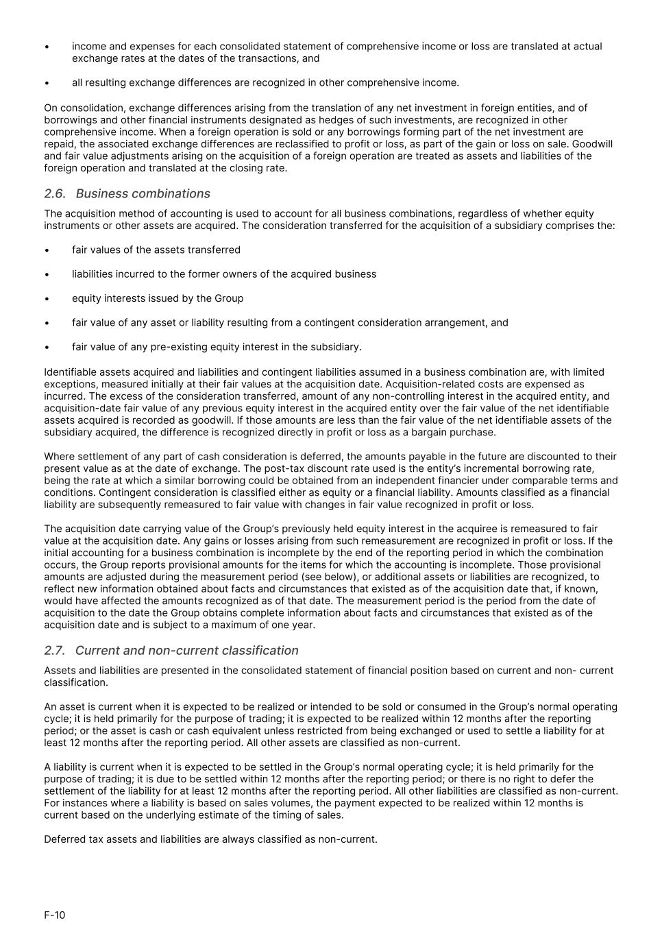• income and expenses for each consolidated statement of comprehensive income or loss are translated at actual exchange rates at the dates of the transactions, and • all resulting exchange differences are recognized in other comprehensive income. On consolidation, exchange differences arising from the translation of any net investment in foreign entities, and of borrowings and other financial instruments designated as hedges of such investments, are recognized in other comprehensive income. When a foreign operation is sold or any borrowings forming part of the net investment are repaid, the associated exchange differences are reclassified to profit or loss, as part of the gain or loss on sale. Goodwill and fair value adjustments arising on the acquisition of a foreign operation are treated as assets and liabilities of the foreign operation and translated at the closing rate. 2.6.   Business combinations The acquisition method of accounting is used to account for all business combinations, regardless of whether equity instruments or other assets are acquired. The consideration transferred for the acquisition of a subsidiary comprises the: • fair values of the assets transferred • liabilities incurred to the former owners of the acquired business • equity interests issued by the Group • fair value of any asset or liability resulting from a contingent consideration arrangement, and • fair value of any pre-existing equity interest in the subsidiary. Identifiable assets acquired and liabilities and contingent liabilities assumed in a business combination are, with limited exceptions, measured initially at their fair values at the acquisition date. Acquisition-related costs are expensed as incurred. The excess of the consideration transferred, amount of any non-controlling interest in the acquired entity, and acquisition-date fair value of any previous equity interest in the acquired entity over the fair value of the net identifiable assets acquired is recorded as goodwill. If those amounts are less than the fair value of the net identifiable assets of the subsidiary acquired, the difference is recognized directly in profit or loss as a bargain purchase. Where settlement of any part of cash consideration is deferred, the amounts payable in the future are discounted to their present value as at the date of exchange. The post-tax discount rate used is the entity’s incremental borrowing rate, being the rate at which a similar borrowing could be obtained from an independent financier under comparable terms and conditions. Contingent consideration is classified either as equity or a financial liability. Amounts classified as a financial liability are subsequently remeasured to fair value with changes in fair value recognized in profit or loss. The acquisition date carrying value of the Group’s previously held equity interest in the acquiree is remeasured to fair value at the acquisition date. Any gains or losses arising from such remeasurement are recognized in profit or loss. If the initial accounting for a business combination is incomplete by the end of the reporting period in which the combination occurs, the Group reports provisional amounts for the items for which the accounting is incomplete. Those provisional amounts are adjusted during the measurement period (see below), or additional assets or liabilities are recognized, to reflect new information obtained about facts and circumstances that existed as of the acquisition date that, if known, would have affected the amounts recognized as of that date. The measurement period is the period from the date of acquisition to the date the Group obtains complete information about facts and circumstances that existed as of the acquisition date and is subject to a maximum of one year. 2.7.   Current and non-current classification Assets and liabilities are presented in the consolidated statement of financial position based on current and non- current classification. An asset is current when it is expected to be realized or intended to be sold or consumed in the Group’s normal operating cycle; it is held primarily for the purpose of trading; it is expected to be realized within 12 months after the reporting period; or the asset is cash or cash equivalent unless restricted from being exchanged or used to settle a liability for at least 12 months after the reporting period. All other assets are classified as non-current. A liability is current when it is expected to be settled in the Group’s normal operating cycle; it is held primarily for the purpose of trading; it is due to be settled within 12 months after the reporting period; or there is no right to defer the settlement of the liability for at least 12 months after the reporting period. All other liabilities are classified as non-current. For instances where a liability is based on sales volumes, the payment expected to be realized within 12 months is current based on the underlying estimate of the timing of sales. Deferred tax assets and liabilities are always classified as non-current. F-10