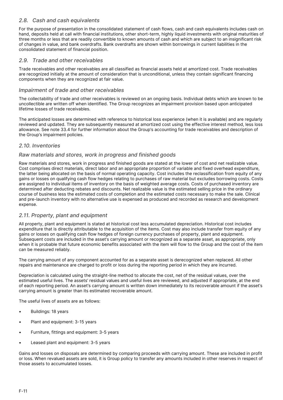 2.8.   Cash and cash equivalents For the purpose of presentation in the consolidated statement of cash flows, cash and cash equivalents includes cash on hand, deposits held at call with financial institutions, other short-term, highly liquid investments with original maturities of three months or less that are readily convertible to known amounts of cash and which are subject to an insignificant risk of changes in value, and bank overdrafts. Bank overdrafts are shown within borrowings in current liabilities in the consolidated statement of financial position. 2.9.   Trade and other receivables Trade receivables and other receivables are all classified as financial assets held at amortized cost. Trade receivables are recognized initially at the amount of consideration that is unconditional, unless they contain significant financing components when they are recognized at fair value. Impairment of trade and other receivables The collectability of trade and other receivables is reviewed on an ongoing basis. Individual debts which are known to be uncollectible are written off when identified. The Group recognizes an impairment provision based upon anticipated lifetime losses of trade receivables. The anticipated losses are determined with reference to historical loss experience (when it is available) and are regularly reviewed and updated. They are subsequently measured at amortized cost using the effective interest method, less loss allowance. See note 33.4 for further information about the Group’s accounting for trade receivables and description of the Group’s impairment policies. 2.10. Inventories Raw materials and stores, work in progress and finished goods Raw materials and stores, work in progress and finished goods are stated at the lower of cost and net realizable value. Cost comprises direct materials, direct labor and an appropriate proportion of variable and fixed overhead expenditure, the latter being allocated on the basis of normal operating capacity. Cost includes the reclassification from equity of any gains or losses on qualifying cash flow hedges relating to purchases of raw material but excludes borrowing costs. Costs are assigned to individual items of inventory on the basis of weighted average costs. Costs of purchased inventory are determined after deducting rebates and discounts. Net realizable value is the estimated selling price in the ordinary course of business less the estimated costs of completion and the estimated costs necessary to make the sale. Clinical and pre-launch inventory with no alternative use is expensed as produced and recorded as research and development expense. 2.11. Property, plant and equipment All property, plant and equipment is stated at historical cost less accumulated depreciation. Historical cost includes expenditure that is directly attributable to the acquisition of the items. Cost may also include transfer from equity of any gains or losses on qualifying cash flow hedges of foreign currency purchases of property, plant and equipment. Subsequent costs are included in the asset’s carrying amount or recognized as a separate asset, as appropriate, only when it is probable that future economic benefits associated with the item will flow to the Group and the cost of the item can be measured reliably. The carrying amount of any component accounted for as a separate asset is derecognized when replaced. All other repairs and maintenance are charged to profit or loss during the reporting period in which they are incurred. Depreciation is calculated using the straight-line method to allocate the cost, net of the residual values, over the estimated useful lives. The assets’ residual values and useful lives are reviewed, and adjusted if appropriate, at the end of each reporting period. An asset’s carrying amount is written down immediately to its recoverable amount if the asset’s carrying amount is greater than its estimated recoverable amount. The useful lives of assets are as follows: • Buildings: 18 years • Plant and equipment: 3-15 years • Furniture, fittings and equipment: 3-5 years • Leased plant and equipment: 3-5 years Gains and losses on disposals are determined by comparing proceeds with carrying amount. These are included in profit or loss. When revalued assets are sold, it is Group policy to transfer any amounts included in other reserves in respect of those assets to accumulated losses. F-11