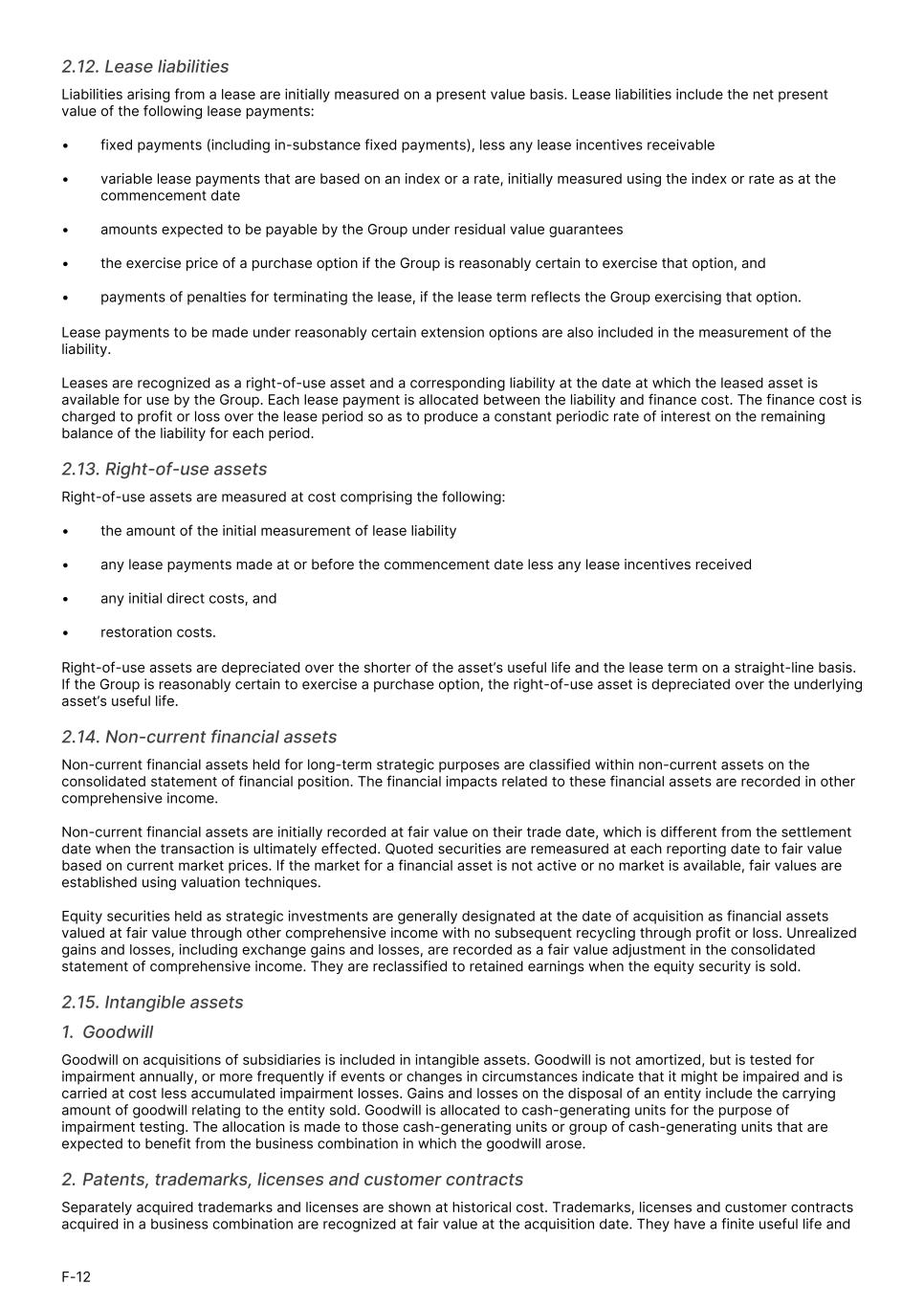 2.12. Lease liabilities Liabilities arising from a lease are initially measured on a present value basis. Lease liabilities include the net present value of the following lease payments: • fixed payments (including in-substance fixed payments), less any lease incentives receivable • variable lease payments that are based on an index or a rate, initially measured using the index or rate as at the commencement date • amounts expected to be payable by the Group under residual value guarantees • the exercise price of a purchase option if the Group is reasonably certain to exercise that option, and • payments of penalties for terminating the lease, if the lease term reflects the Group exercising that option. Lease payments to be made under reasonably certain extension options are also included in the measurement of the liability. Leases are recognized as a right-of-use asset and a corresponding liability at the date at which the leased asset is available for use by the Group. Each lease payment is allocated between the liability and finance cost. The finance cost is charged to profit or loss over the lease period so as to produce a constant periodic rate of interest on the remaining balance of the liability for each period. 2.13. Right-of-use assets Right-of-use assets are measured at cost comprising the following: • the amount of the initial measurement of lease liability • any lease payments made at or before the commencement date less any lease incentives received • any initial direct costs, and • restoration costs. Right-of-use assets are depreciated over the shorter of the asset’s useful life and the lease term on a straight-line basis. If the Group is reasonably certain to exercise a purchase option, the right-of-use asset is depreciated over the underlying asset’s useful life. 2.14. Non-current financial assets Non-current financial assets held for long-term strategic purposes are classified within non-current assets on the consolidated statement of financial position. The financial impacts related to these financial assets are recorded in other comprehensive income. Non-current financial assets are initially recorded at fair value on their trade date, which is different from the settlement date when the transaction is ultimately effected. Quoted securities are remeasured at each reporting date to fair value based on current market prices. If the market for a financial asset is not active or no market is available, fair values are established using valuation techniques. Equity securities held as strategic investments are generally designated at the date of acquisition as financial assets valued at fair value through other comprehensive income with no subsequent recycling through profit or loss. Unrealized gains and losses, including exchange gains and losses, are recorded as a fair value adjustment in the consolidated statement of comprehensive income. They are reclassified to retained earnings when the equity security is sold. 2.15. Intangible assets 1. Goodwill Goodwill on acquisitions of subsidiaries is included in intangible assets. Goodwill is not amortized, but is tested for impairment annually, or more frequently if events or changes in circumstances indicate that it might be impaired and is carried at cost less accumulated impairment losses. Gains and losses on the disposal of an entity include the carrying amount of goodwill relating to the entity sold. Goodwill is allocated to cash-generating units for the purpose of impairment testing. The allocation is made to those cash-generating units or group of cash-generating units that are expected to benefit from the business combination in which the goodwill arose. 2. Patents, trademarks, licenses and customer contracts Separately acquired trademarks and licenses are shown at historical cost. Trademarks, licenses and customer contracts acquired in a business combination are recognized at fair value at the acquisition date. They have a finite useful life and F-12