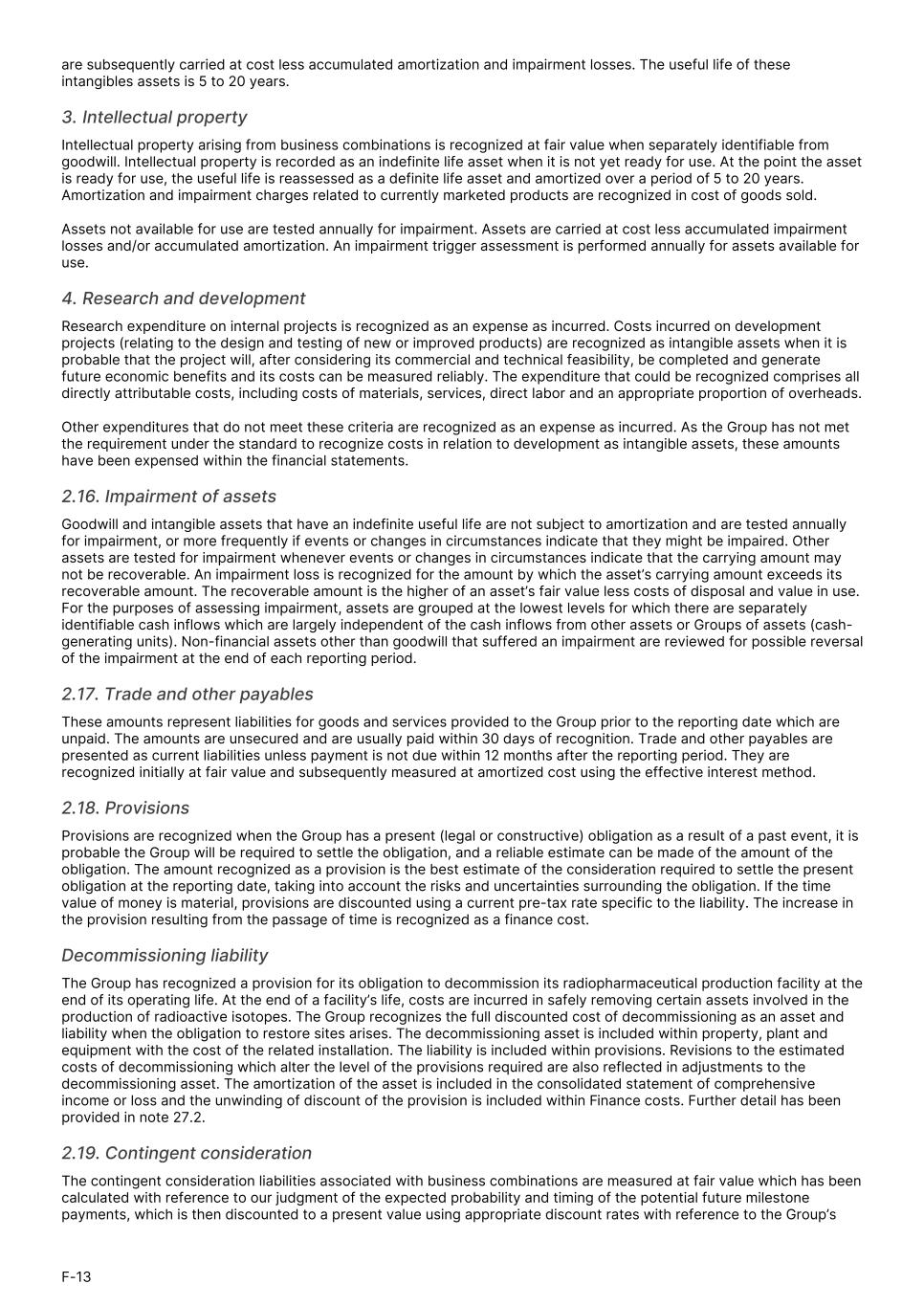 are subsequently carried at cost less accumulated amortization and impairment losses. The useful life of these intangibles assets is 5 to 20 years. 3. Intellectual property Intellectual property arising from business combinations is recognized at fair value when separately identifiable from goodwill. Intellectual property is recorded as an indefinite life asset when it is not yet ready for use. At the point the asset is ready for use, the useful life is reassessed as a definite life asset and amortized over a period of 5 to 20 years. Amortization and impairment charges related to currently marketed products are recognized in cost of goods sold. Assets not available for use are tested annually for impairment. Assets are carried at cost less accumulated impairment losses and/or accumulated amortization. An impairment trigger assessment is performed annually for assets available for use. 4. Research and development Research expenditure on internal projects is recognized as an expense as incurred. Costs incurred on development projects (relating to the design and testing of new or improved products) are recognized as intangible assets when it is probable that the project will, after considering its commercial and technical feasibility, be completed and generate future economic benefits and its costs can be measured reliably. The expenditure that could be recognized comprises all directly attributable costs, including costs of materials, services, direct labor and an appropriate proportion of overheads. Other expenditures that do not meet these criteria are recognized as an expense as incurred. As the Group has not met the requirement under the standard to recognize costs in relation to development as intangible assets, these amounts have been expensed within the financial statements. 2.16. Impairment of assets Goodwill and intangible assets that have an indefinite useful life are not subject to amortization and are tested annually for impairment, or more frequently if events or changes in circumstances indicate that they might be impaired. Other assets are tested for impairment whenever events or changes in circumstances indicate that the carrying amount may not be recoverable. An impairment loss is recognized for the amount by which the asset’s carrying amount exceeds its recoverable amount. The recoverable amount is the higher of an asset’s fair value less costs of disposal and value in use. For the purposes of assessing impairment, assets are grouped at the lowest levels for which there are separately identifiable cash inflows which are largely independent of the cash inflows from other assets or Groups of assets (cash- generating units). Non-financial assets other than goodwill that suffered an impairment are reviewed for possible reversal of the impairment at the end of each reporting period. 2.17. Trade and other payables These amounts represent liabilities for goods and services provided to the Group prior to the reporting date which are unpaid. The amounts are unsecured and are usually paid within 30 days of recognition. Trade and other payables are presented as current liabilities unless payment is not due within 12 months after the reporting period. They are recognized initially at fair value and subsequently measured at amortized cost using the effective interest method. 2.18. Provisions Provisions are recognized when the Group has a present (legal or constructive) obligation as a result of a past event, it is probable the Group will be required to settle the obligation, and a reliable estimate can be made of the amount of the obligation. The amount recognized as a provision is the best estimate of the consideration required to settle the present obligation at the reporting date, taking into account the risks and uncertainties surrounding the obligation. If the time value of money is material, provisions are discounted using a current pre-tax rate specific to the liability. The increase in the provision resulting from the passage of time is recognized as a finance cost. Decommissioning liability The Group has recognized a provision for its obligation to decommission its radiopharmaceutical production facility at the end of its operating life. At the end of a facility’s life, costs are incurred in safely removing certain assets involved in the production of radioactive isotopes. The Group recognizes the full discounted cost of decommissioning as an asset and liability when the obligation to restore sites arises. The decommissioning asset is included within property, plant and equipment with the cost of the related installation. The liability is included within provisions. Revisions to the estimated costs of decommissioning which alter the level of the provisions required are also reflected in adjustments to the decommissioning asset. The amortization of the asset is included in the consolidated statement of comprehensive income or loss and the unwinding of discount of the provision is included within Finance costs. Further detail has been provided in note 27.2. 2.19. Contingent consideration The contingent consideration liabilities associated with business combinations are measured at fair value which has been calculated with reference to our judgment of the expected probability and timing of the potential future milestone payments, which is then discounted to a present value using appropriate discount rates with reference to the Group’s F-13