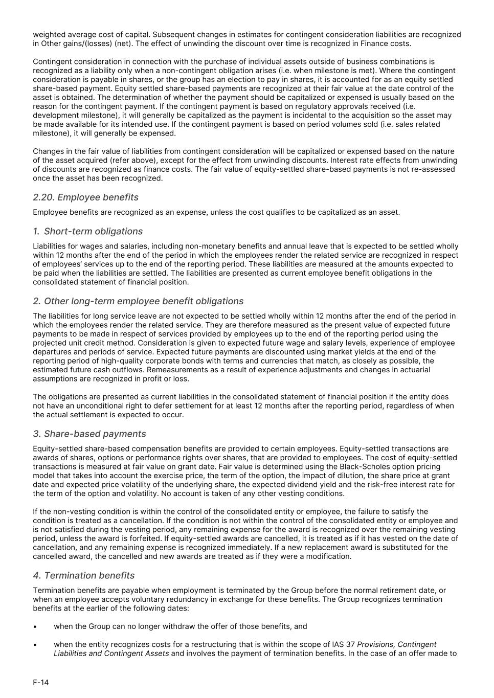 weighted average cost of capital. Subsequent changes in estimates for contingent consideration liabilities are recognized in Other gains/(losses) (net). The effect of unwinding the discount over time is recognized in Finance costs. Contingent consideration in connection with the purchase of individual assets outside of business combinations is recognized as a liability only when a non-contingent obligation arises (i.e. when milestone is met). Where the contingent consideration is payable in shares, or the group has an election to pay in shares, it is accounted for as an equity settled share-based payment. Equity settled share-based payments are recognized at their fair value at the date control of the asset is obtained. The determination of whether the payment should be capitalized or expensed is usually based on the reason for the contingent payment. If the contingent payment is based on regulatory approvals received (i.e. development milestone), it will generally be capitalized as the payment is incidental to the acquisition so the asset may be made available for its intended use. If the contingent payment is based on period volumes sold (i.e. sales related milestone), it will generally be expensed. Changes in the fair value of liabilities from contingent consideration will be capitalized or expensed based on the nature of the asset acquired (refer above), except for the effect from unwinding discounts. Interest rate effects from unwinding of discounts are recognized as finance costs. The fair value of equity-settled share-based payments is not re-assessed once the asset has been recognized. 2.20. Employee benefits Employee benefits are recognized as an expense, unless the cost qualifies to be capitalized as an asset. 1. Short-term obligations Liabilities for wages and salaries, including non-monetary benefits and annual leave that is expected to be settled wholly within 12 months after the end of the period in which the employees render the related service are recognized in respect of employees’ services up to the end of the reporting period. These liabilities are measured at the amounts expected to be paid when the liabilities are settled. The liabilities are presented as current employee benefit obligations in the consolidated statement of financial position. 2. Other long-term employee benefit obligations The liabilities for long service leave are not expected to be settled wholly within 12 months after the end of the period in which the employees render the related service. They are therefore measured as the present value of expected future payments to be made in respect of services provided by employees up to the end of the reporting period using the projected unit credit method. Consideration is given to expected future wage and salary levels, experience of employee departures and periods of service. Expected future payments are discounted using market yields at the end of the reporting period of high-quality corporate bonds with terms and currencies that match, as closely as possible, the estimated future cash outflows. Remeasurements as a result of experience adjustments and changes in actuarial assumptions are recognized in profit or loss. The obligations are presented as current liabilities in the consolidated statement of financial position if the entity does not have an unconditional right to defer settlement for at least 12 months after the reporting period, regardless of when the actual settlement is expected to occur. 3. Share-based payments Equity-settled share-based compensation benefits are provided to certain employees. Equity-settled transactions are awards of shares, options or performance rights over shares, that are provided to employees. The cost of equity-settled transactions is measured at fair value on grant date. Fair value is determined using the Black-Scholes option pricing model that takes into account the exercise price, the term of the option, the impact of dilution, the share price at grant date and expected price volatility of the underlying share, the expected dividend yield and the risk-free interest rate for the term of the option and volatility. No account is taken of any other vesting conditions. If the non-vesting condition is within the control of the consolidated entity or employee, the failure to satisfy the condition is treated as a cancellation. If the condition is not within the control of the consolidated entity or employee and is not satisfied during the vesting period, any remaining expense for the award is recognized over the remaining vesting period, unless the award is forfeited. If equity-settled awards are cancelled, it is treated as if it has vested on the date of cancellation, and any remaining expense is recognized immediately. If a new replacement award is substituted for the cancelled award, the cancelled and new awards are treated as if they were a modification. 4. Termination benefits Termination benefits are payable when employment is terminated by the Group before the normal retirement date, or when an employee accepts voluntary redundancy in exchange for these benefits. The Group recognizes termination benefits at the earlier of the following dates: • when the Group can no longer withdraw the offer of those benefits, and • when the entity recognizes costs for a restructuring that is within the scope of IAS 37 Provisions, Contingent Liabilities and Contingent Assets and involves the payment of termination benefits. In the case of an offer made to F-14