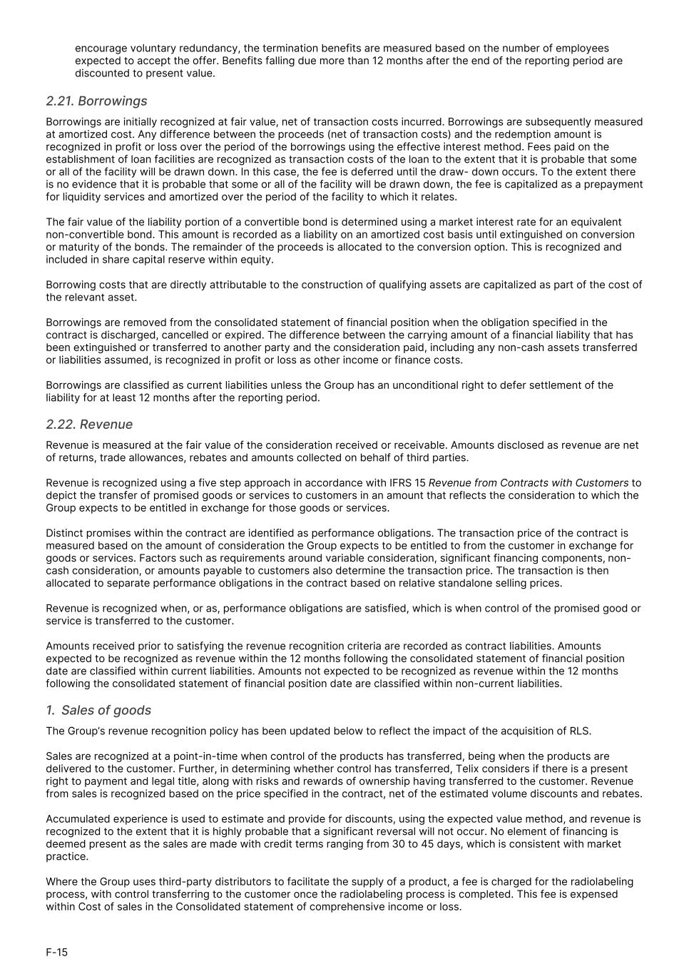encourage voluntary redundancy, the termination benefits are measured based on the number of employees expected to accept the offer. Benefits falling due more than 12 months after the end of the reporting period are discounted to present value. 2.21. Borrowings Borrowings are initially recognized at fair value, net of transaction costs incurred. Borrowings are subsequently measured at amortized cost. Any difference between the proceeds (net of transaction costs) and the redemption amount is recognized in profit or loss over the period of the borrowings using the effective interest method. Fees paid on the establishment of loan facilities are recognized as transaction costs of the loan to the extent that it is probable that some or all of the facility will be drawn down. In this case, the fee is deferred until the draw- down occurs. To the extent there is no evidence that it is probable that some or all of the facility will be drawn down, the fee is capitalized as a prepayment for liquidity services and amortized over the period of the facility to which it relates. The fair value of the liability portion of a convertible bond is determined using a market interest rate for an equivalent non-convertible bond. This amount is recorded as a liability on an amortized cost basis until extinguished on conversion or maturity of the bonds. The remainder of the proceeds is allocated to the conversion option. This is recognized and included in share capital reserve within equity. Borrowing costs that are directly attributable to the construction of qualifying assets are capitalized as part of the cost of the relevant asset. Borrowings are removed from the consolidated statement of financial position when the obligation specified in the contract is discharged, cancelled or expired. The difference between the carrying amount of a financial liability that has been extinguished or transferred to another party and the consideration paid, including any non-cash assets transferred or liabilities assumed, is recognized in profit or loss as other income or finance costs. Borrowings are classified as current liabilities unless the Group has an unconditional right to defer settlement of the liability for at least 12 months after the reporting period. 2.22. Revenue Revenue is measured at the fair value of the consideration received or receivable. Amounts disclosed as revenue are net of returns, trade allowances, rebates and amounts collected on behalf of third parties. Revenue is recognized using a five step approach in accordance with IFRS 15 Revenue from Contracts with Customers to depict the transfer of promised goods or services to customers in an amount that reflects the consideration to which the Group expects to be entitled in exchange for those goods or services. Distinct promises within the contract are identified as performance obligations. The transaction price of the contract is measured based on the amount of consideration the Group expects to be entitled to from the customer in exchange for goods or services. Factors such as requirements around variable consideration, significant financing components, non- cash consideration, or amounts payable to customers also determine the transaction price. The transaction is then allocated to separate performance obligations in the contract based on relative standalone selling prices. Revenue is recognized when, or as, performance obligations are satisfied, which is when control of the promised good or service is transferred to the customer. Amounts received prior to satisfying the revenue recognition criteria are recorded as contract liabilities. Amounts expected to be recognized as revenue within the 12 months following the consolidated statement of financial position date are classified within current liabilities. Amounts not expected to be recognized as revenue within the 12 months following the consolidated statement of financial position date are classified within non-current liabilities. 1. Sales of goods The Group’s revenue recognition policy has been updated below to reflect the impact of the acquisition of RLS. Sales are recognized at a point-in-time when control of the products has transferred, being when the products are delivered to the customer. Further, in determining whether control has transferred, Telix considers if there is a present right to payment and legal title, along with risks and rewards of ownership having transferred to the customer. Revenue from sales is recognized based on the price specified in the contract, net of the estimated volume discounts and rebates. Accumulated experience is used to estimate and provide for discounts, using the expected value method, and revenue is recognized to the extent that it is highly probable that a significant reversal will not occur. No element of financing is deemed present as the sales are made with credit terms ranging from 30 to 45 days, which is consistent with market practice. Where the Group uses third-party distributors to facilitate the supply of a product, a fee is charged for the radiolabeling process, with control transferring to the customer once the radiolabeling process is completed. This fee is expensed within Cost of sales in the Consolidated statement of comprehensive income or loss. F-15