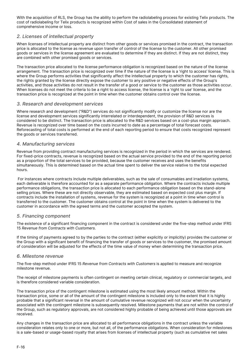 With the acquisition of RLS, the Group has the ability to perform the radiolabeling process for existing Telix products. The cost of radiolabeling for Telix products is recognized within Cost of sales in the Consolidated statement of comprehensive income or loss. 2. Licenses of intellectual property When licenses of intellectual property are distinct from other goods or services promised in the contract, the transaction price is allocated to the license as revenue upon transfer of control of the license to the customer. All other promised goods or services in the license agreement are evaluated to determine if they are distinct. If they are not distinct, they are combined with other promised goods or services. The transaction price allocated to the license performance obligation is recognized based on the nature of the license arrangement. The transaction price is recognized over time if the nature of the license is a ‘right to access’ license. This is where the Group performs activities that significantly affect the intellectual property to which the customer has rights, the rights granted by the license directly expose the customer to any positive or negative effects of the Group’s activities, and those activities do not result in the transfer of a good or service to the customer as those activities occur. When licenses do not meet the criteria to be a right to access license, the license is a ’right to use’ license, and the transaction price is recognized at the point in time when the customer obtains control over the license. 3. Research and development services Where research and development ("R&D") services do not significantly modify or customize the license nor are the license and development services significantly interrelated or interdependent, the provision of R&D services is considered to be distinct. The transaction price is allocated to the R&D services based on a cost-plus margin approach. Revenue is recognized over time based on the costs incurred to date as a percentage of total forecast costs. Reforecasting of total costs is performed at the end of each reporting period to ensure that costs recognized represent the goods or services transferred. 4. Manufacturing services Revenue from providing contract manufacturing services is recognized in the period in which the services are rendered. For fixed-price contracts, revenue is recognized based on the actual service provided to the end of the reporting period as a proportion of the total services to be provided, because the customer receives and uses the benefits simultaneously. This is determined based on the actual time spent to deliver the service relative to the total expected hours. For instances where contracts include multiple deliverables, such as the sale of consumables and irradiation systems, each deliverable is therefore accounted for as a separate performance obligation. Where the contracts include multiple performance obligations, the transaction price is allocated to each performance obligation based on the stand-alone selling prices. Where these are not directly observable, they are estimated based on expected cost plus margin. If contracts include the installation of systems, revenue for the system is recognized at a point in time when control is transferred to the customer. The customer obtains control at the point in time when the system is delivered to the customer in accordance with the agreed terms and the customer accepted the system. 5. Financing component The existence of a significant financing component in the contract is considered under the five-step method under IFRS 15 Revenue from Contracts with Customers. If the timing of payments agreed to by the parties to the contract (either explicitly or implicitly) provides the customer or the Group with a significant benefit of financing the transfer of goods or services to the customer, the promised amount of consideration will be adjusted for the effects of the time value of money when determining the transaction price. 6. Milestone revenue The five-step method under IFRS 15 Revenue from Contracts with Customers is applied to measure and recognize milestone revenue. The receipt of milestone payments is often contingent on meeting certain clinical, regulatory or commercial targets, and is therefore considered variable consideration. The transaction price of the contingent milestone is estimated using the most likely amount method. Within the transaction price, some or all of the amount of the contingent milestone is included only to the extent that it is highly probable that a significant reversal in the amount of cumulative revenue recognized will not occur when the uncertainty associated with the contingent milestone is subsequently resolved. Milestone payments that are not within the control of the Group, such as regulatory approvals, are not considered highly probable of being achieved until those approvals are received. Any changes in the transaction price are allocated to all performance obligations in the contract unless the variable consideration relates only to one or more, but not all, of the performance obligations. When consideration for milestones is a sale-based or usage-based royalty that arises from licenses of intellectual property (such as cumulative net sales F-16