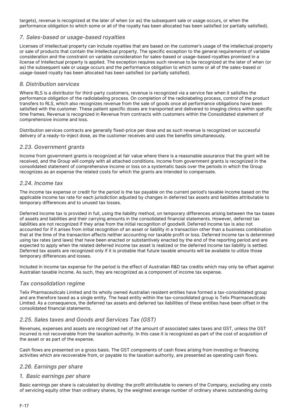 targets), revenue is recognized at the later of when (or as) the subsequent sale or usage occurs, or when the performance obligation to which some or all of the royalty has been allocated has been satisfied (or partially satisfied). 7. Sales-based or usage-based royalties Licenses of intellectual property can include royalties that are based on the customer’s usage of the intellectual property or sale of products that contain the intellectual property. The specific exception to the general requirements of variable consideration and the constraint on variable consideration for sales-based or usage-based royalties promised in a license of intellectual property is applied. The exception requires such revenue to be recognized at the later of when (or as) the subsequent sale or usage occurs and the performance obligation to which some or all of the sales-based or usage-based royalty has been allocated has been satisfied (or partially satisfied). 8. Distribution services Where RLS is a distributor for third-party customers, revenue is recognized via a service fee when it satisfies the performance obligation of the radiolabeling process. On completion of the radiolabeling process, control of the product transfers to RLS, which also recognizes revenue from the sale of goods once all performance obligations have been satisfied with the customer. These patient specific doses are transported and delivered to imaging clinics within specific time frames. Revenue is recognized in Revenue from contracts with customers within the Consolidated statement of comprehensive income and loss. Distribution services contracts are generally fixed-price per dose and as such revenue is recognized on successful delivery of a ready-to-inject dose, as the customer receives and uses the benefits simultaneously. 2.23. Government grants Income from government grants is recognized at fair value where there is a reasonable assurance that the grant will be received, and the Group will comply with all attached conditions. Income from government grants is recognized in the consolidated statement of comprehensive income or loss on a systematic basis over the periods in which the Group recognizes as an expense the related costs for which the grants are intended to compensate. 2.24. Income tax The income tax expense or credit for the period is the tax payable on the current period’s taxable income based on the applicable income tax rate for each jurisdiction adjusted by changes in deferred tax assets and liabilities attributable to temporary differences and to unused tax losses. Deferred income tax is provided in full, using the liability method, on temporary differences arising between the tax bases of assets and liabilities and their carrying amounts in the consolidated financial statements. However, deferred tax liabilities are not recognized if they arise from the initial recognition of goodwill. Deferred income tax is also not accounted for if it arises from initial recognition of an asset or liability in a transaction other than a business combination that at the time of the transaction affects neither accounting nor taxable profit or loss. Deferred income tax is determined using tax rates (and laws) that have been enacted or substantively enacted by the end of the reporting period and are expected to apply when the related deferred income tax asset is realized or the deferred income tax liability is settled. Deferred tax assets are recognized only if it is probable that future taxable amounts will be available to utilize those temporary differences and losses. Included in income tax expense for the period is the effect of Australian R&D tax credits which may only be offset against Australian taxable income. As such, they are recognized as a component of income tax expense. Tax consolidation regime Telix Pharmaceuticals Limited and its wholly owned Australian resident entities have formed a tax-consolidated group and are therefore taxed as a single entity. The head entity within the tax-consolidated group is Telix Pharmaceuticals Limited. As a consequence, the deferred tax assets and deferred tax liabilities of these entities have been offset in the consolidated financial statements. 2.25. Sales taxes and Goods and Services Tax (GST) Revenues, expenses and assets are recognized net of the amount of associated sales taxes and GST, unless the GST incurred is not recoverable from the taxation authority. In this case it is recognized as part of the cost of acquisition of the asset or as part of the expense. Cash flows are presented on a gross basis. The GST components of cash flows arising from investing or financing activities which are recoverable from, or payable to the taxation authority, are presented as operating cash flows. 2.26. Earnings per share 1. Basic earnings per share Basic earnings per share is calculated by dividing: the profit attributable to owners of the Company, excluding any costs of servicing equity other than ordinary shares, by the weighted average number of ordinary shares outstanding during F-17