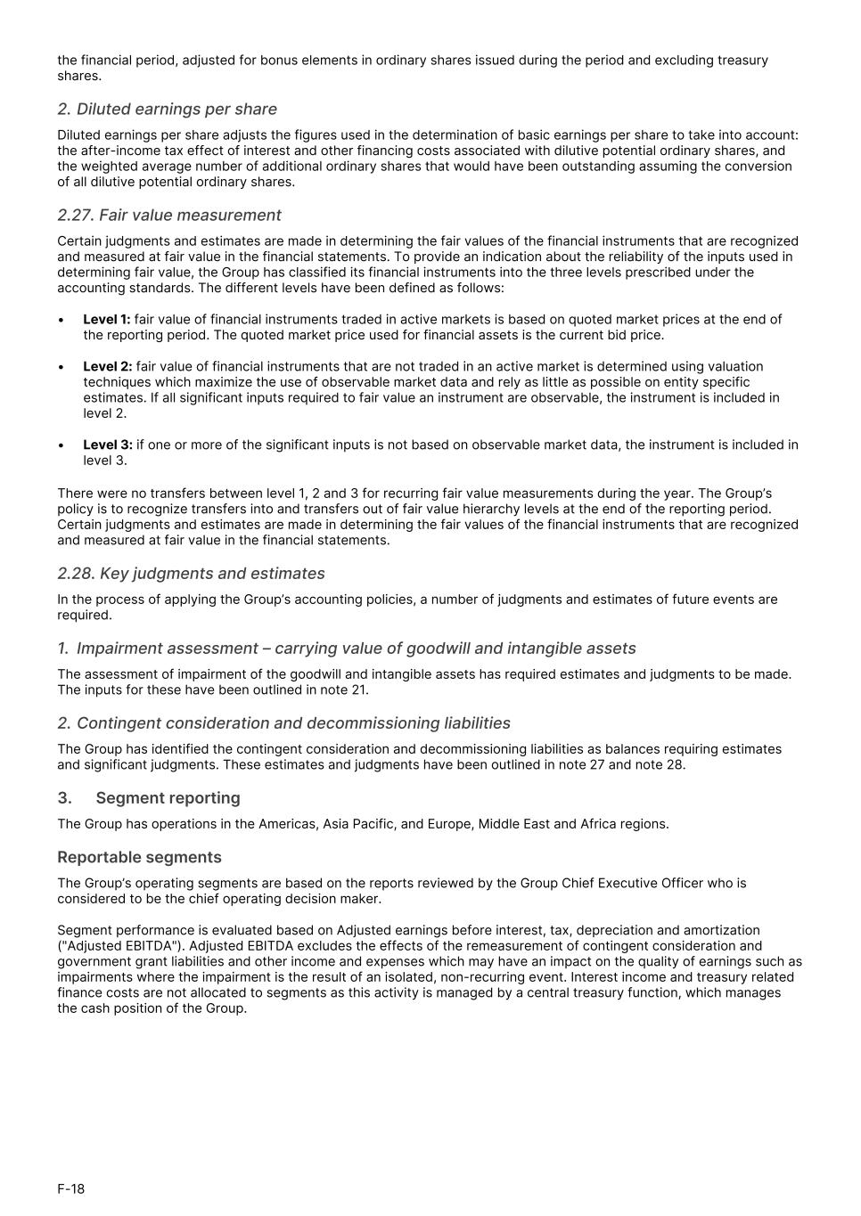 the financial period, adjusted for bonus elements in ordinary shares issued during the period and excluding treasury shares. 2. Diluted earnings per share Diluted earnings per share adjusts the figures used in the determination of basic earnings per share to take into account: the after-income tax effect of interest and other financing costs associated with dilutive potential ordinary shares, and the weighted average number of additional ordinary shares that would have been outstanding assuming the conversion of all dilutive potential ordinary shares. 2.27. Fair value measurement Certain judgments and estimates are made in determining the fair values of the financial instruments that are recognized and measured at fair value in the financial statements. To provide an indication about the reliability of the inputs used in determining fair value, the Group has classified its financial instruments into the three levels prescribed under the accounting standards. The different levels have been defined as follows: • Level 1: fair value of financial instruments traded in active markets is based on quoted market prices at the end of the reporting period. The quoted market price used for financial assets is the current bid price. • Level 2: fair value of financial instruments that are not traded in an active market is determined using valuation techniques which maximize the use of observable market data and rely as little as possible on entity specific estimates. If all significant inputs required to fair value an instrument are observable, the instrument is included in level 2. • Level 3: if one or more of the significant inputs is not based on observable market data, the instrument is included in level 3. There were no transfers between level 1, 2 and 3 for recurring fair value measurements during the year. The Group’s policy is to recognize transfers into and transfers out of fair value hierarchy levels at the end of the reporting period. Certain judgments and estimates are made in determining the fair values of the financial instruments that are recognized and measured at fair value in the financial statements. 2.28. Key judgments and estimates In the process of applying the Group’s accounting policies, a number of judgments and estimates of future events are required. 1. Impairment assessment – carrying value of goodwill and intangible assets The assessment of impairment of the goodwill and intangible assets has required estimates and judgments to be made. The inputs for these have been outlined in note 21. 2. Contingent consideration and decommissioning liabilities The Group has identified the contingent consideration and decommissioning liabilities as balances requiring estimates and significant judgments. These estimates and judgments have been outlined in note 27 and note 28. 3.      Segment reporting The Group has operations in the Americas, Asia Pacific, and Europe, Middle East and Africa regions. Reportable segments The Group’s operating segments are based on the reports reviewed by the Group Chief Executive Officer who is considered to be the chief operating decision maker. Segment performance is evaluated based on Adjusted earnings before interest, tax, depreciation and amortization ("Adjusted EBITDA"). Adjusted EBITDA excludes the effects of the remeasurement of contingent consideration and government grant liabilities and other income and expenses which may have an impact on the quality of earnings such as impairments where the impairment is the result of an isolated, non-recurring event. Interest income and treasury related finance costs are not allocated to segments as this activity is managed by a central treasury function, which manages the cash position of the Group. F-18